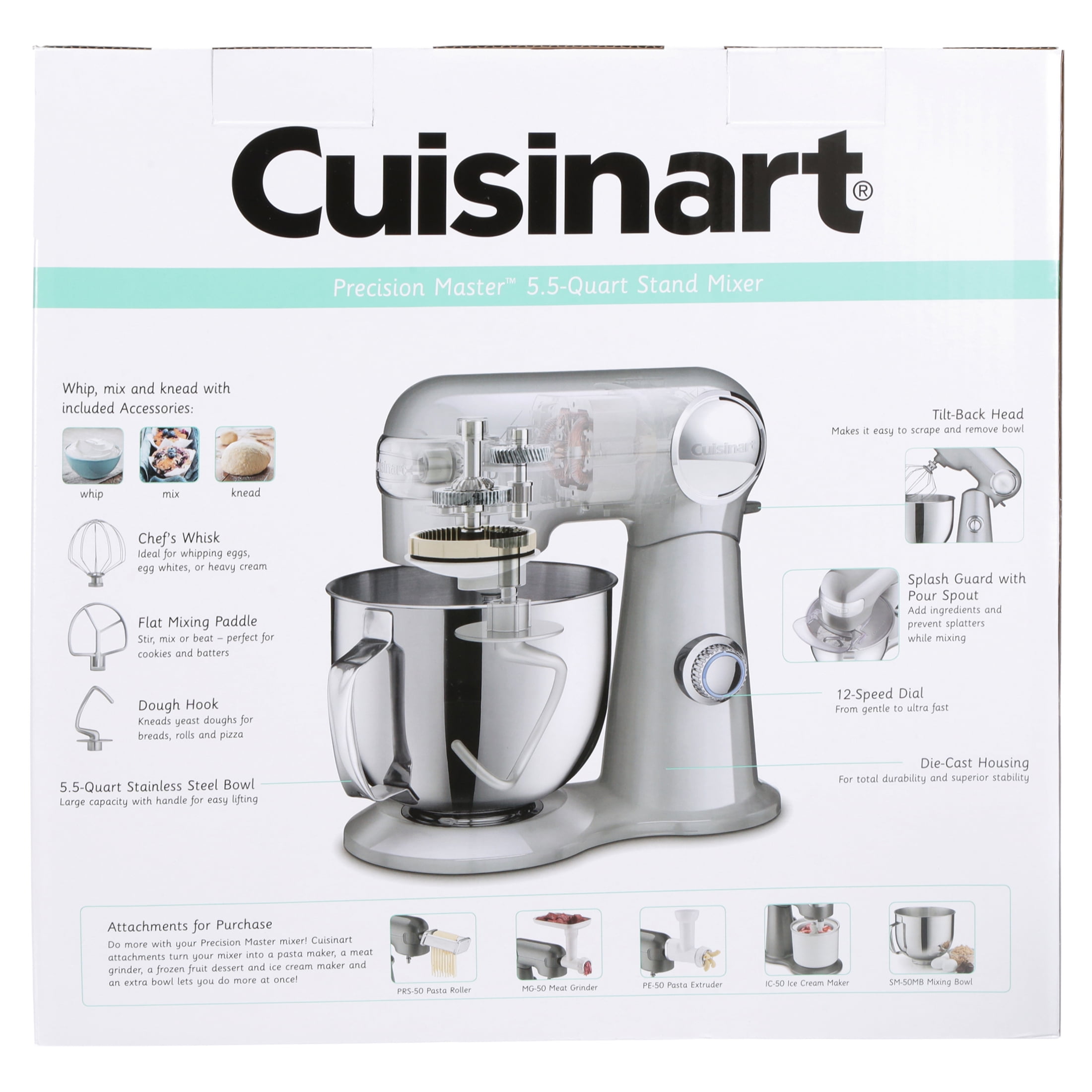 Generous Capacity: The large 5.5 qt stainless steel bowl provides ample space for mixing large batches and various recipes Powerful Motor: Equipped with a 500 watt motor, this mixer delivers efficient performance for thorough and consistent mixing Durable Construction: Constructed from sturdy die cast metal, ensuring long lasting durability and reliability for frequent use Versatile Speed Settings: Features 12 speeds for precise control, allowing you to mix, whip, and knead with accuracy for diverse culinary needs Convenient Design: The tilt back head design allows easy access to the bowl, and the included chef’s whisk, flat mixing paddle, dough hook, splash guard with pour spout, and power outlet for optional attachments enhance functionality and ease of use