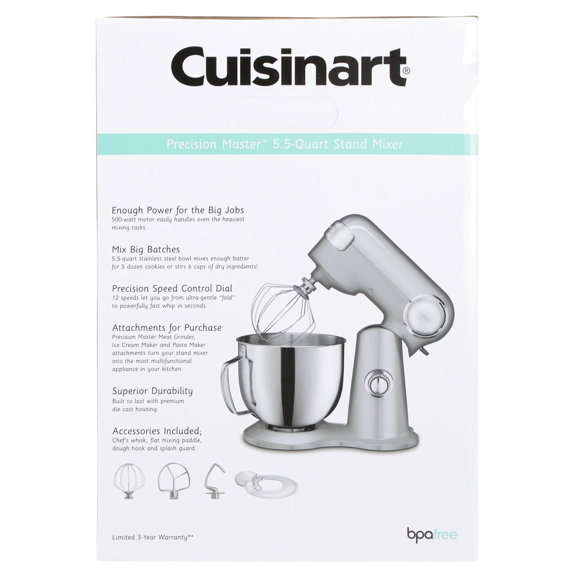 Cuisinart 5.5 Quart Stand Mixer, Brushed Chrome with Chef’s Whisk, Flat Mixing Paddle, Splash Guard