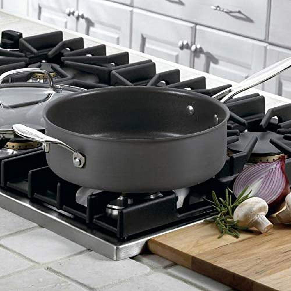 Quantanium non-stick cooking surface is metal utensil safe The hard-anodized exterior is harder than stainless steel for durability and professional performance; dense, non-porous, highly wear-resistant Solid stainless steel riveted cool grip handle is comfortable and designed for hanging storage Tempered, break-resistant glass cover