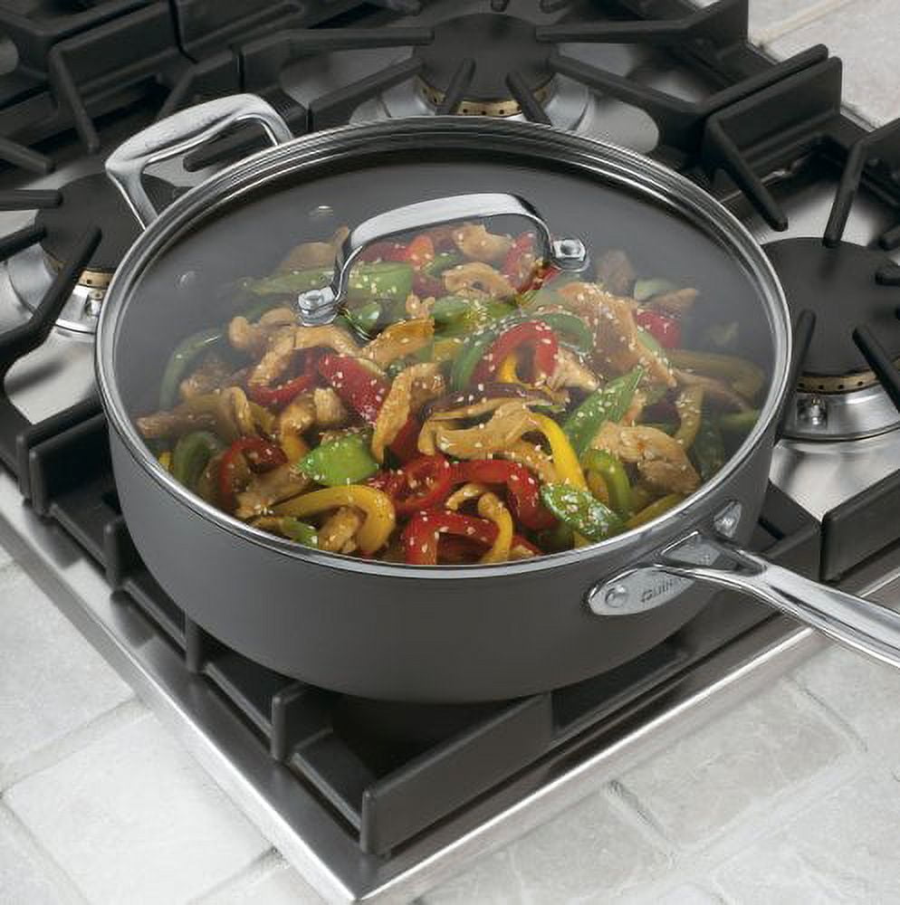 The Cuisinart 633-24H Chef’s Classic Non-Stick Hard Anodized 3.5-Quart Sauté Pan with Helper Handle and Cover has high, straight sides to maximize capacity. The versatile pan is ideal for lightly frying a variety of meats, poultry, or fish. A tight-fitting cover seals in moisture and nutrients, tenderly finishing the cooking process with healthier, more flavorful results. Solid stainless steel riveted handle stays cool on the stovetop with the helper handle providing extra support and balance when lifting and pouring. Metal utensil safe, the Quan Tanium non-stick cooking surface is reinforced with titanium for lasting food release, healthy cooking, and easy cleanup. Great for classic cooking techniques like sauteing, frying, browning, searing, and slowly simmering delicate sauces, this pan is constructed to last.