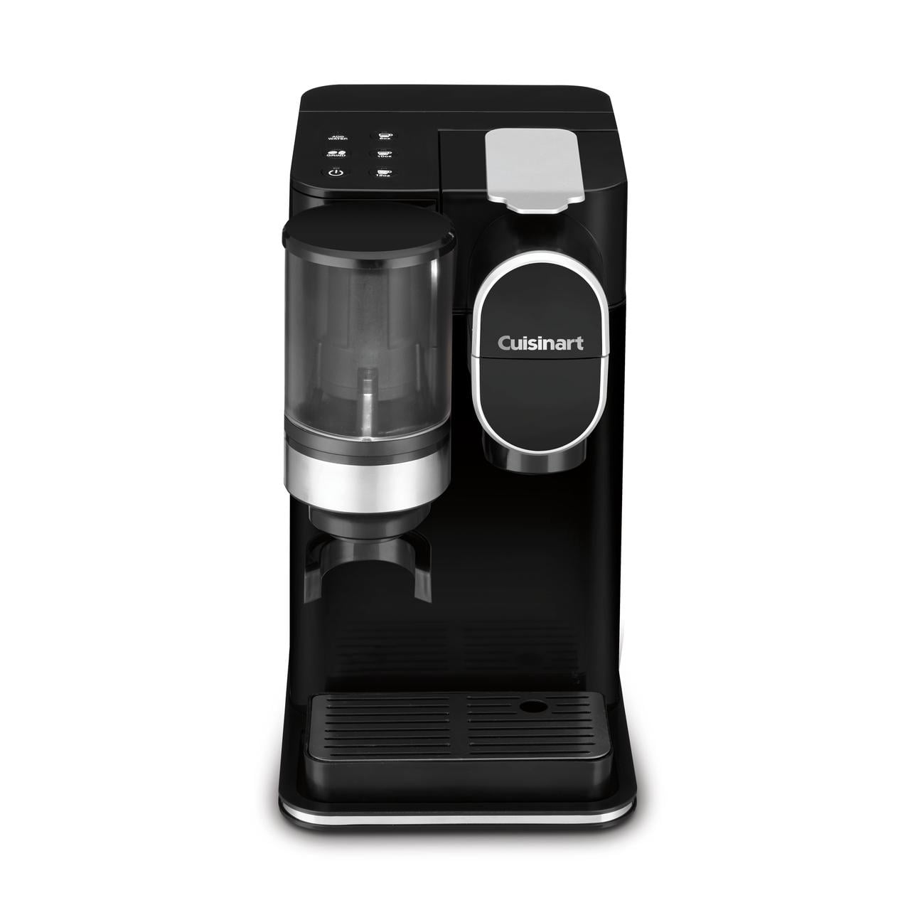 Brew a single serving with freshly ground beans or use your favorite pod Conical burr mill automatically grinds whole beans grinds directly into the HomeBarista Reusable Filter Cup Hopper holds 100g of beans, sealed lid keeps beans fresh Push button control for 3 beverage sizes: 8, 10, 12oz Includes Cuisinart ® HomeBarista ® Reusable Filter Cup which lets you use your own coffee Removable 48oz water reservoir Compatible with any single-cup pod, including Keurig ® K-Cup Removable drip tray for travel mugs Charcoal water filter Limited 3-year warranty