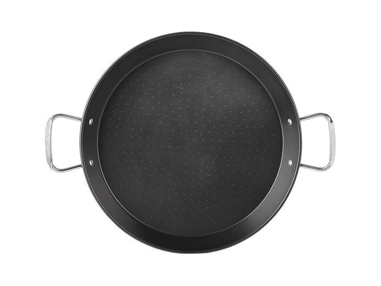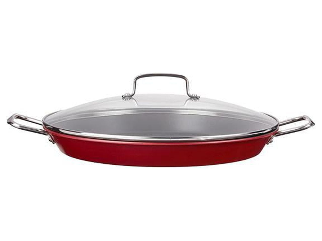 A favorite of cooks all over the world, the classic Spanish paella is a delicious as it is beautiful. Traditional design with flared sides and dimpled interior for ideal caramelized paella crust. Convenient non-stick interior and cover help to perfect any recipe! Steel construction provides quick and even heating Highly durable non-stick cooking surface for lasting food release and easy cleaning Oven safe to 400 degrees F. Glass lid is oven safe to 350 degrees F. Cook on stovetop or in oven Ergonomically designed stainless steel handles are contoured for a secure grip and riveted for strength and durability