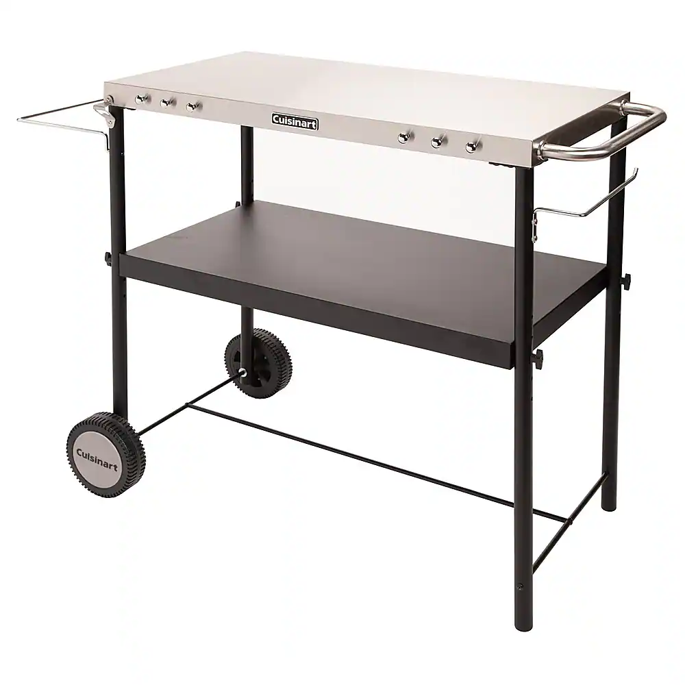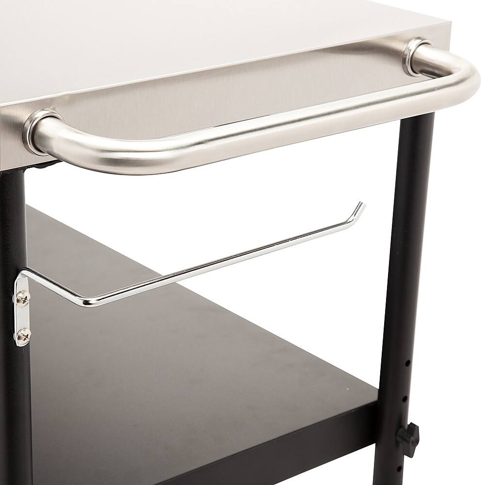 Expand your outdoor grill prep space with the Cuisinart Outdoor BBQ Prep Cart! Cut down on the trips to and from the kitchen by keeping all your BBQ essentials out by your grill or smoker. The prep table features a spacious 36″ x 18″ stainless steel work surface that offers plenty of space for prepping meats, fish, chicken, veggies, and so much more. Easily remove food scraps from the work surface by brushing them directly in to the garbage bag holder, which can accommodate up to 30 gallon size trash bags. The prep cart also comes equipped with a paper towel holder that can fit up to a jumbo roll of paper towels. The height adjustable shelf sits between 18-24″ inches off the ground, allowing you to position exactly where you need it. The shelf is perfect for holding plates, utensils, grill fuel like charcoal and wood pellets, as well as any other BBQ essentials you need by your grill or smoker. Keep up to 6 BBQ tools within quick reach by utilizing the tool hooks on the front of the work surface.