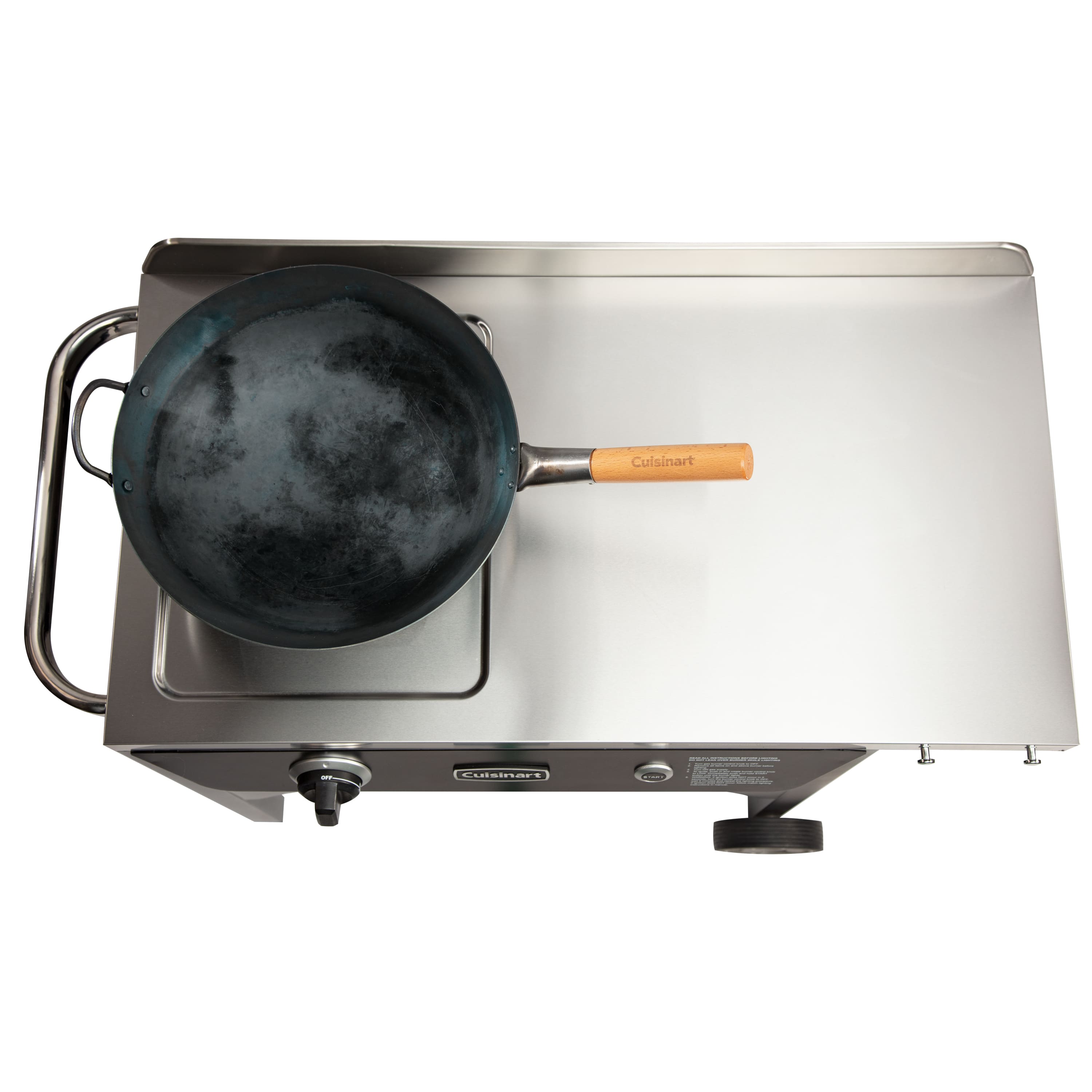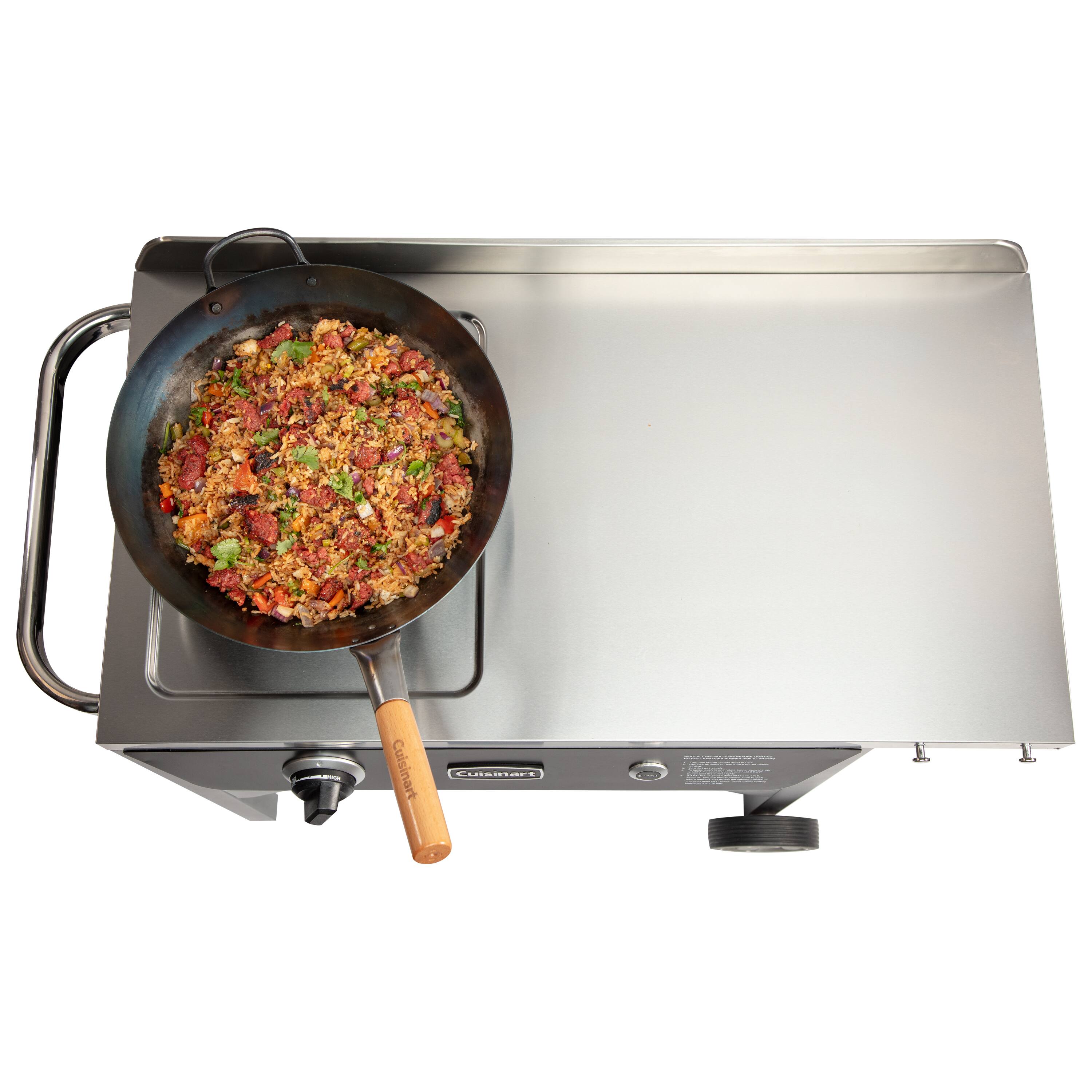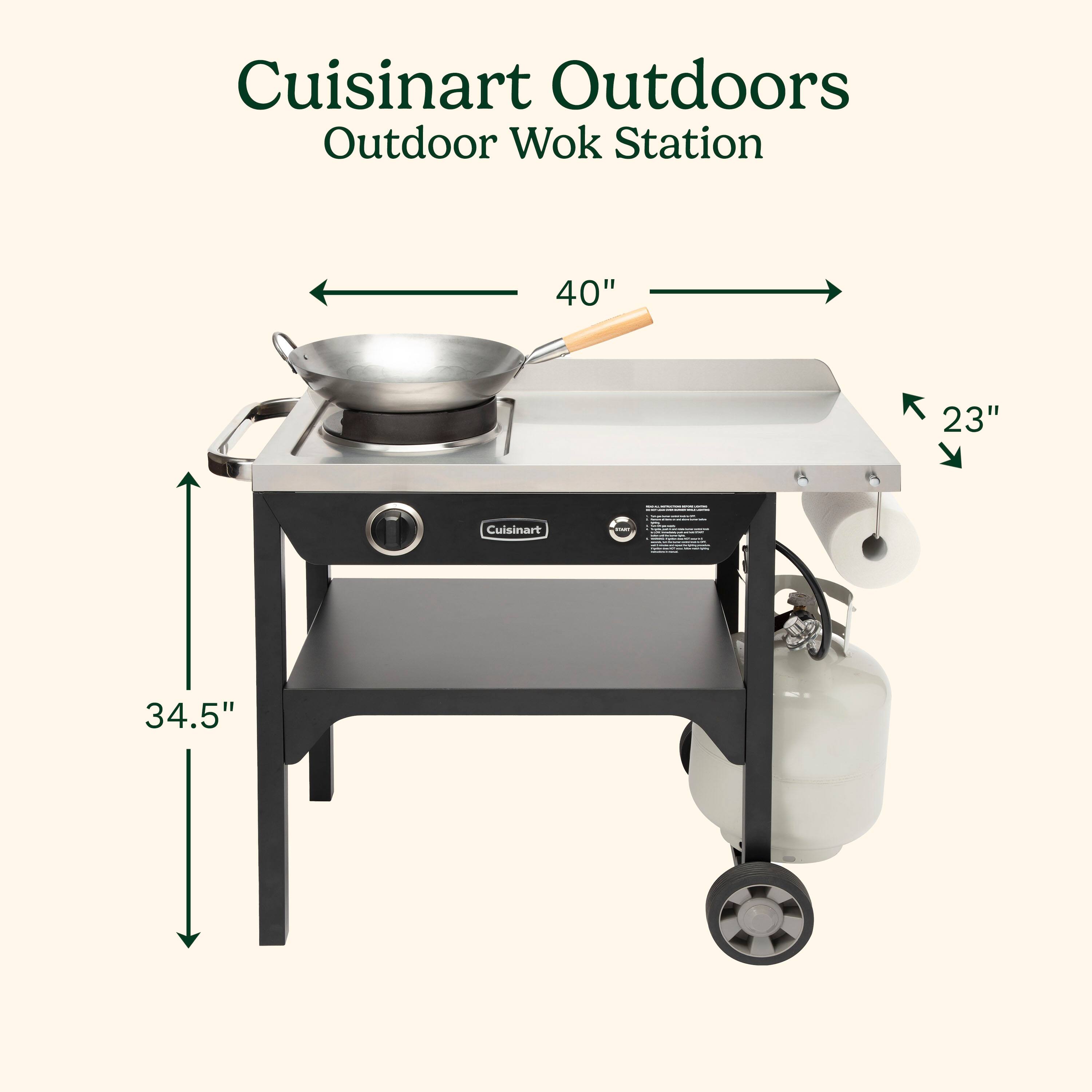 Wok This Way! Culinary versatility unleased outdoors. Create Fast, Fresh & Fabulous Meals in Minutes! Introducing the ultimate outdoor cooking solution, our NEW Outdoor Wok Station. The first and only cooking solution to brings indoor wok cooking to the outdoors. Elevate your outdoor culinary adventures with the best features designed to make wok cooking fun, quick and easy to use. We provide the premium 14” diameter hand-hammered carbon steel wok, complete with a contoured wooden handle for a comfortable grip that helps you to learn the Wok-Hei style. The durable carbon steel construction is perfect for deep seasoning, allowing a non-stick coating. Harness the power of our 50,000 BTUs burner system, featuring a patent-pending design with electronic START ignition for effortless operation. With precision heat control, our custom valve allows for a low start point, gradually increasing to high gas flow for maximum power. This professional-grade system DNA is found in commercial restaurants, guaranteeing exceptional results every time. Experience unparalleled control with our innovative electronic starter and haptic sensory dial systems. By hearing distinct clicks or feeling momentary resistance, you’ll intuitively adjust the burner power from low to high settings and back, ensuring perfect cooking temperatures for any dish. Crafted for convenience, our cooking station boasts a spacious stainless steel top that withstands high-heat temperatures and is easy to clean. A generous prep area of 21.75”W x 18.75”D, you’ll have plenty of space to prep ingredients or store essentials for your meal. Plus, the lower storage shelf provides additional room to keep prepared ingredients or dishes close at hand. From breakfast to lunch to dinner, our wok station offers unrivaled cooking versatility. Whether you’re whipping up scrambled eggs, flipping pancakes, stir-fry, shrimp scampi, or Generals Tso’s chicken the possibilities are endless. Designed for ease of use, our wok station features large rear wheels and solid front legs for stability, allowing you to maneuver effortlessly. An integrated 20 lb. propane tank holder ensures uninterrupted cooking sessions, a convenient paper towel holder and integrated handle make transportation a breeze. Elevate your outdoor cooking experience with our Outdoor Wok Station. Premium features and unparalleled performance, it’s time to take your outdoor culinary skills to new heights. Get Social with Us @cuisinartoutdoors.