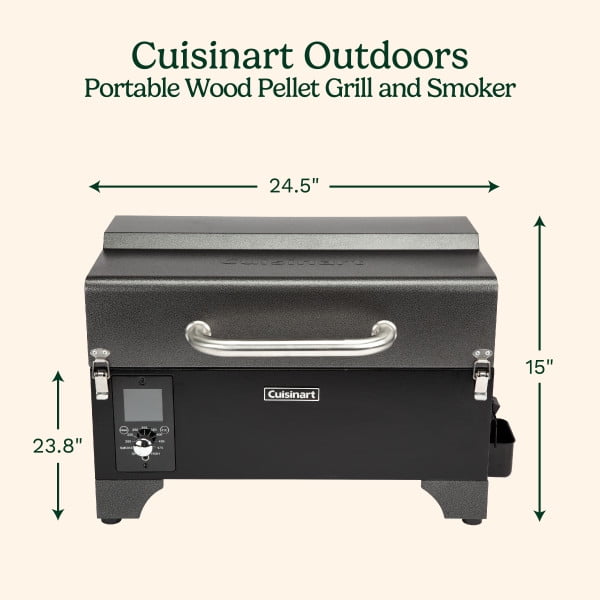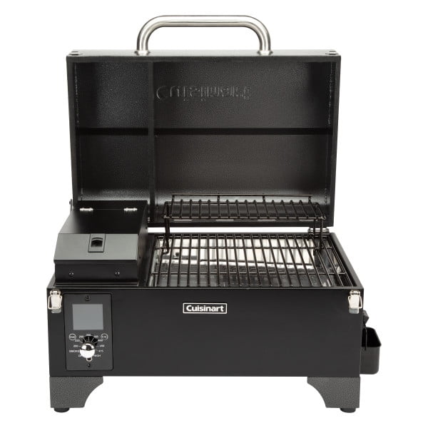 Cuisinart portable wood pellet grill 8 cooking capabilities: smoke, BBQ, grill, roast, sear, braise, bake, and char-grill 256 sq. in. of cooking space, with an integrated Sear Zone Lightweight design at 45 lbs makes for easy portability Locking lid with handle makes it easy to take anywhere With a wide temperature range from 180F to 500F, the digital control automatically adds pellets as needed to regulate the temperature Electronic auto-start ignition, digital auto temperature control and real-time PID temperature display