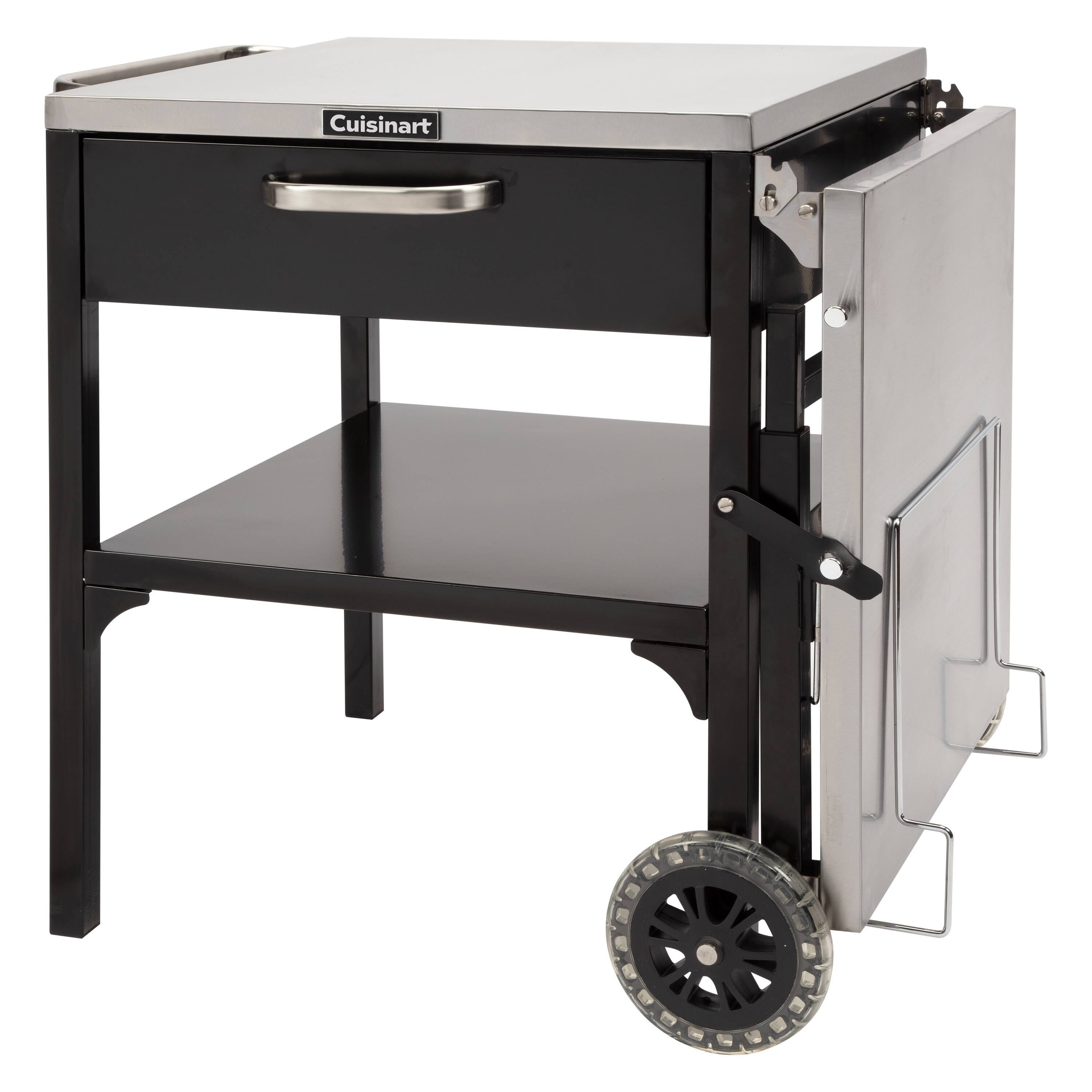 The Cuisinart Prep ‘n Cook Outdoor Table & Grill Stand allows you to seamlessly move from food prep to cooking while using your portable grill. The Prep ‘n Cook stainless steel table top measures 48″ x 24″. One half of the table will fit most portable grills, griddles, and pizza ovens. The other half offers a spacious area for food prepping and serving. The front of the table features a hide-away condiment caddy, giving you extra room to store all of your sauces and spices. To keep your work surface clean, the garbage bag holder allows you to easily dispose of foods scraps as you go. When you’re finished cooking, wipe the surface clean for next time with the integrated paper towel holder. The prep half of the table folds down and the unit can be easily rolled away for storage.