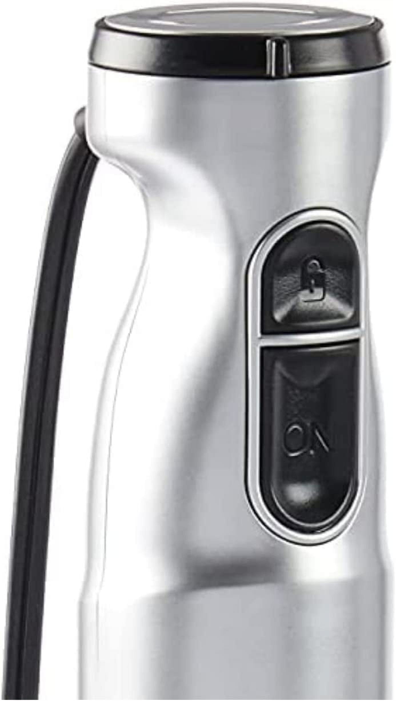 300-watt motor Powerful & quiet DC motor 2-speed slide control for every blending task Stick design reaches into pots, pitchers and bowls 8-inch Stainless steel blending shaft Ergonomically designed grip Lock/Unlock button 3 -cup (24 oz.) mixing cup Limited 3-year warranty