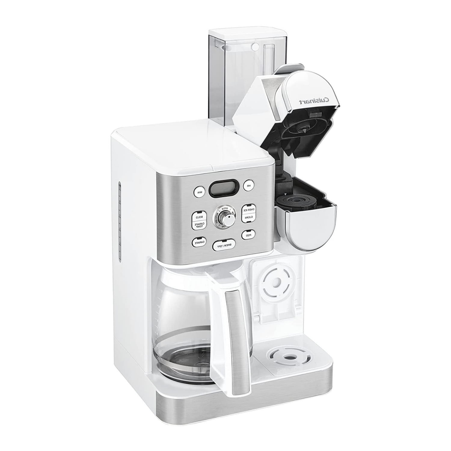 Get your coffee your way with the Cuisinart 2-in-1 Coffee Center Combo Coffee Maker. This kitchen essential for coffee lovers takes home brewing to another level by combining a 12-cup carafe and single-serve options in one convenient unit. Fast Brew This coffee maker can brew a full pot 25 percent faster with Extreme Brew technology. Settings You can customize when and how you want your coffee with an advanced start, 24-hour brew start, brew pause, temperature control, auto-off, adjustable carafe temperature, ready tone alert, and bold flavor settings. Compatibility Instantly brew a single serving of hot coffee in 5-cup sizes with any pod, including Keurig K-Cup, or the reusable HomeBarista filter, or brew over ice for delicious coffee that refreshes.