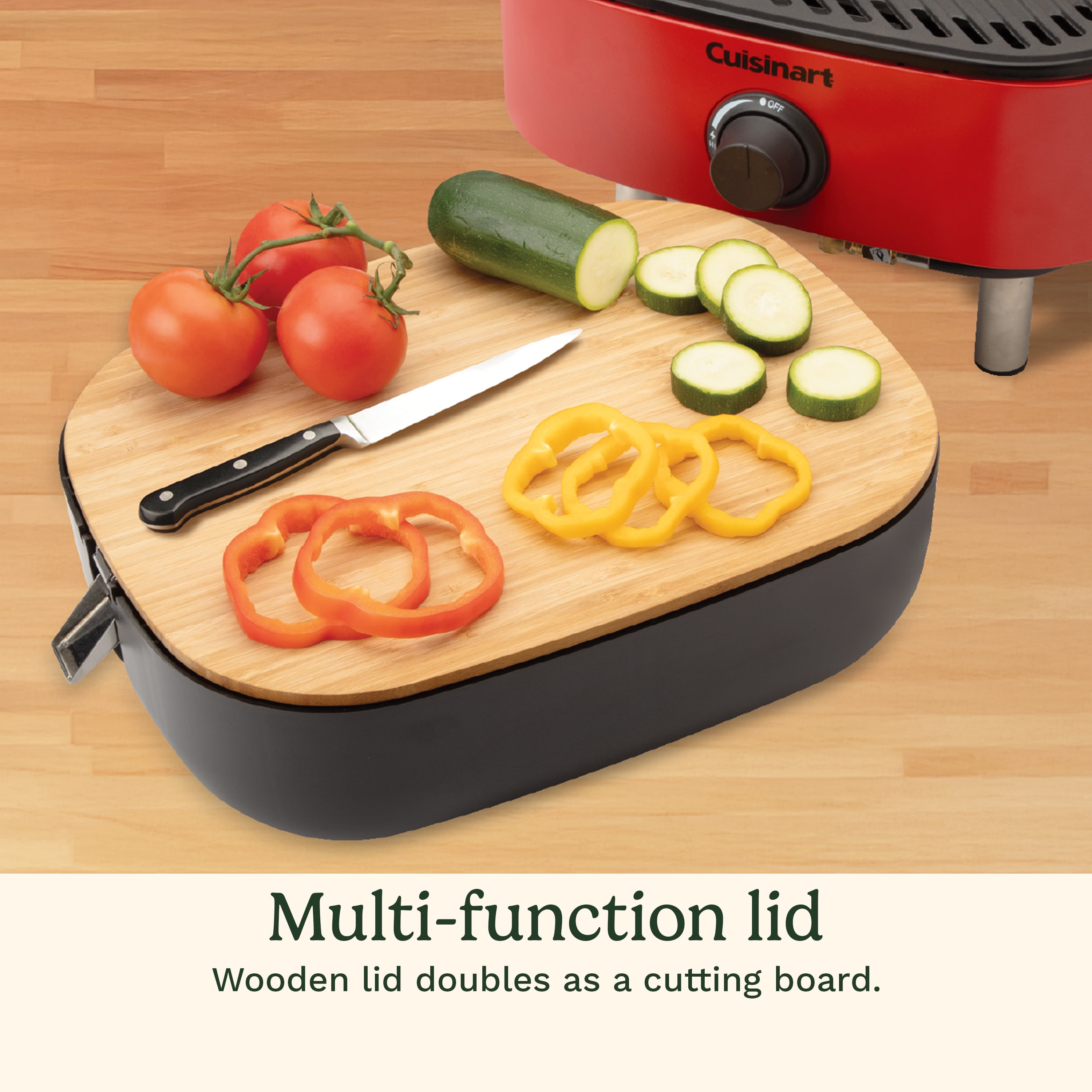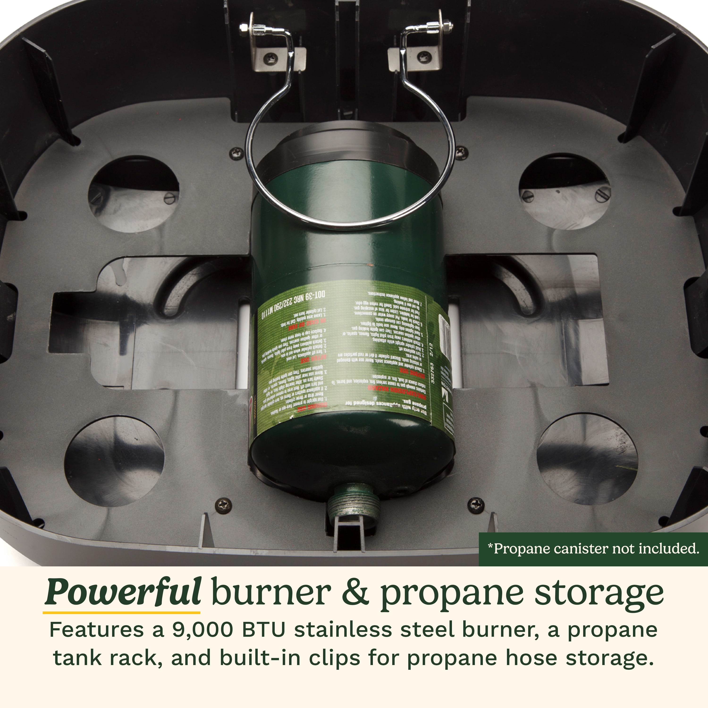 PORTABLE: The stack ‘n go design with a rubberized comfort-grip handle makes it easy to carry, store, and set up anywhere. Never grill without a prep area again! MULTI-FUNCTION LID: The stylish wooden lid doubles as a cutting board, allowing you to prep ingredients or serve appetizers with ease. COOKING SURFACE: The 154 sq. in. porcelain-enameled cast iron grates offer superior heat retention and even cooking, perfect for grilling on the go. PROPANE STORAGE: A flip-out propane tank rack keeps your 1 lb. propane tank stable, while built-in clips store the propane hose neatly. 1lb. tank can be stored inside the base when not in use. POWERFUL BURNER: A high-performance burner with twist-to-start electronic ignition provides quick, reliable heat control for perfect grilling results.