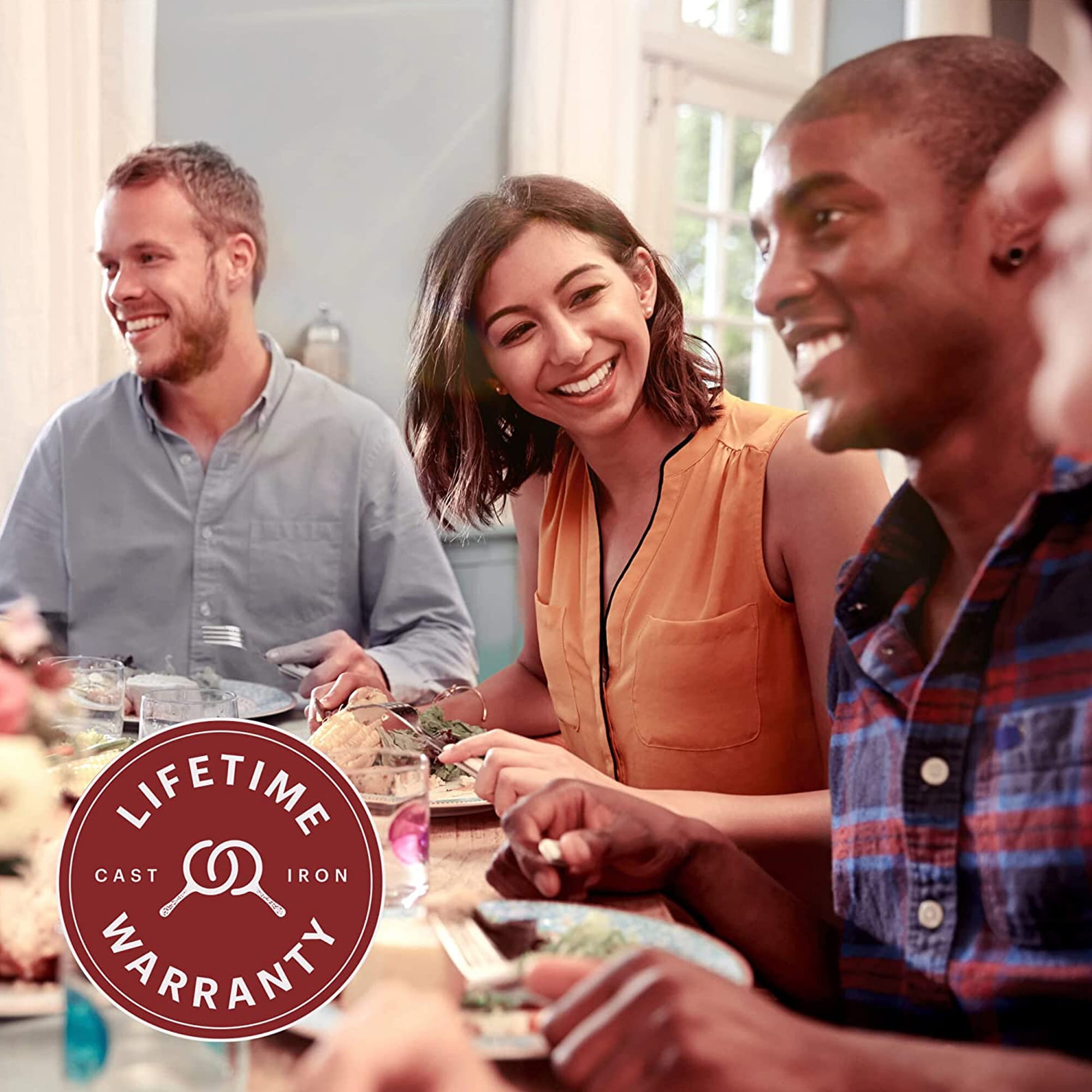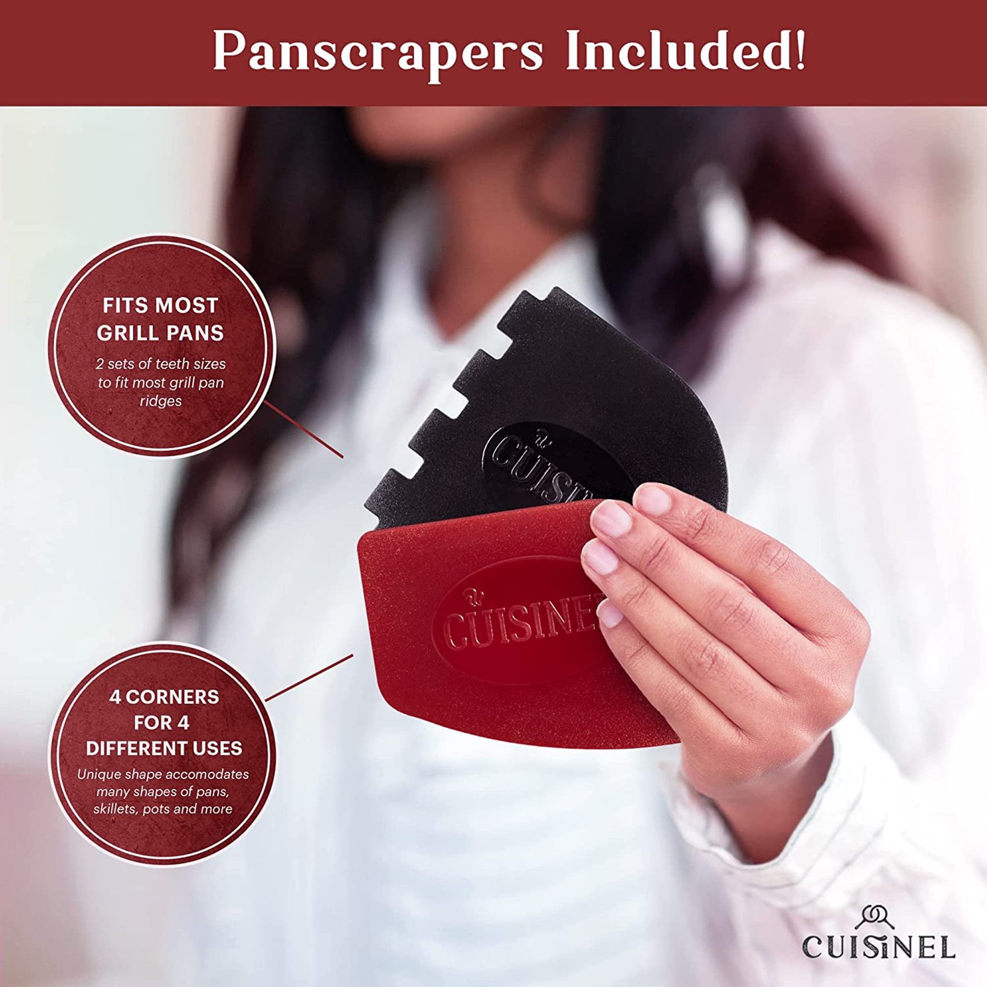No more limiting your cooking options. Get your hands on our reversible cast iron griddle grill combo that can cook classic grill steak on its ribbed side as well as allow all sorts of cooking from bacon, eggs, and burgers to kebabs, and even tortillas on the smooth side. Plus, with the included spiral-designed, easy to handle grill press, you can be sure you’re getting maximum contact between your food and the hot cooking surface for the perfect sear on all your foods. With our reversible cast iron griddle and grill, you can have the freedom to get creative with your cooking. This kitchen cookware set allows you to explore various cooking techniques like frying, baking, grilling, broiling, braising, and saute´ing for delicious results. Unlock a variety of delicious possibilities with Cuisinel Reversible Cast Iron Griddle Grill Set. With even-heat technology, our versatile reversible cast iron grill griddle can be used on any heat source, even an open camping fire without any cool spots. The lossless heat retention and superior heat distribution of our griddle pan makes managing your cooking times effortless. So whether you’re grilling up a burger or crisping your vegetables, you’ll be able to do it quickly and with confidence that your meal will turn out delicious. Our reversible iron pan is made with solid cast iron and is crafted to last for generations. This kitchen cookware features comfortable handles for a secure grip as well as oil drips on both sides for a more health-conscious option. It’s crafted to fit on two stove burners or any open flame, and is suitable for any outdoor grill, stovetop, induction stovetop, and oven. After every use, the cast iron pan should be hand washed, dried thoroughly on the stovetop at medium heat and seasoned with natural oils. Do not put in the dishwasher and do not air dry. Easily clean those stubborn food bits that may lodge in your cast iron cookware with the pan scraper that is included in the set. With its perfect grip indentation, non-slip texture and unassuming profile, there are endless possible uses for these scrapers. Take your cooking to the next level and make perfect meals with Cuisinel Reversible Cast Iron Griddle Grill Set. Add this to your cart today.