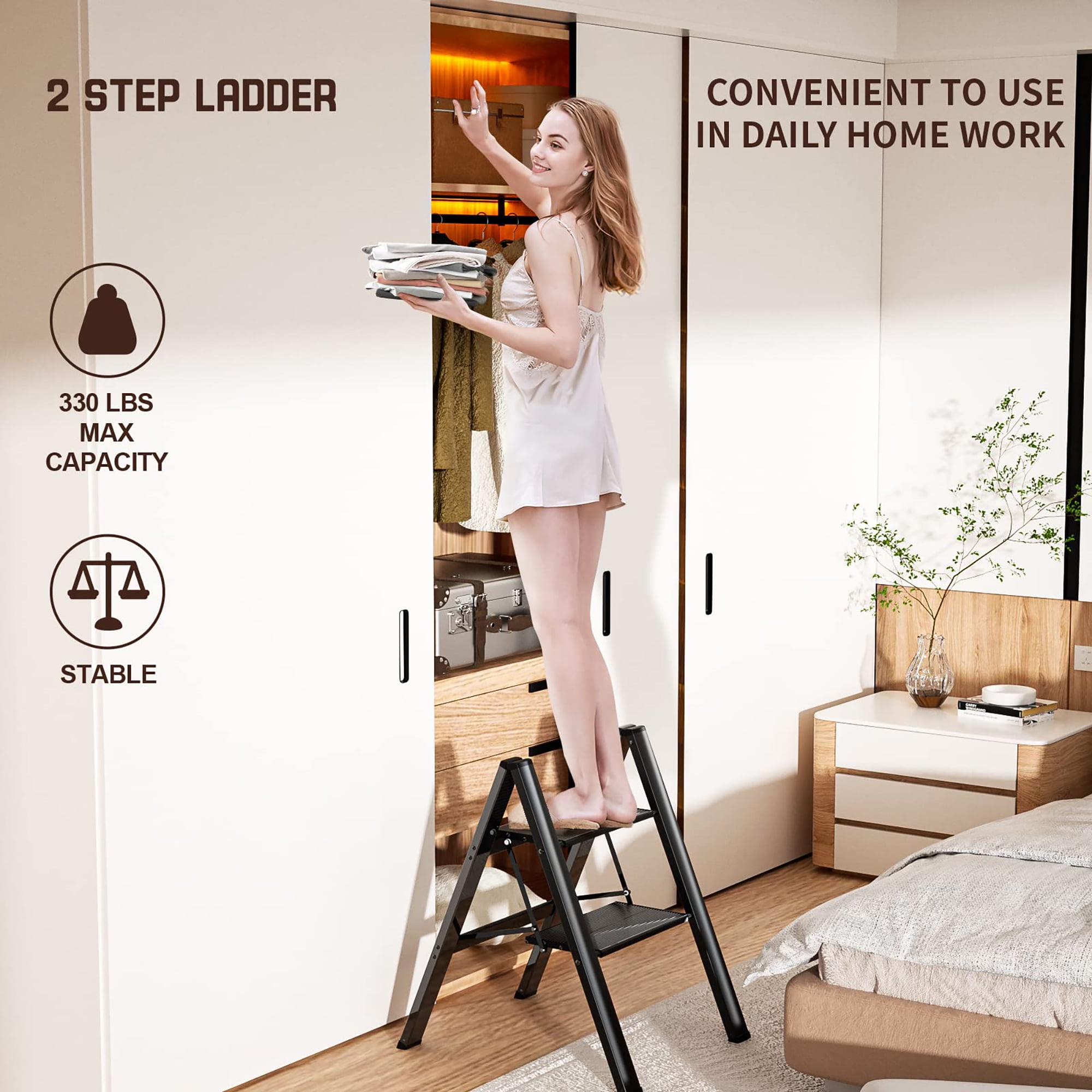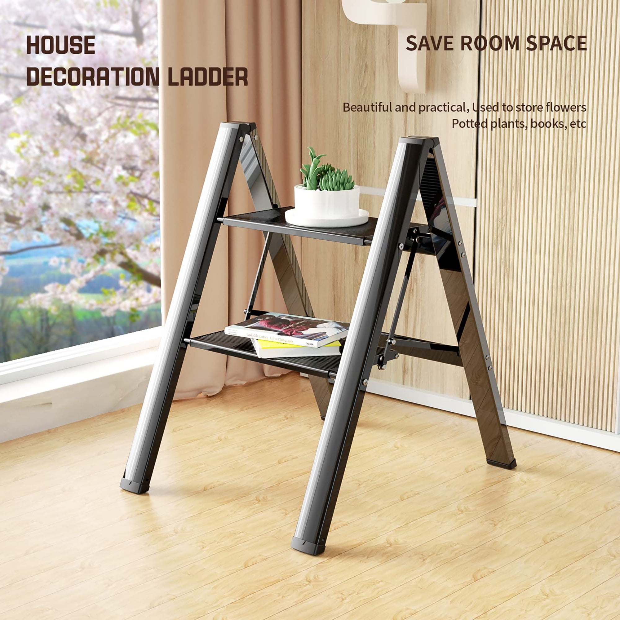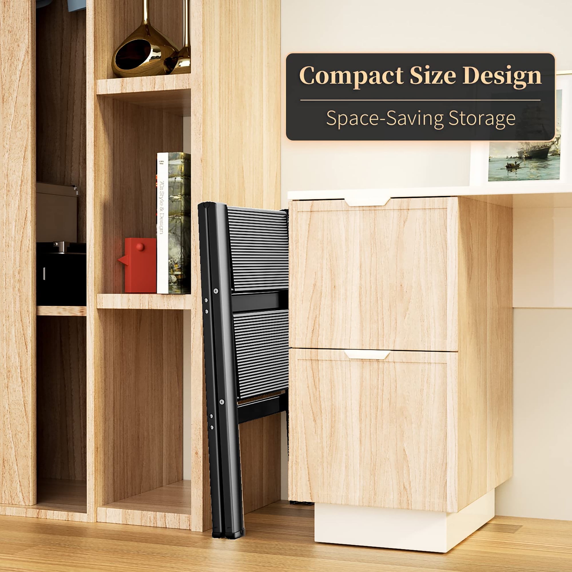 Security & Stability – The sturdy folding ladder is made of thickened aviation-grade stainless aluminum alloy. Its surface has been treated specially to make stair ladder wear-resistant and rust-proof. The side-crossed structure strengthens the frame, making you feel safer and stabler when using our safety ladder(even on the top pedal, or used by the elderly and kids). Maximum Load: 330 lbs. Non-slip & Wide Pedal – Platform ladder is suitable for all kinds of floors. To ensure maximum safety during operation, the size of thickened pedals is enlarged to 6.89″ W* 12.4″ L. Wide and thick pedals with raised lines effectively prevent slipping. Big non-slip feet fully touch the ground to keep steady and prevent the floor from being scratched. Muti-purpose Ladder – Step ladder is a great RV steps ladder, truck step ladder, and pantry ladder! Ideal for home, kitchen, bedroom, garage, high shelves, and closets. With an attractive appearance, it also can be a decorative ladder, like a bookshelf, flower stand, library ladder, etc. Besides, our indoor ladder can be used as a kitchen step stool for kids and adults. Ultra Lightweight & Size – Our portable ladder made of aluminum is more lightweight than an iron step ladder, so easy to carry and move. The bottom parts of its feet adopt rubber material, and there is no noise when moving it. Unfolded: 24″ L×21.65″ W×17.9″ H, Folded: 26″ L×2″ W×17.72″ H. Net Weight: 5.29 lbs. Foldable & Space-saving – Our folding ladder comes fully assembled. Stepladders can be easily opened and folded. After folding, the stepper ladder is just 2″ wide for convenient storage and transportation, ideal for indoor or outdoor use. When idle, it can be folded compactly to fit narrow places, such as against a wall, cabinet, corner, or under a bed.