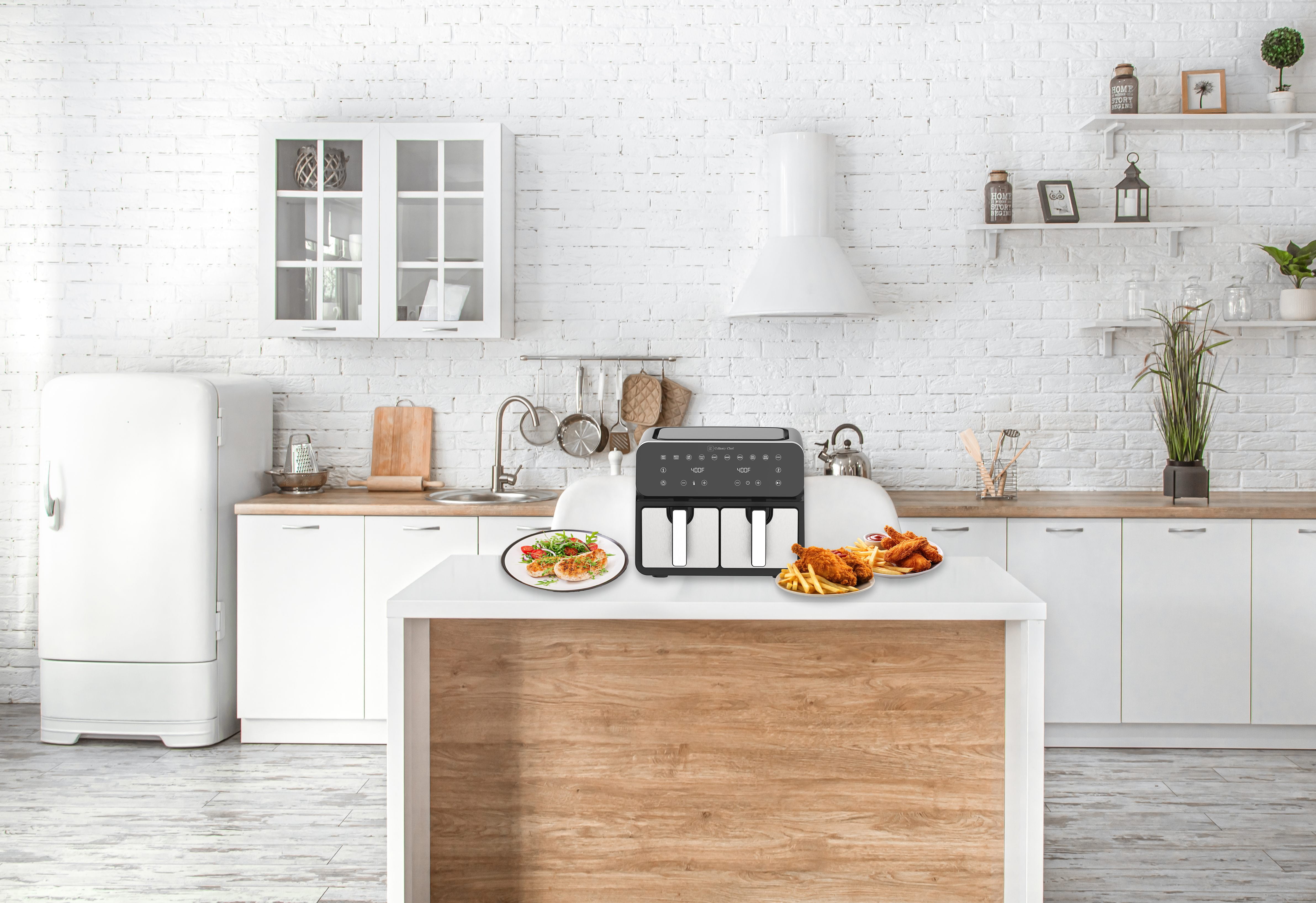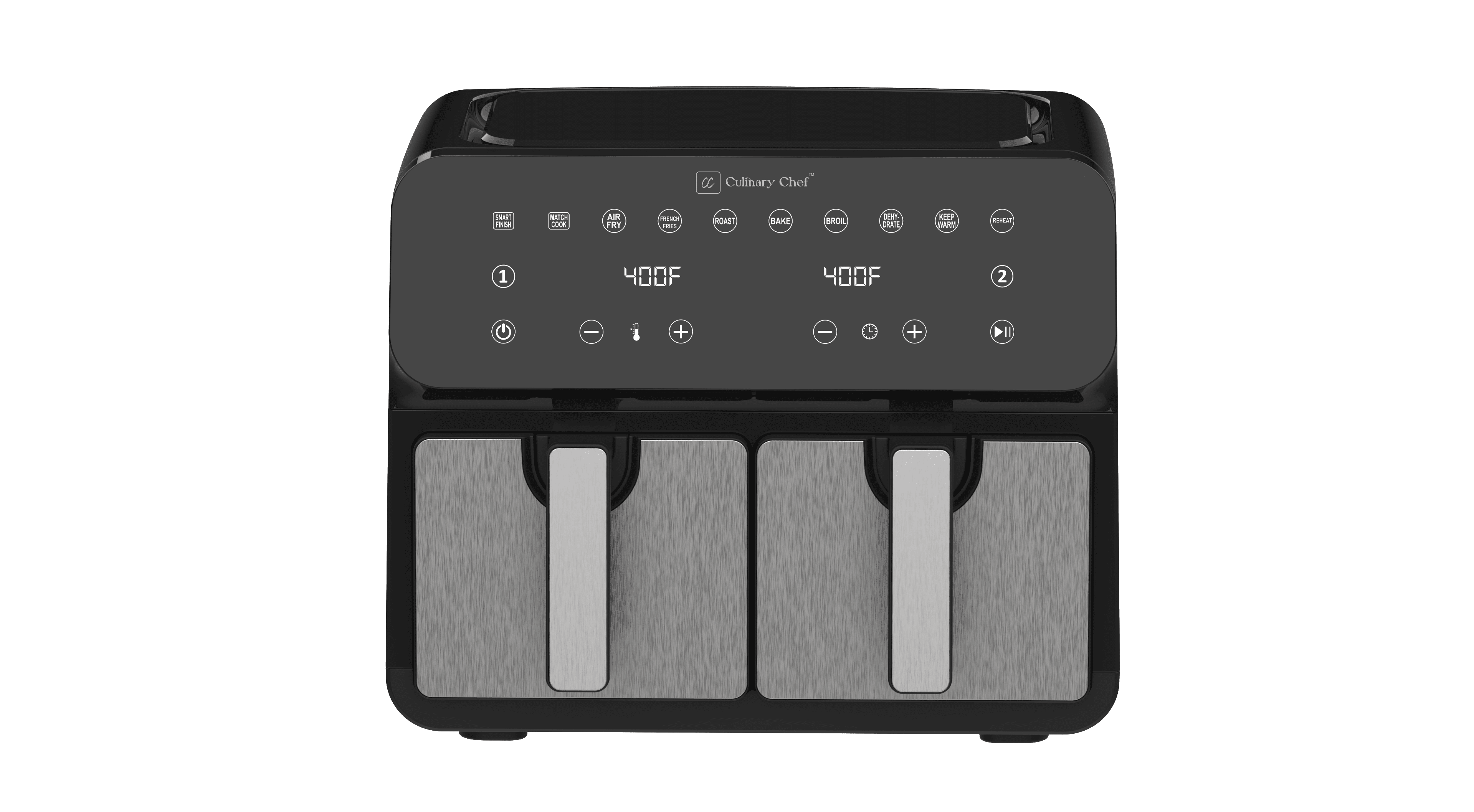 Culinary Chef 9.5 QT. Dual Basket Air Fryer – Stainless Steel (Model CCAF904) Elevate your cooking with the Culinary Chef Dual Basket Air Fryer, featuring a generous 9.5 QT capacity (2 x 4.75 QT baskets) for simultaneous cooking of multiple dishes. The stainless steel accents ensure durability, while the dual cooking zones offer independent temperature and timer settings for versatile meal preparation. With 8 one-touch presets, a user-friendly touch panel, and a powerful 1700W performance, this air fryer guarantees quick and consistent results. Enjoy added safety with the auto shut-off feature and easy cleanup with the non-stick, dishwasher-safe parts. The innovative 360-degree technology delivers even, crispy results with minimal oil.