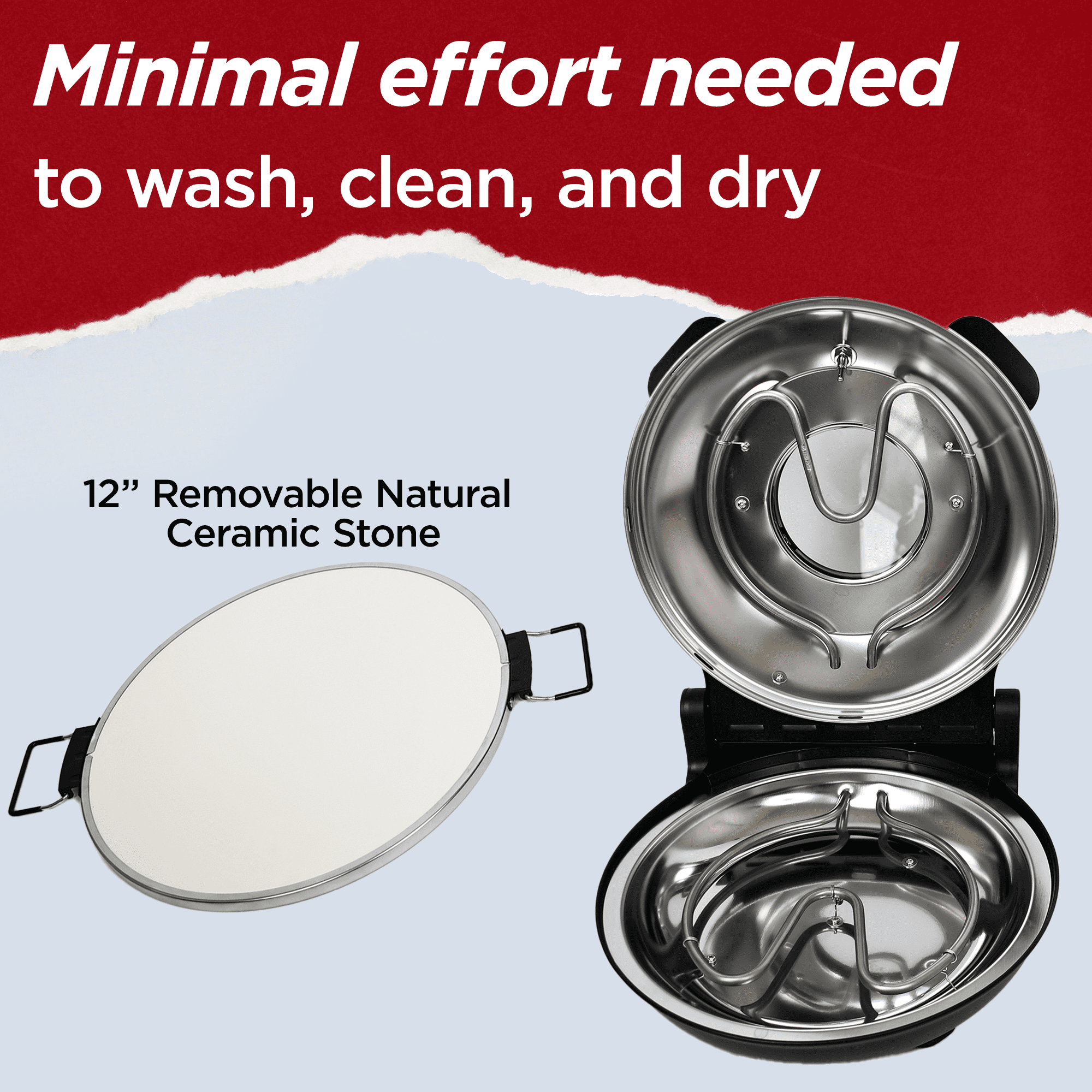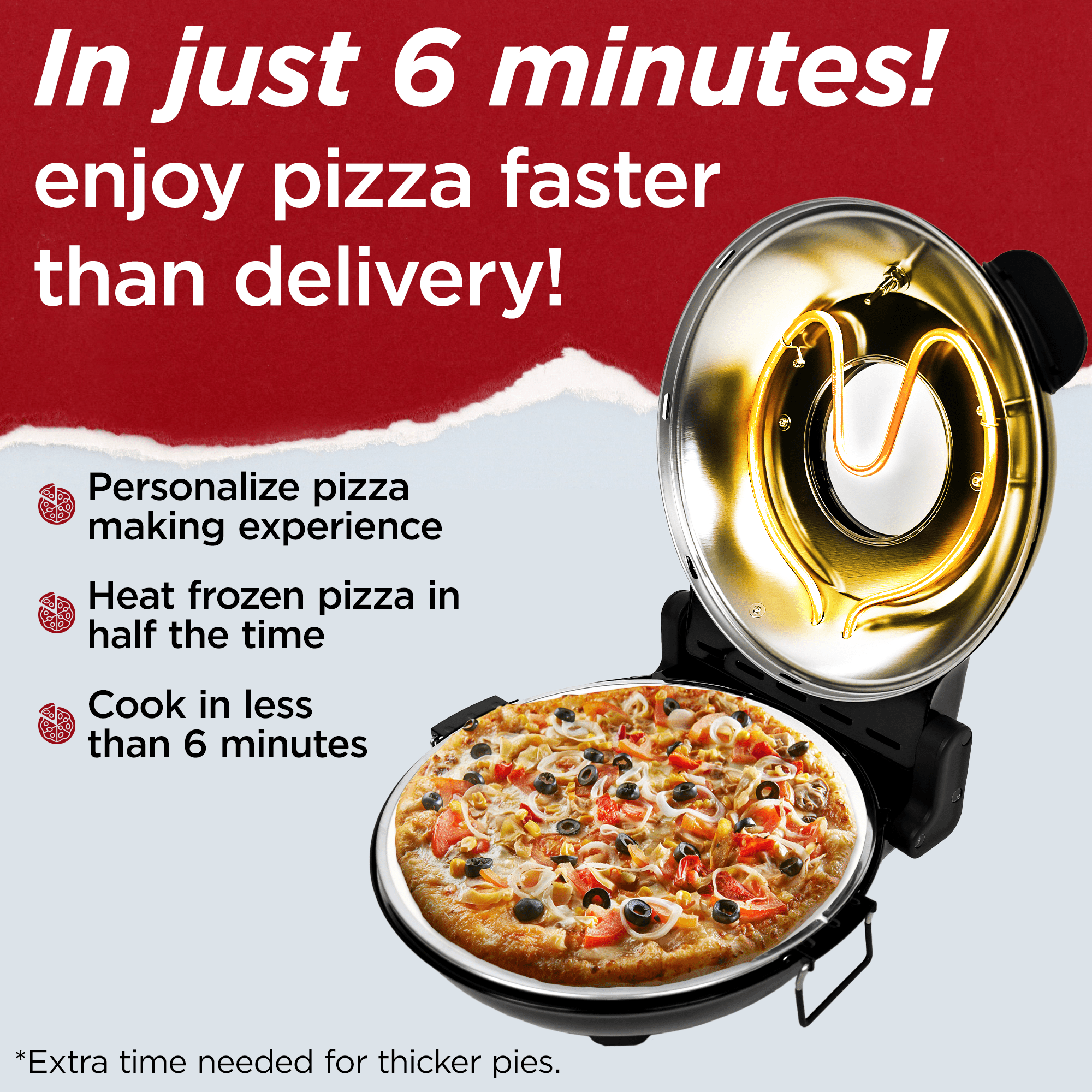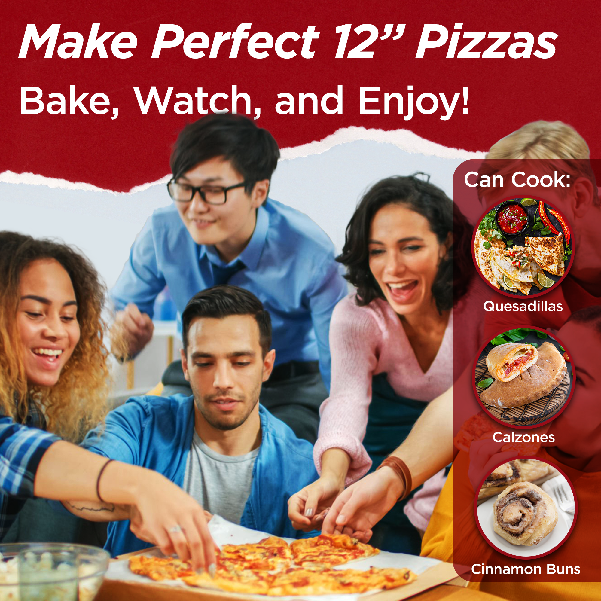 Product Details: Electric Pizza Oven (12”) Includes Ceramic Pizza Stone Reaches Up to 800°F in 6 Minutes Large Capacity Size Convenient Viewing Window Adjustable Heat Control Color: Black Dimensions: 13.4” x 13.0” x 6.5” Modern Indoor Pizza Oven – A must for pizza lovers this small pizza oven lets you create fresh, homemade deep dish, thin crust, or hand-tossed pizza in minutes! Stone-Baked Deliciousness – Our pizza oven indoor unit includes a natural ceramic pizza stone that ensures even distribution for a crispy, crunchy crust you’ll love. Rapid Baking Process – Complete with an oven pizza stone this unit reaches up to 800°F in just 6 minutes to let you start creating a cheesy, crispy pizza effortlessly. See-Through Viewing Window – This portable pizza oven boasts a clear top window to help you monitor your pizza’s cooking progress to ensure great-tasting results. Ultra-Portable and Compact – Small enough to fit on your kitchen counter or even take with you in your RV this pizza oven rack is lightweight, powerful, and portable. Precision Cooking Accuracy – Far more accurate than an outdoor wood fired pizza oven this oven features a thermostat control with 1200 watts of reliable power. Bigger, Shareable Pizzas – Our large capacity pizza stone can make pizzas up to 12” in size which means you can create personal pan pizzas or large pizzas for the family. Easy-to-Clean Pizza Stone – The included ceramic stone can be removed after you’re done cooking to make it easier to wash, clean, and dry it with minimal effort. Adjustable Heat Control – This pizza oven lets you control the top and bottom heat settings to create a more even bake, so you can melt the cheese and crisp the crust. Small, Convenient Size – At just 13.4” in diameter these small pizza ovens can easily fit on your kitchen counter without taking up valuable room for other appliances.