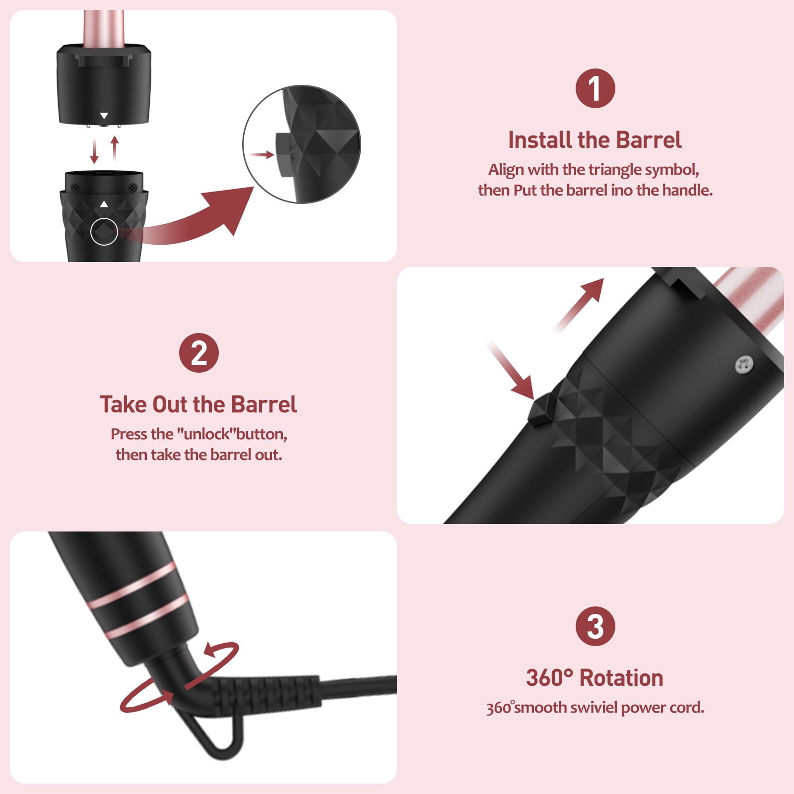 5 in 1 Professional Curling Wand Set 1 x Curling Wand Handle 5 x Barrels(4 wand curler 0.35-1.25inch, a 1.5″ curling iron brush) 2 x Hair clips 1 X Glove 1 X User Manual