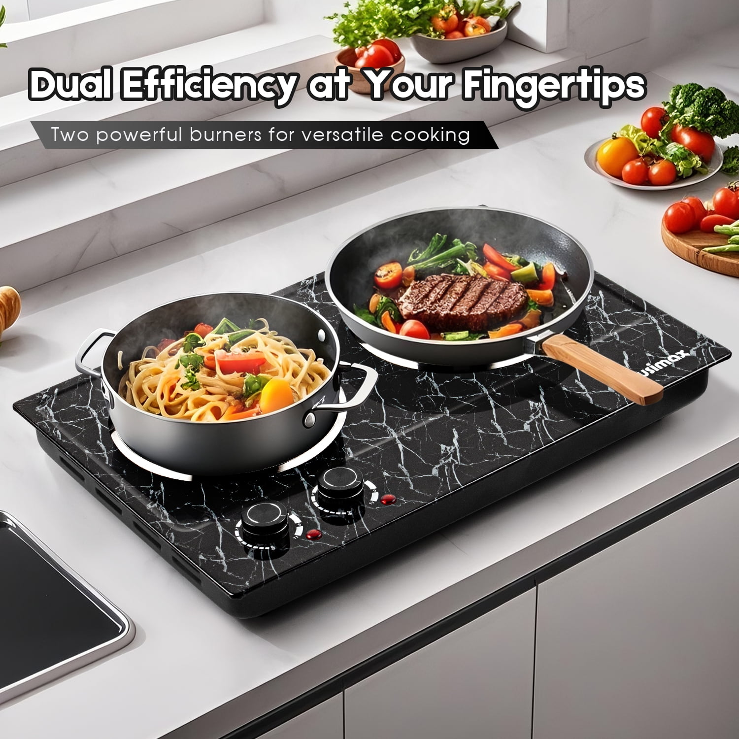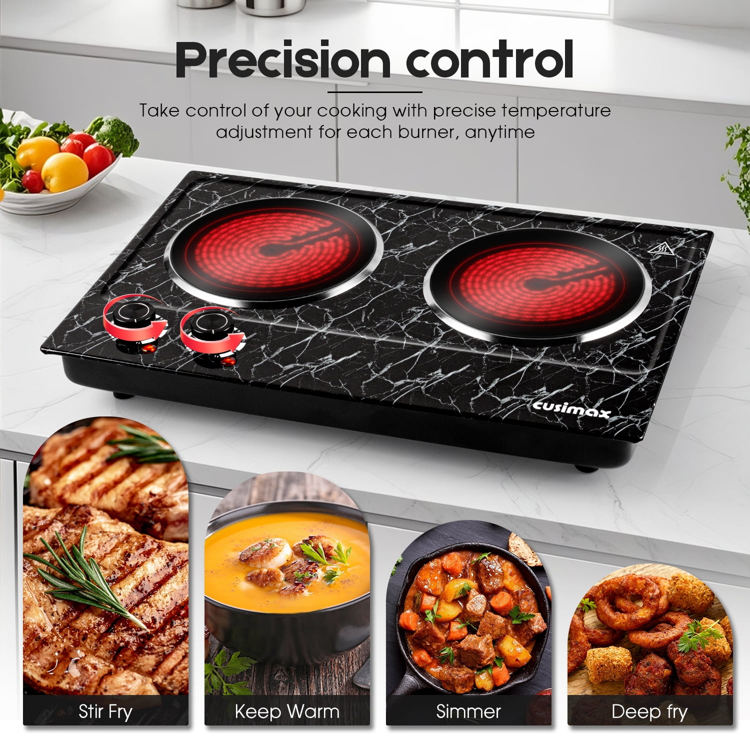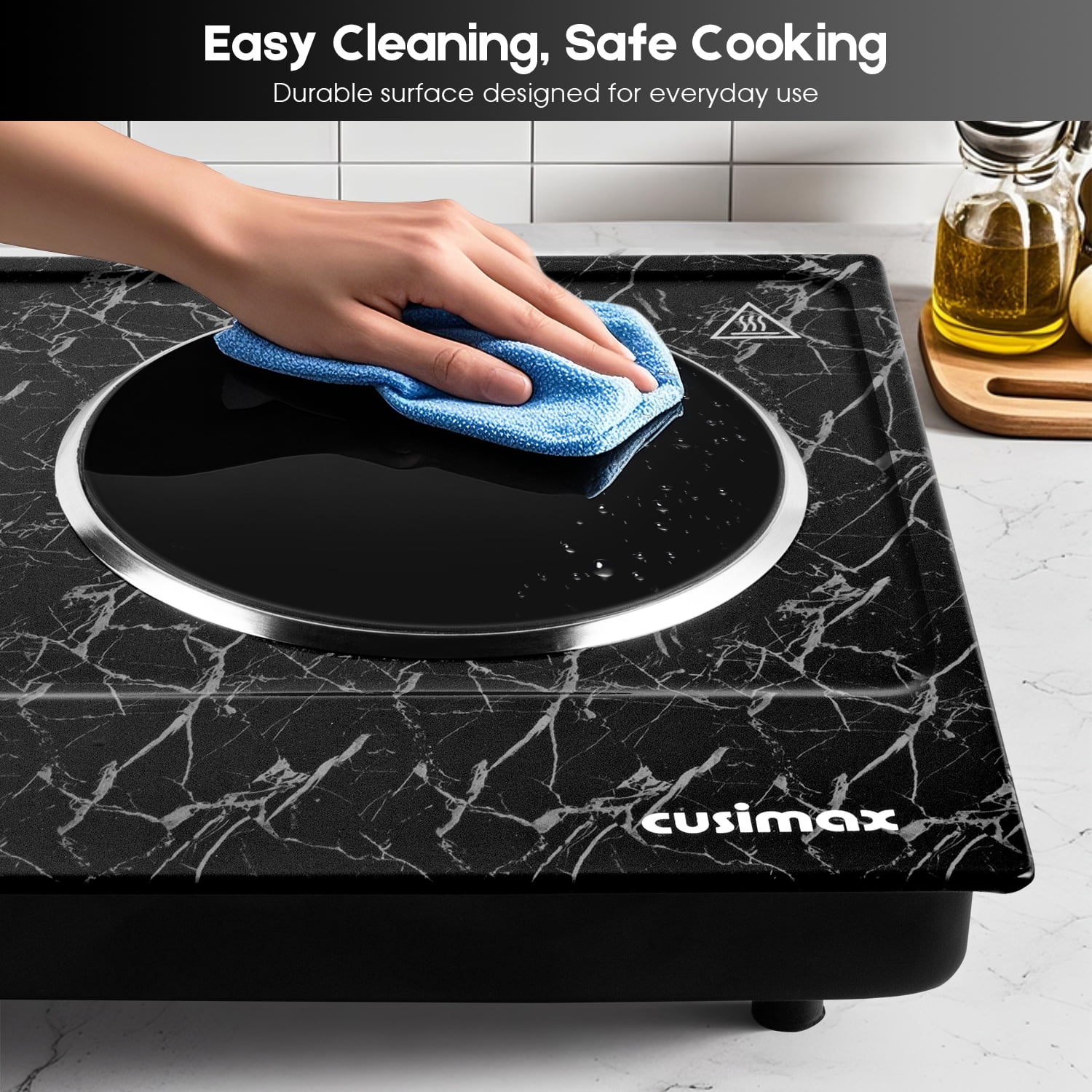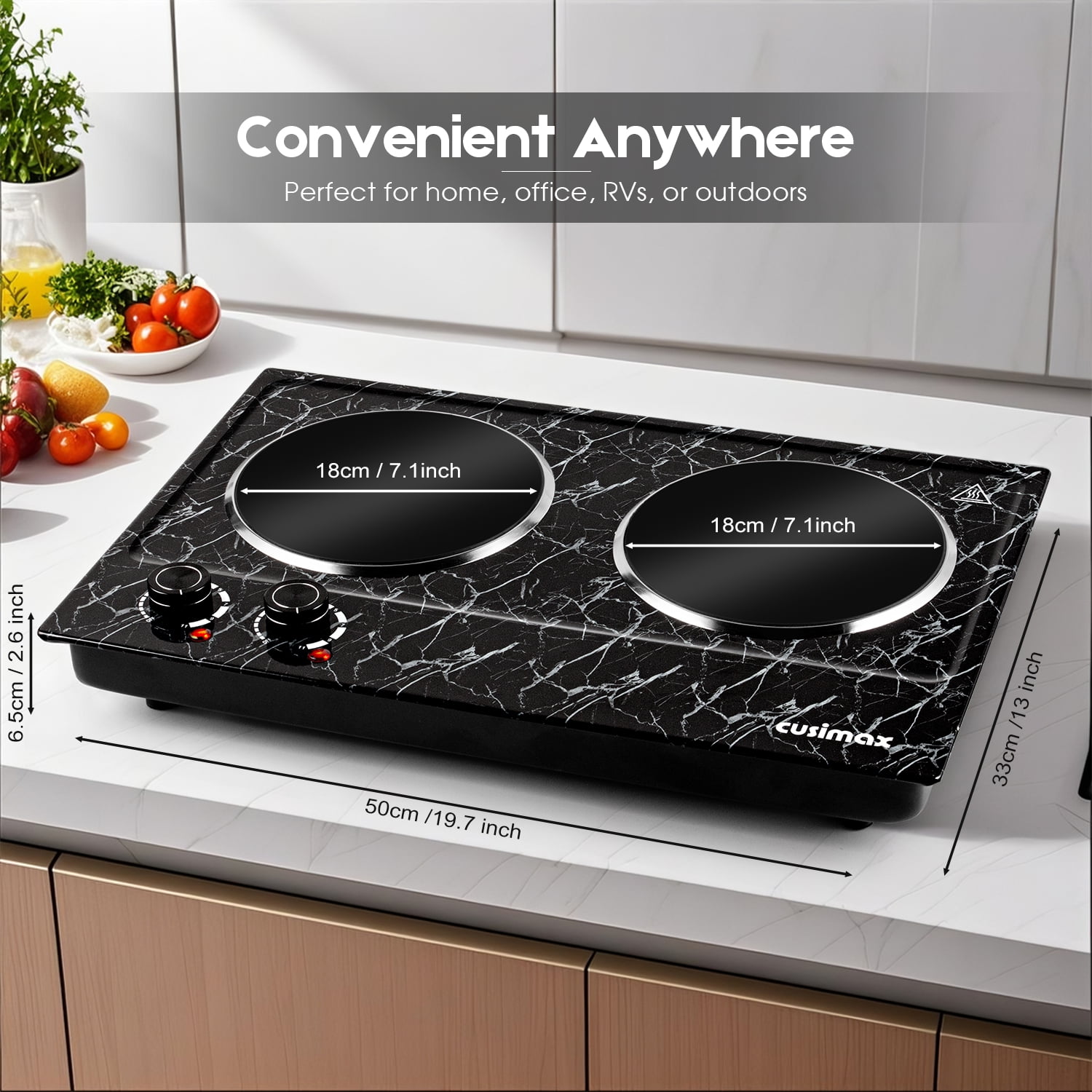 Energy Saving and Fast Heating This Cusimax electric hot plate (double) is powered by 120V and 900W (left burner) + 900W (right burner), a total of 1800W to heat or cook food quickly and evenly. More energy efficient than natural gas. The dual burners can be used at the same time, and the two temperature control knobs can control the corresponding burners independently! They will not affect each other and cause failure to work properly. It uses infrared heating, no electromagnetic radiation, and is harmless to the human body. Marble Body and Smooth Ceramic Plate To find the electric heating plate that is right for you, you need to choose scratch resistance and high stability. The marble body makes the countertop burner look great and easy to clean, and the smooth ceramic plate allows you to easily remove any grease adhering to the surface after cooking by simply rubbing the plate gently with a damp gauze in circular motions. Incredible Structural Design The dual-burner hot plate allows you to cook multiple dishes at once. The burner has a combustion area diameter of 7.1 inches and a total load capacity of 7.85lbs. Cusimax hot plates are suitable for all types of cookware. When you’re done using it, its compact size (20.87 inches wide x 14.57 inches long) allows you to lean it against the corner of a cabinet without taking up space! With automatic safety shutdown function When will the electric heating plate trigger the automatic shutdown function? Normally, its temperature is regulated by a thermostat. When the electric stove detects that the temperature is too high, the automatic shut-off function will turn on to provide overheating protection! In addition, it can also protect the electric heating plate from being burned out and extend its service life! For safety and ease of use, it also comes with non-slip rubber feet and a power indicator light. WARRANTY 12-month warranty Online Service Support 30-Day hassle-free return USA Product Liability Insurance Coverage