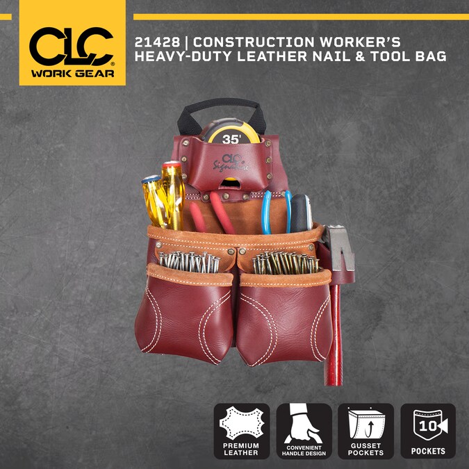 Part of the ultimate line of work gear from CLC, the Signature Elite series 10 pocket nail and tool bag is constructed from heavy duty top grain leather. Patented easy-carry handle design allows for easy adjustment, easy storage and ideal way to carry your tool bag without spilling contents.