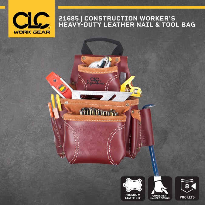 Part of the ultimate line of work gear from CLC, the Signature Elite series 8 pocket nail and tool bag is constructed from heavy duty top grain leather. Patented easy-carry handle design allows for easy adjustment, easy storage and ideal way to carry your tool bag without spilling contents.