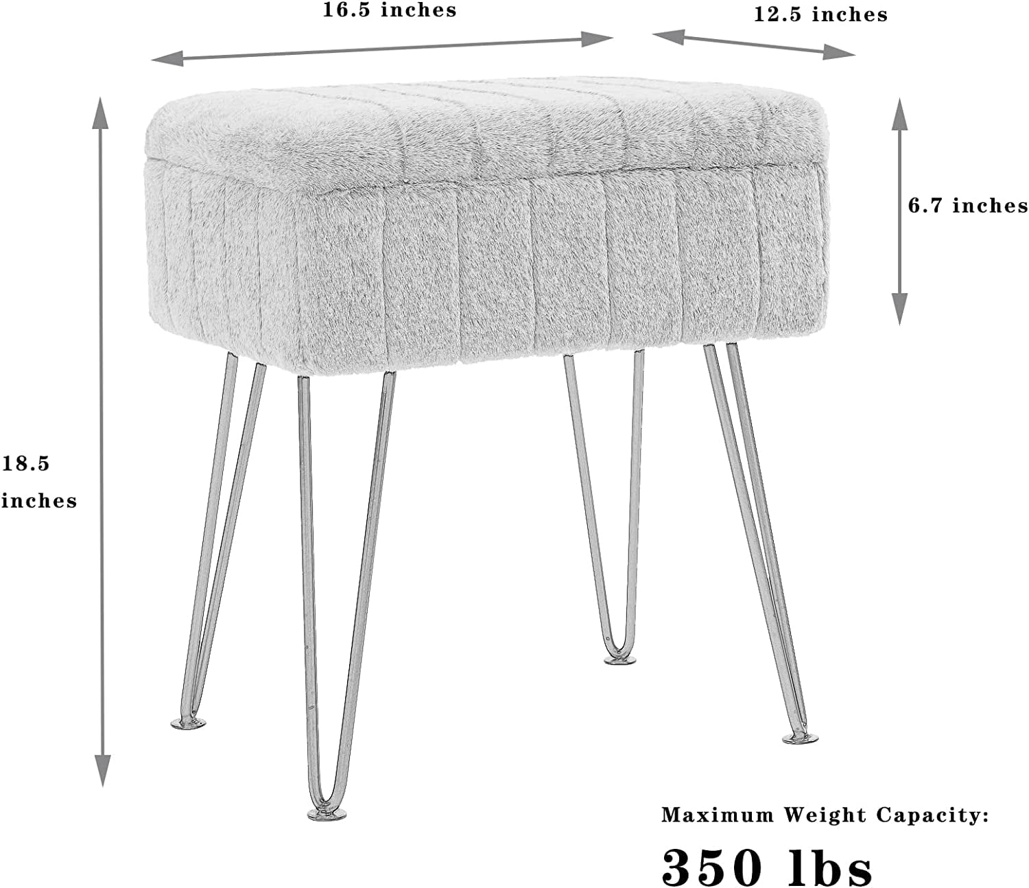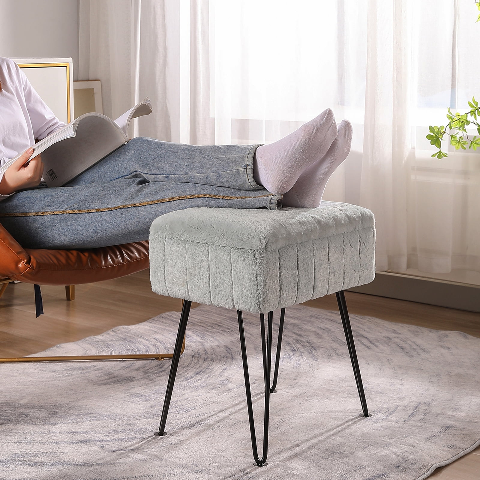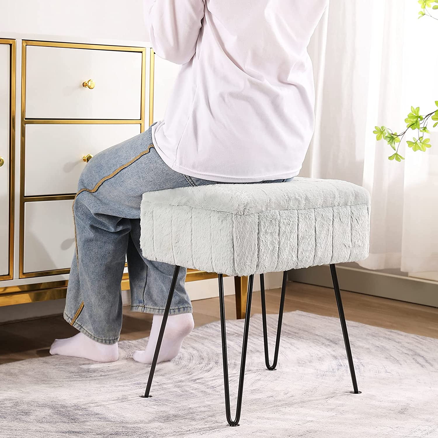 The perfect size: The size of the dressing stool is 12.5″D x 16.5″W x 18.9″H, seat thickness: 6.7inch, Weight capacity: 350 pounds, it comes in a variety of colors for you to choose from, it is a perfect addition to your home decor. Excellent material: made of high quality faux fur, filled with high quality sponge, more soft and comfortable. The bottom surface of the metal leg is made of non-slip pad, It will protect your floor. Comfortable and durable: faux fur material design is more soft and comfortable, metal legs are more solid, not easy to damage. Versatile and widely applicable: This stool is very portable and suitable for many occasions, such as bedroom, porch, living room, makeup room, study, etc. Its height matches your dressing table and the end of bed. You can put your things in it for storage, or you can sit on it or put your feet on it to enjoy your leisure time and relax your mood. Easy to assemble: This one comes complete with mounting tools, and it only takes you a few minutes to screw the metal feet into place. It is easy to install, you can give it to your parents, friends, wife, this is a perfect gift!