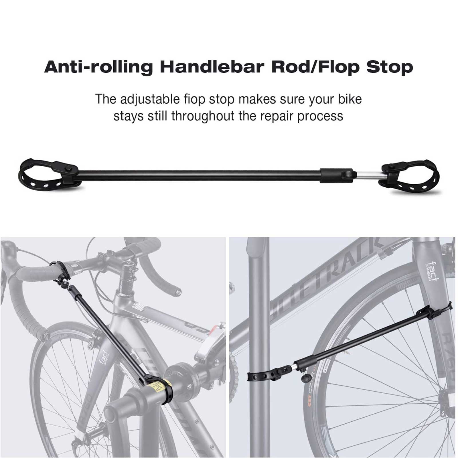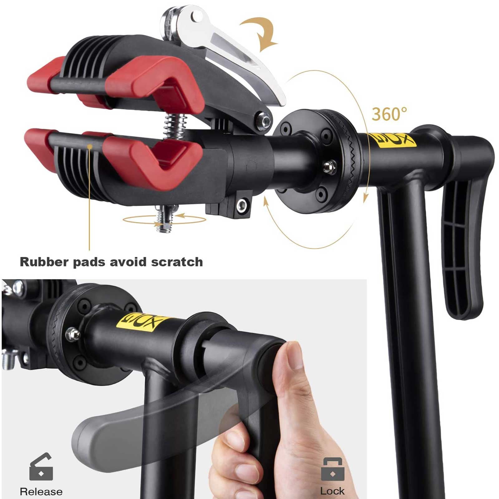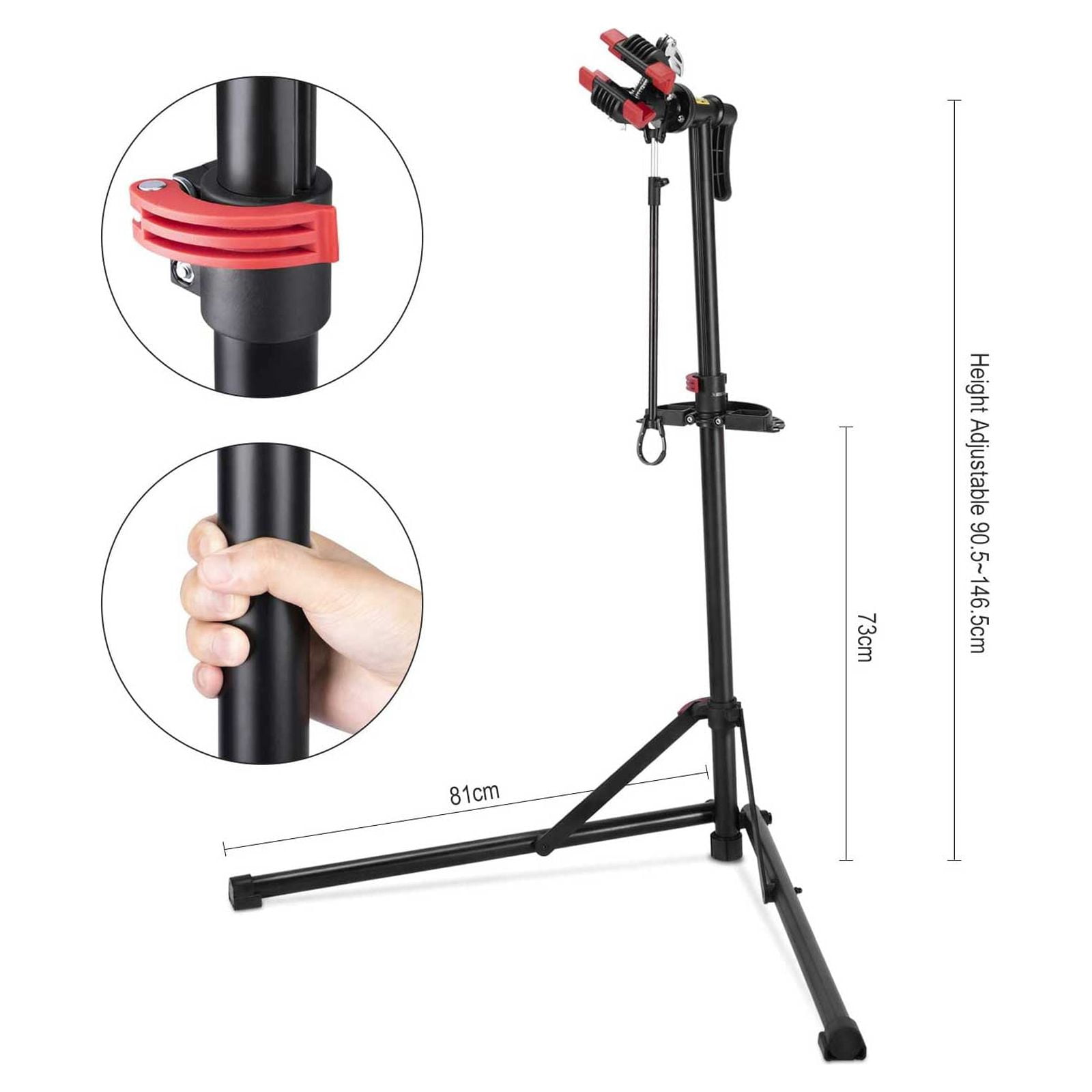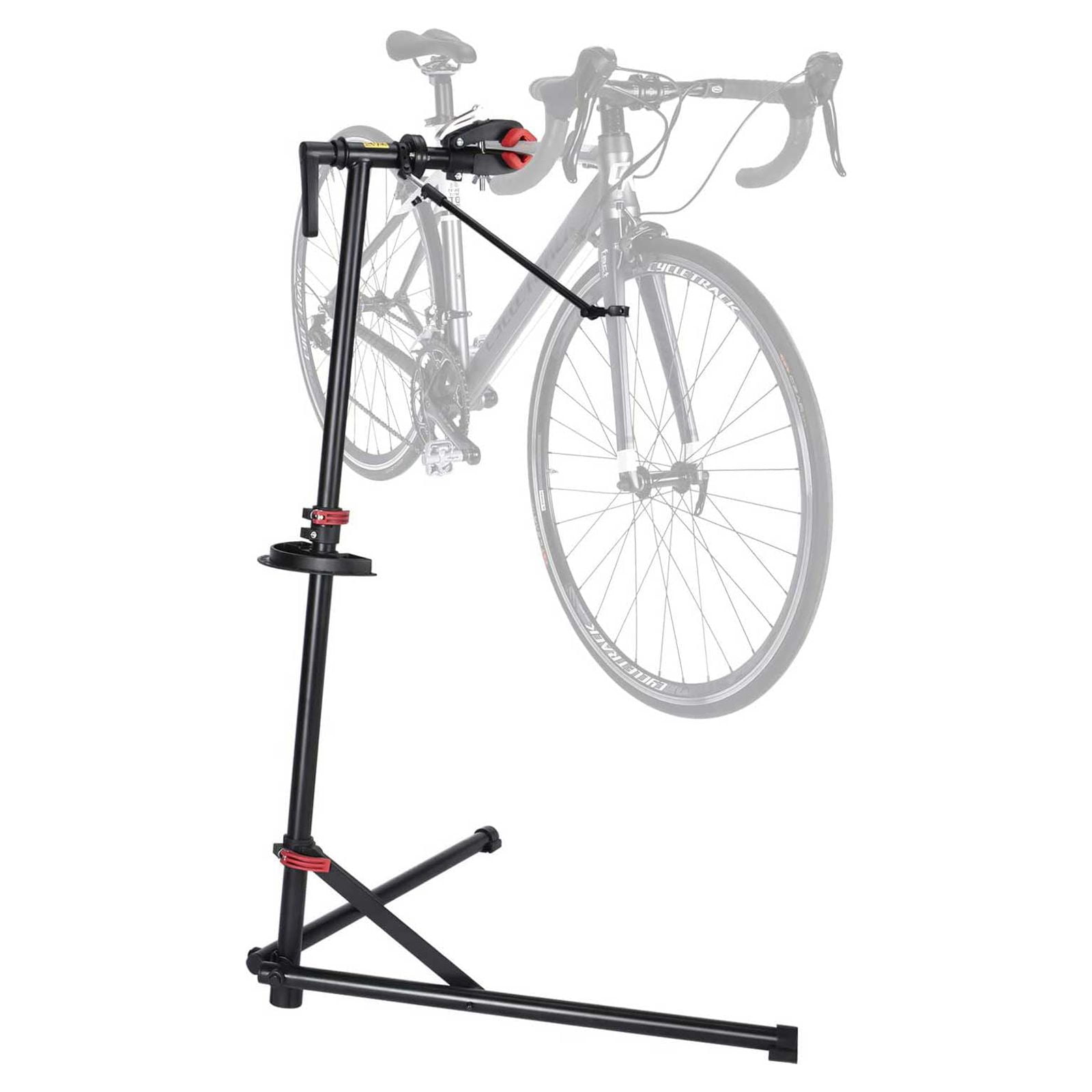 CXWXC Foldable Adjustable Bike Repair Stand, Black 360 Degree Rotatable Clamp & Height Adjustable Body: The clamp with lever holds your bike securely, while the adjustable height ensures comfort during repairs Durable Welded Iron: Lightweight and corrosion-resistant, this stand is easy to carry and store, with a tested load capacity of up to 60 pounds Tool Tray with Magnet: Features a spacious tray with designated spots for tools, plus a magnet to collect screws and nuts without losing them Front Wheel No Shake: Includes a tightening rod to prevent the front wheel from swiveling during repairs; the rod is also length adjustable Super Steady Triangle Base with Rubber Feet: Provides stability during use, with anti-skid rubber feet that won’t scratch your floor