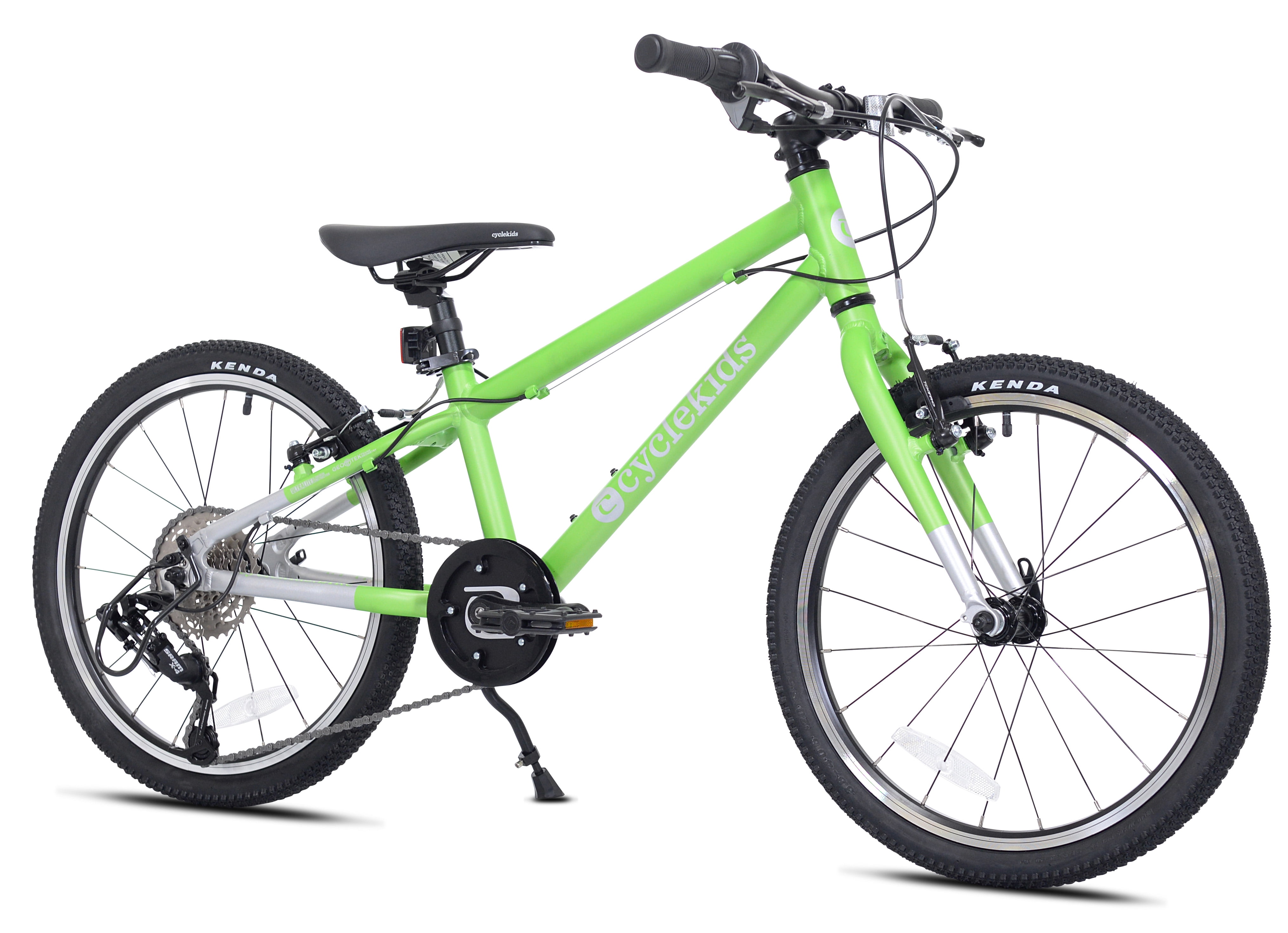 The 20” CYCLE Kids bike is the perfect introduction to gears. It weighs only 19.5 pounds and features an easy-to-use 8 speed twist shift drivetrain. It’s equipped with ultra lightweight, rust proof components and is easily adjustable for the perfect fit. Front and rear Tektro hand brakes provide excellent stopping power and the rear guard protects the derailleur from damage. A great option for all neighborhood rides!