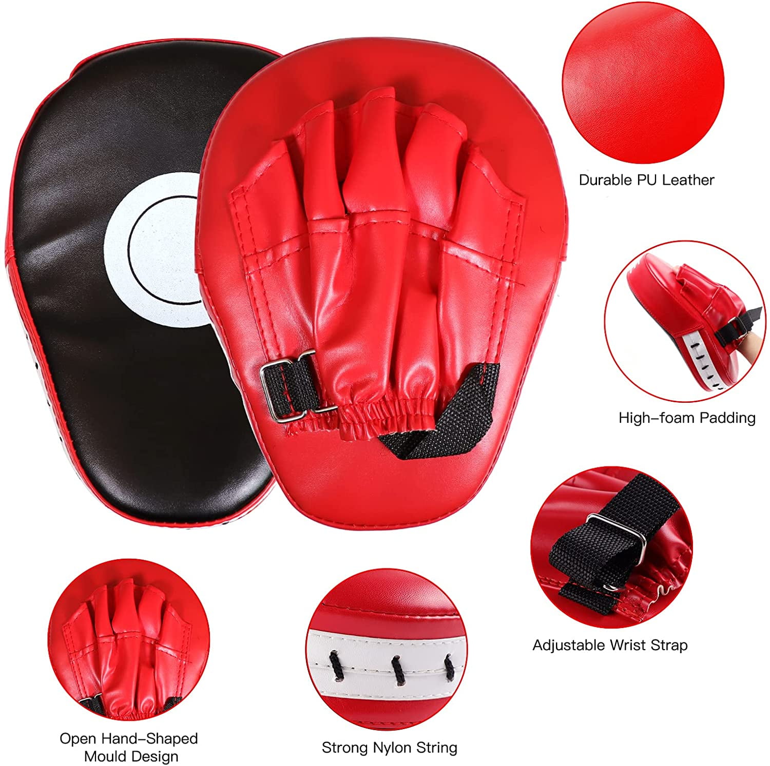 This large 5-piece curved polyurethane (PU) elbow blocking mitt kit from CYFIE is an ideal set for a wide range of martial arts and fitness activities. It includes a kick pad with a large striking area, 2 punching mitts made of durable PU leather, and 2 boxing gloves designed with premium padded foam and a secure, comfortable fit. Ergonomically designed with high-quality materials for effective shock absorption and protection, this set is suitable for kids, youth, and adults looking to improve their fist, feet force, and impact speed during their training sessions.