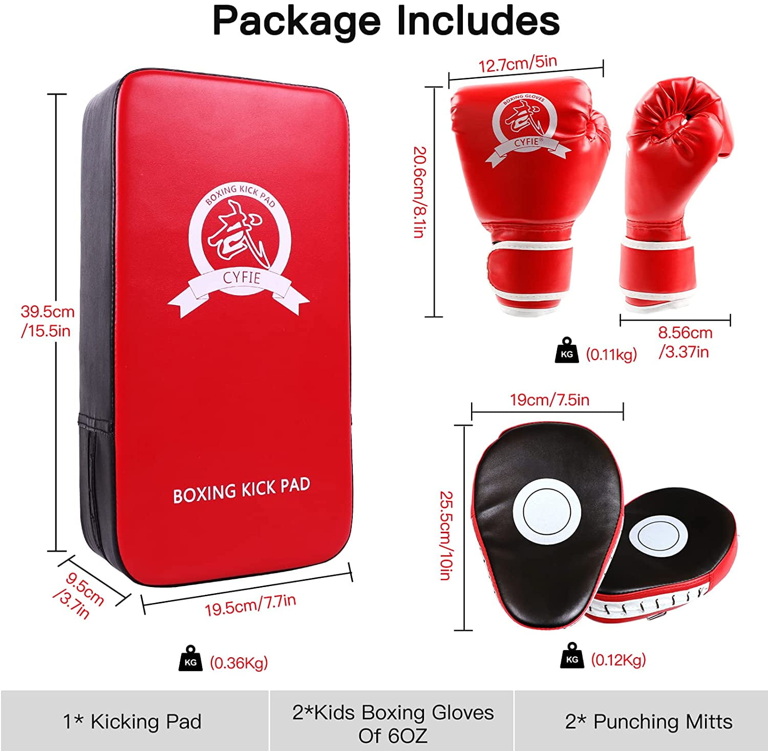This 5-piece curved polyurethane (PU) elbow blocking mitt kit from CYFIE is a comprehensive set for kickboxing and martial arts training. The kit includes a large kick pad with a durable PU leather exterior, thick sponge interior, and adjustable buckle design for a secure and comfortable grip. The two punching mitts feature a curved hand-shaped design made of high-quality PU leather, with adjustable wrist straps and high-foam padding for effective shock absorption. The two boxing gloves are designed with premium padded foam, a hand-molded shape, locked thumb feature, and loop wrist straps for a secure and comfortable fit, making them suitable for kids and youth from 60 to 100 lbs. Crafted with ergonomics in mind, this set utilizes high-quality materials like thickened foam filler and PU leather to provide excellent shock absorption and protection during training. The breathable design on the punching mitts helps reduce sweat flow, while the curved shape fits most trainers’ hands comfortably. This versatile set is ideal for a wide range of martial arts and fitness activities, including MMA, UFC, kickboxing, karate, Muay Thai, and more, making it suitable for kids, youth, and adults.