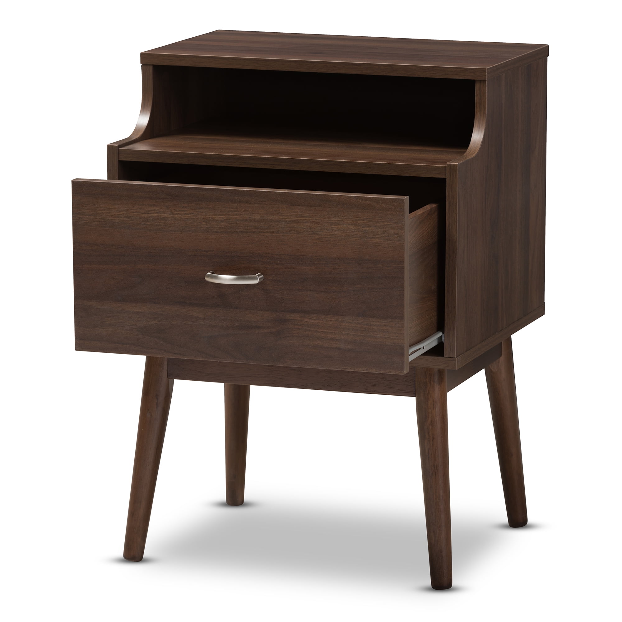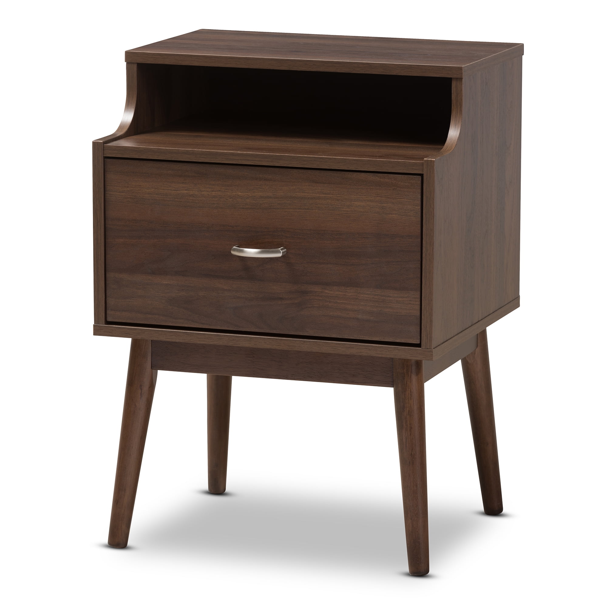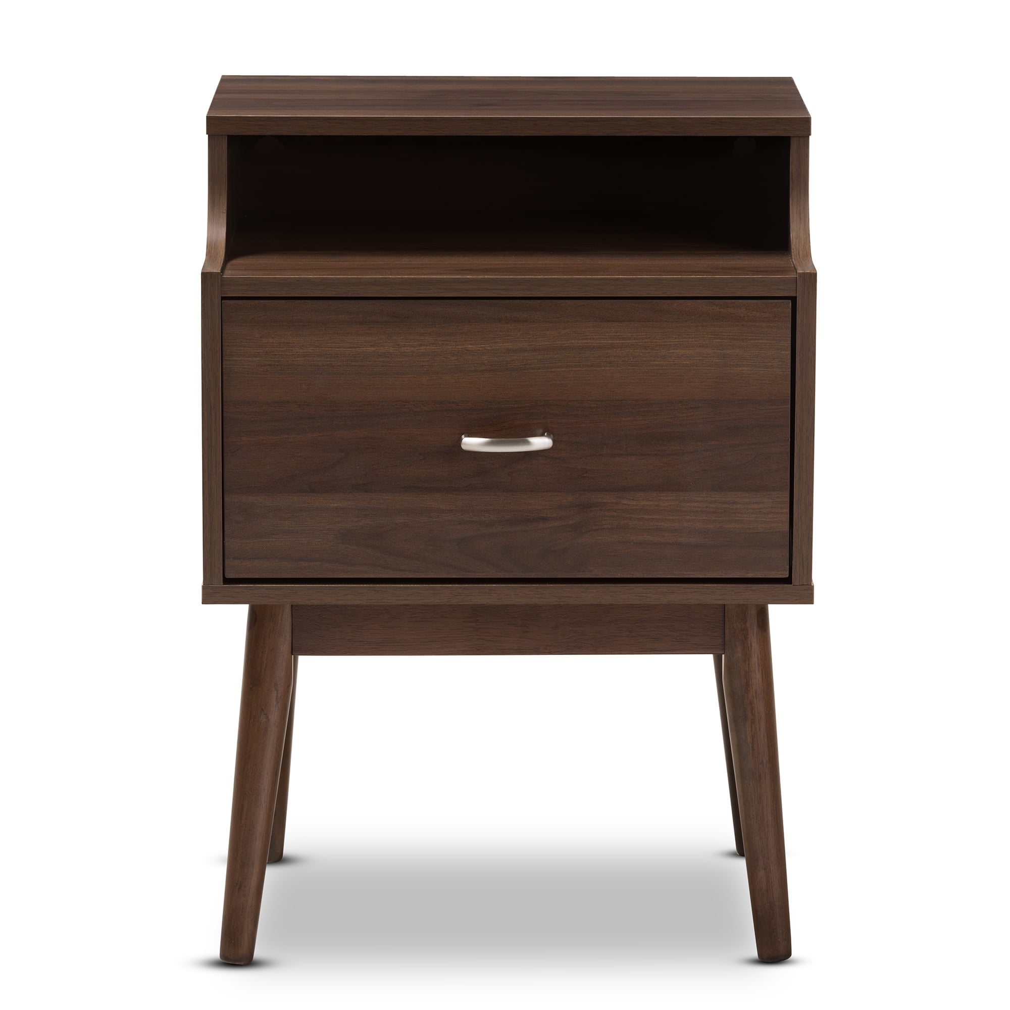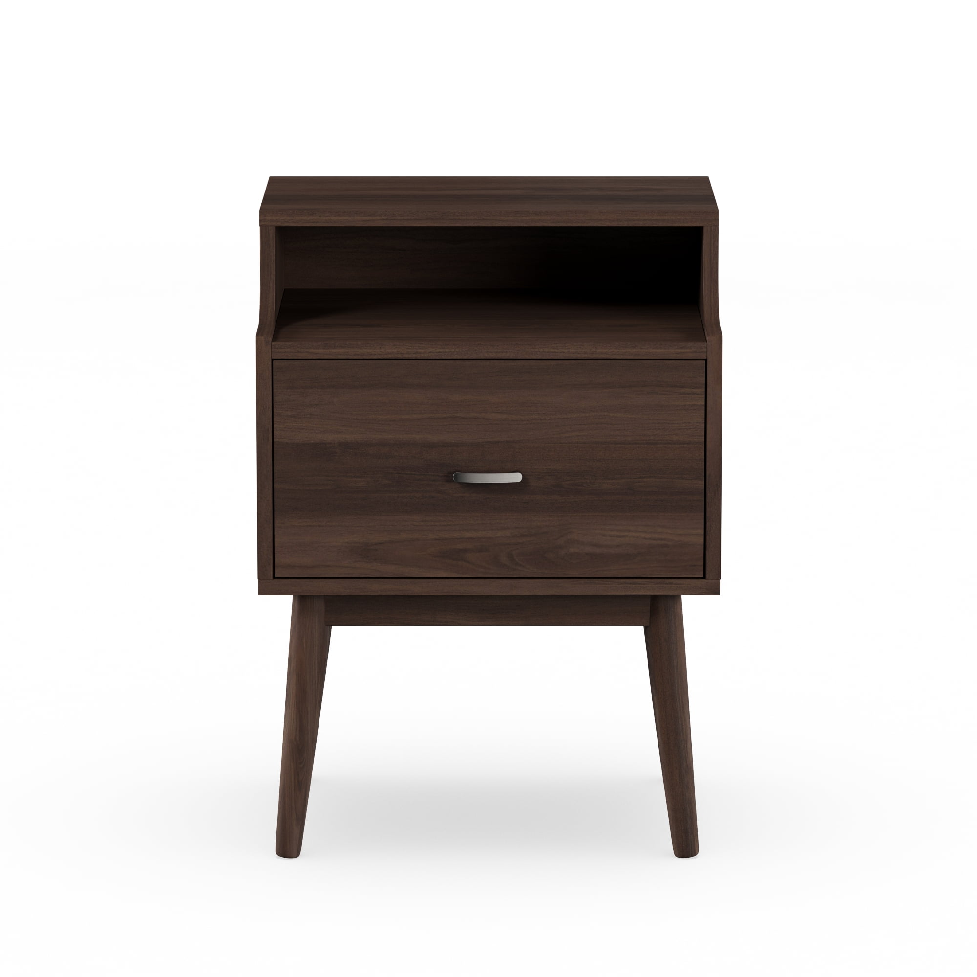 Mid-century modern nightstand; Walnut wood finishing; One drawer