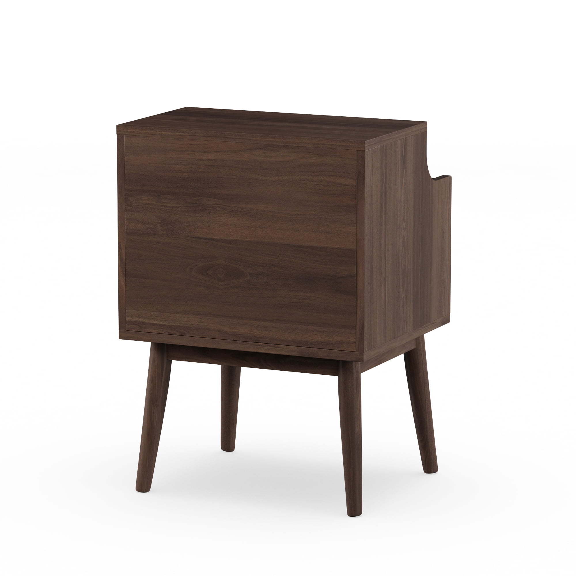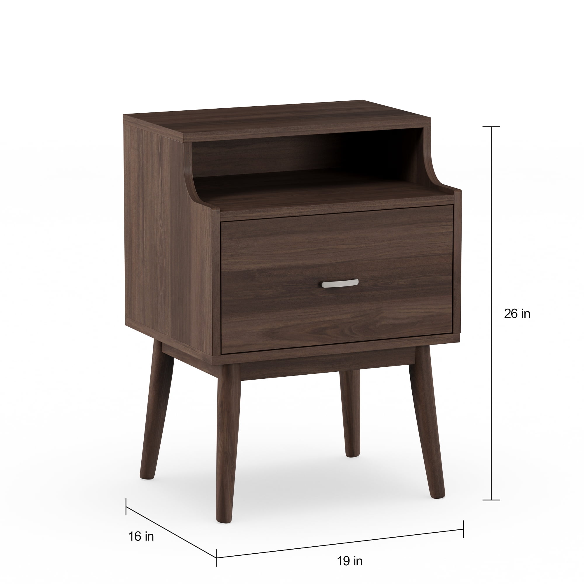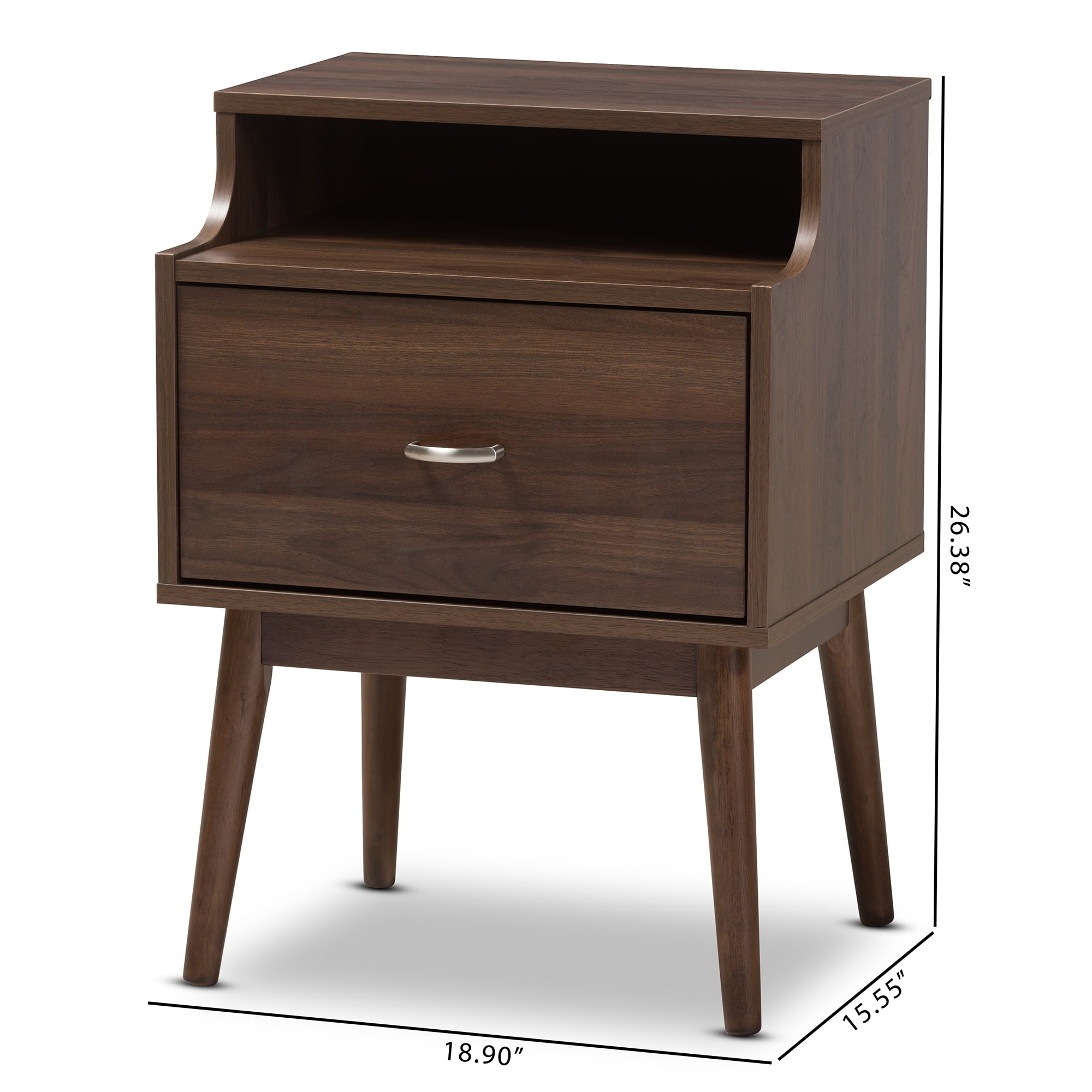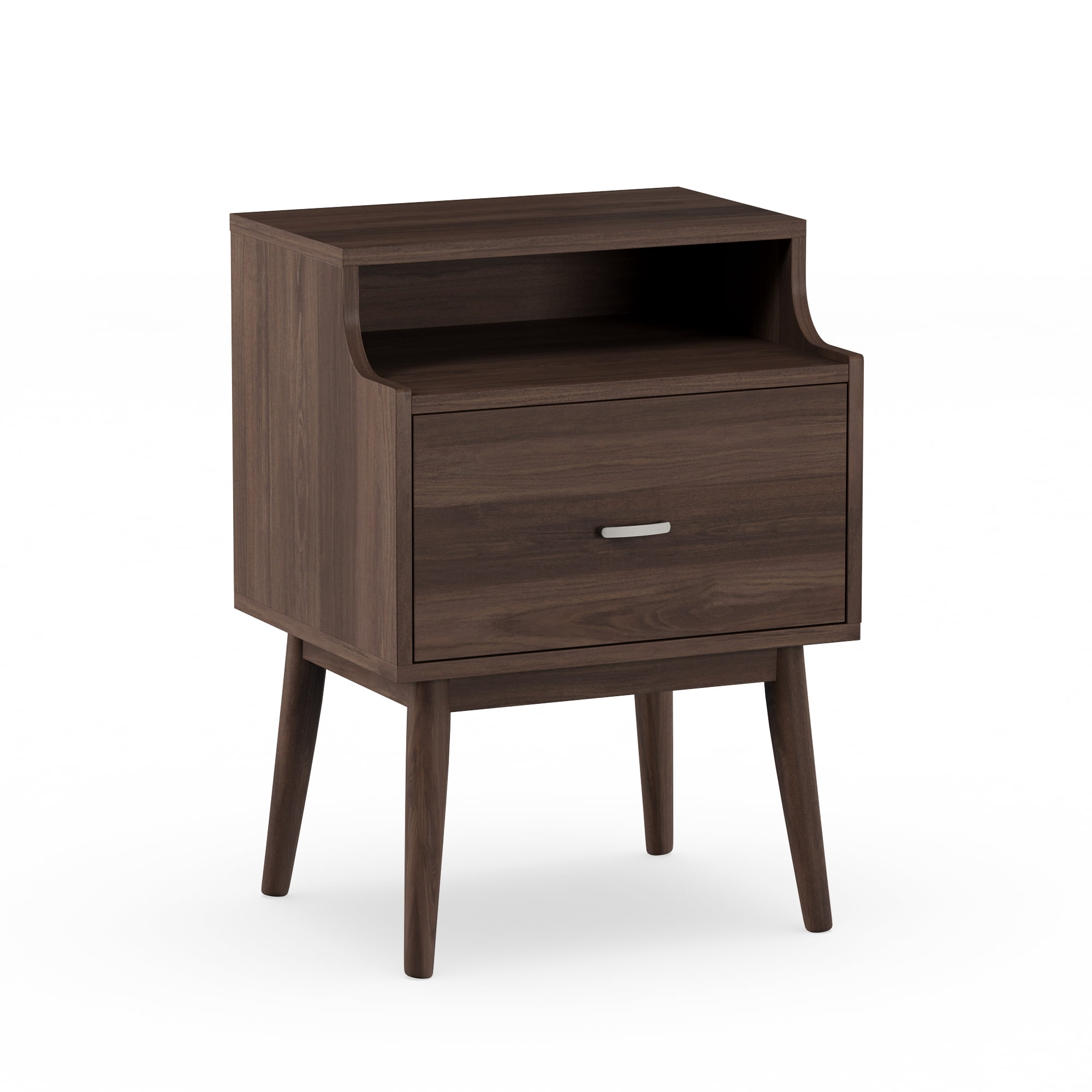 Mid-century modern nightstand; Walnut wood finishing; One drawer