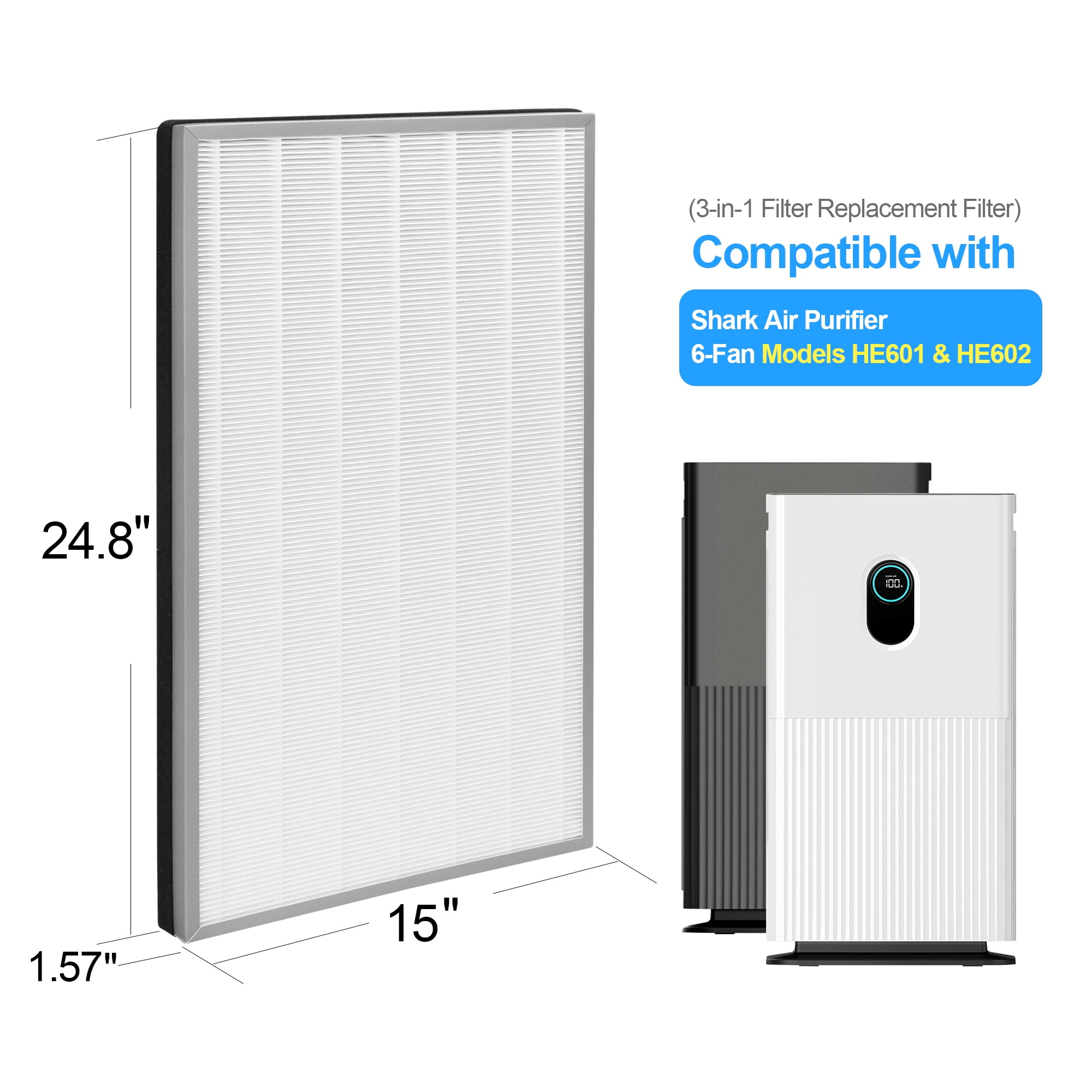 DAJDAH HE601 HEPA Air Filter Replacement Compatible with Shark Air Purifier, (2 Count) Compatible with Shark air purifier HE601 and HE602 models 3-in-1 filter design includes pre-filter, HEPA filter, and activated carbon filter H13 HEPA material removes 99.97% of airborne particles as small as 0.3 microns Enhanced carbon filter layer effectively eliminates household odors Easy filter replacement with no tools required Reset the filter timing system after installation for optimal performance Recommended replacement every 6-12 months based on air quality Value pack includes 2 packs of 3-in-1 replacement filters at a competitive price