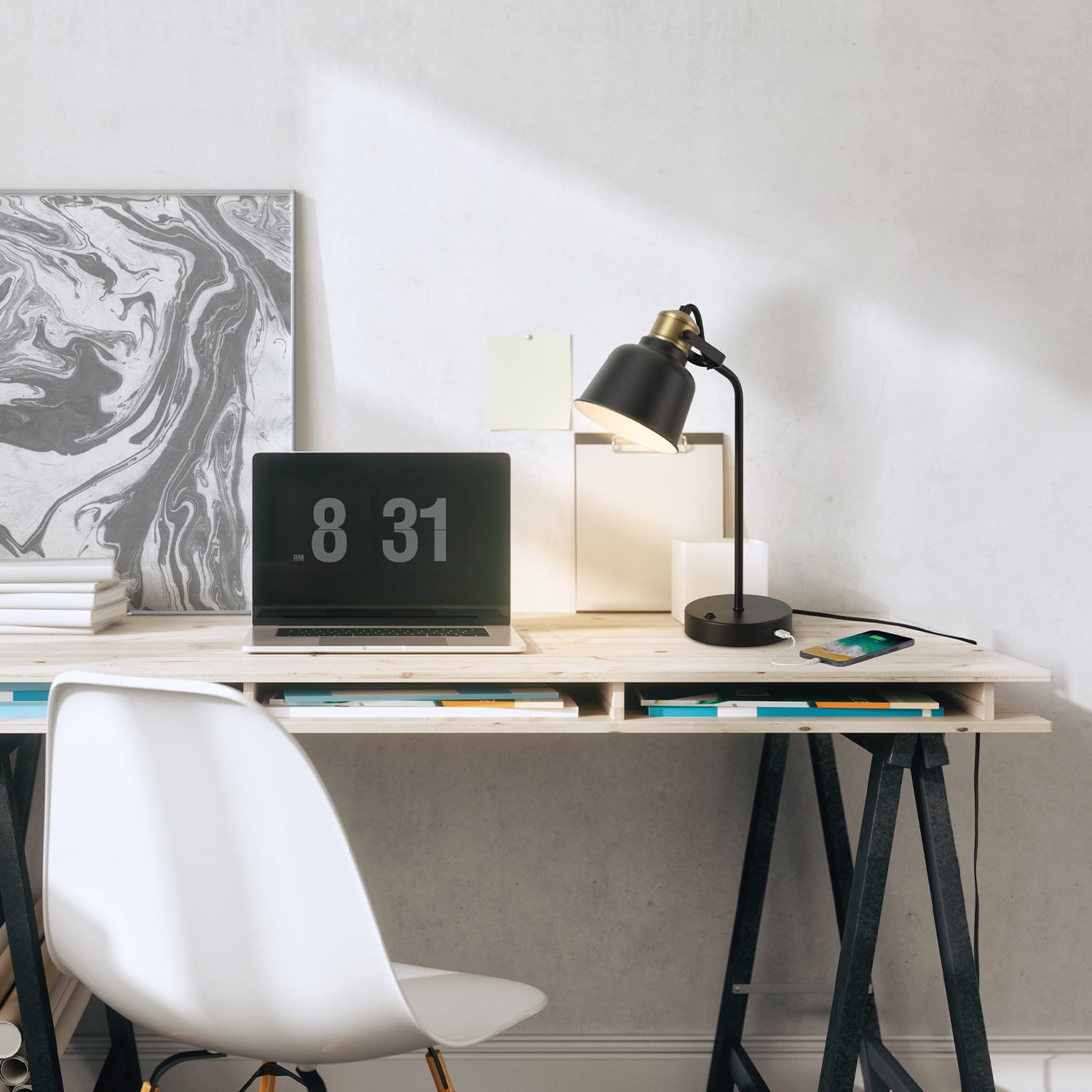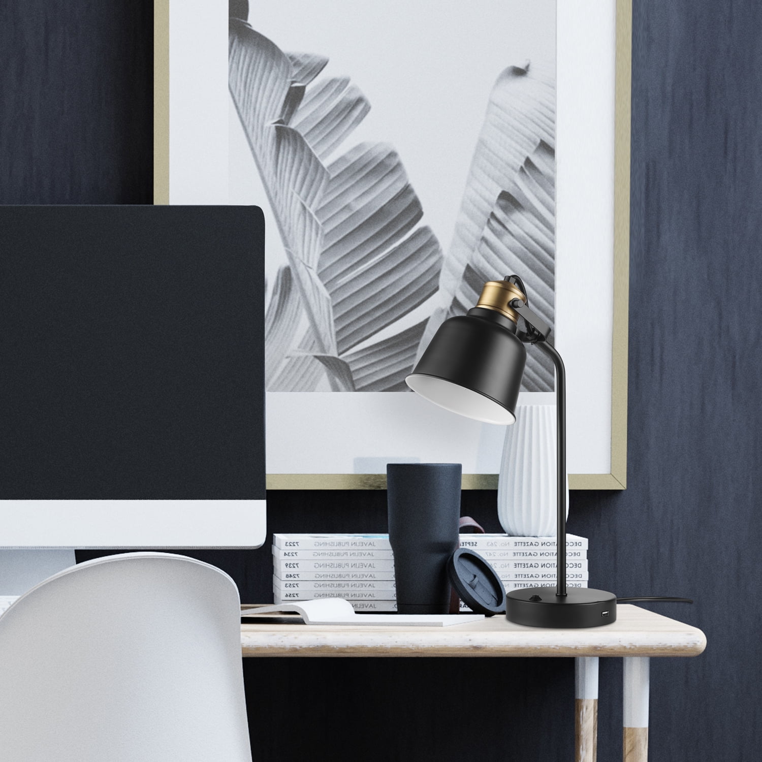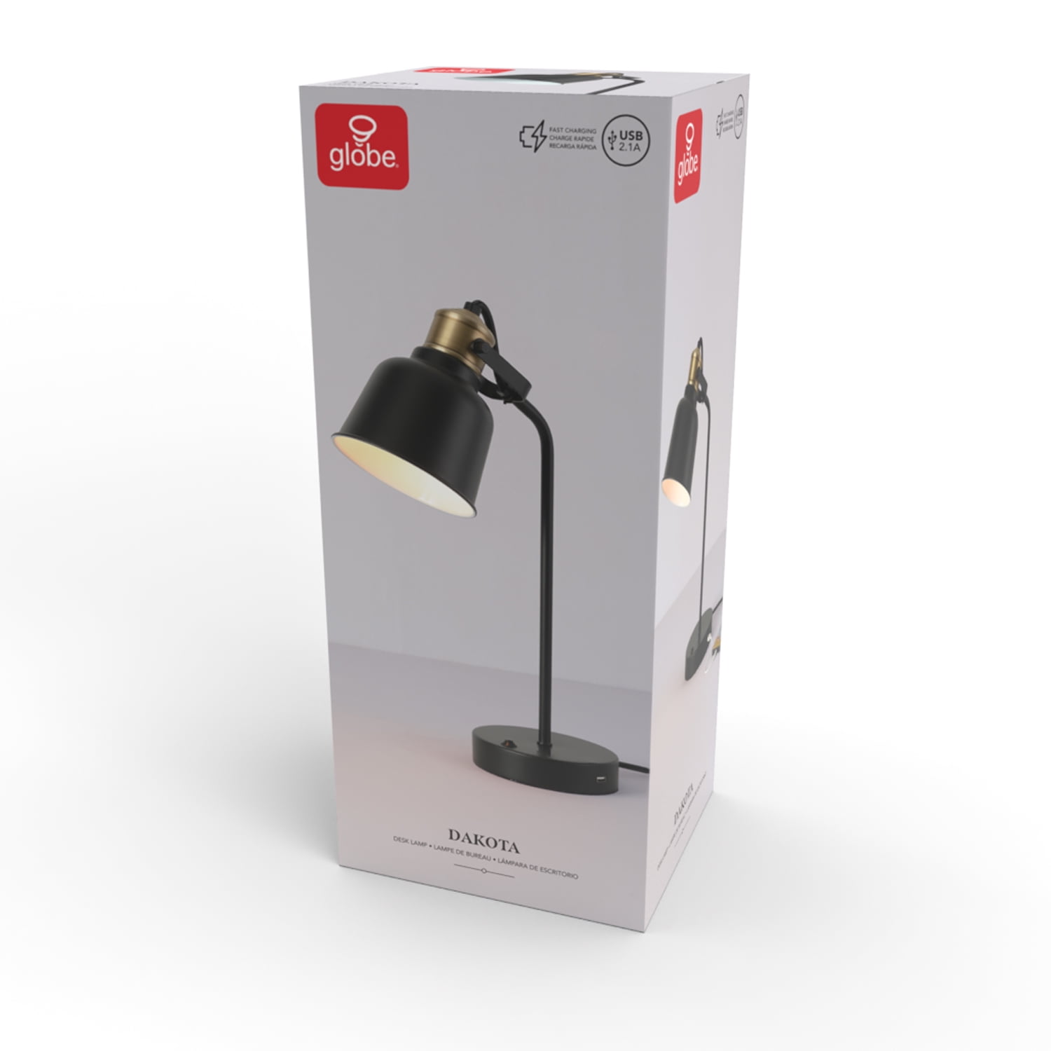 LOFTY INDUSTRIAL: the matte black finish, large-scale design and high-speed USB charging port of the Dakota Desk Lamp create a functional light with charming lofty industrial style USB PORT: the 2.1-amp USB port charges your phone or small electronic devices as you work, sleep or hang out BULB REQUIREMENTS: 1x E26/Medium Base 60W Bulb (sold separately) – Compatible with LED, Incandescent and Halogen Bulbs – LED or Incandescent recommended ACCENT LIGHT: a perfect accent light for your home, office or workspace, this lamp provides a bright light to illuminate any area you desire STATEMENT LAMP: sitting at 18-inches, the large-scale look of this lamp provides a statement making desk accessory while not taking up too much space with a small, sturdy base BRING THE COLLECTION HOME: check out the other colors of the Dakota Lamp Collection to bring a cohesive look throughout your home MAKE IT SMART: automate your desk lamp by adding a Globe Electric Smart bulb – simply screw it in and create different lighting solutions with your phone – the options are endless!