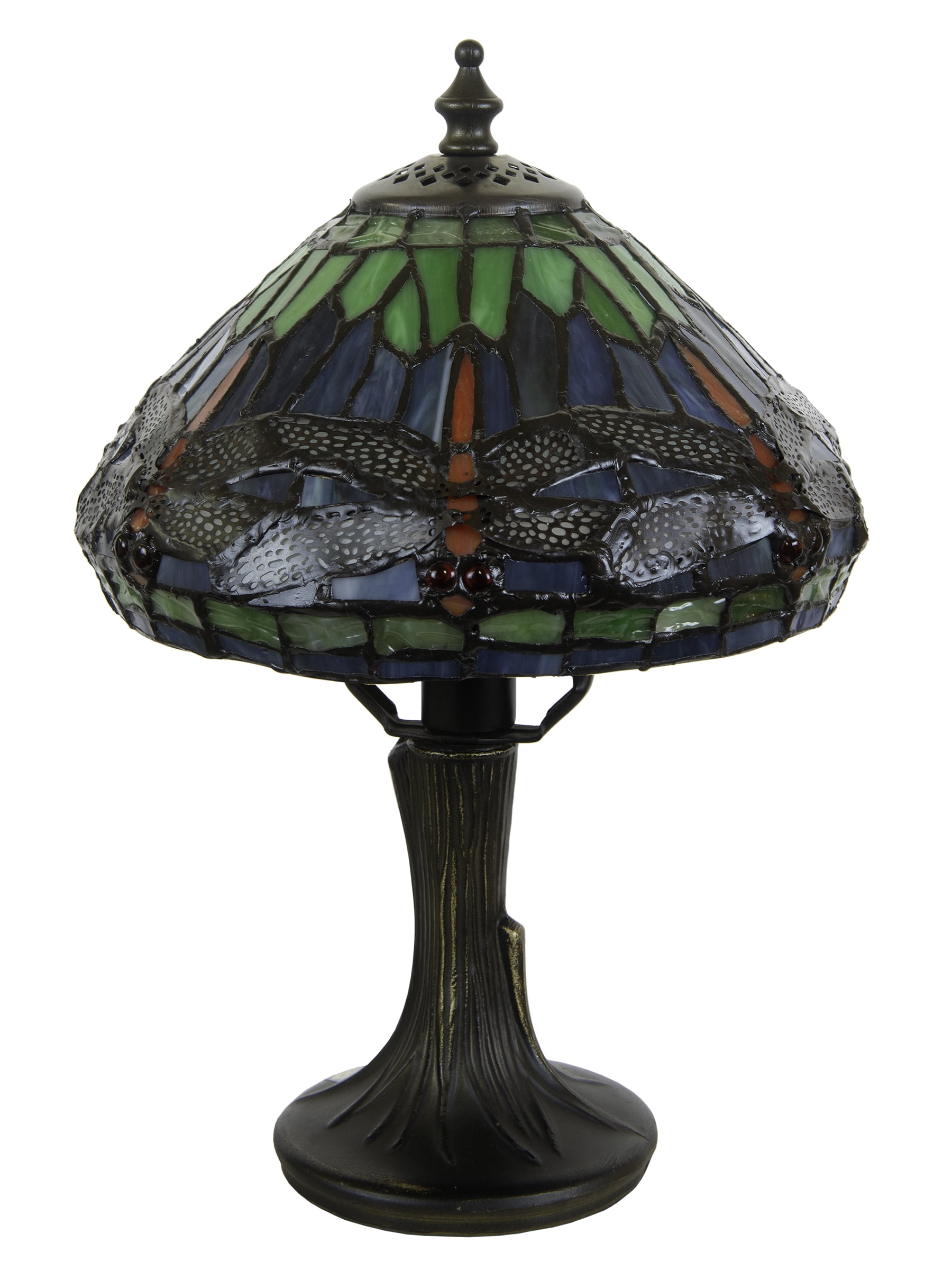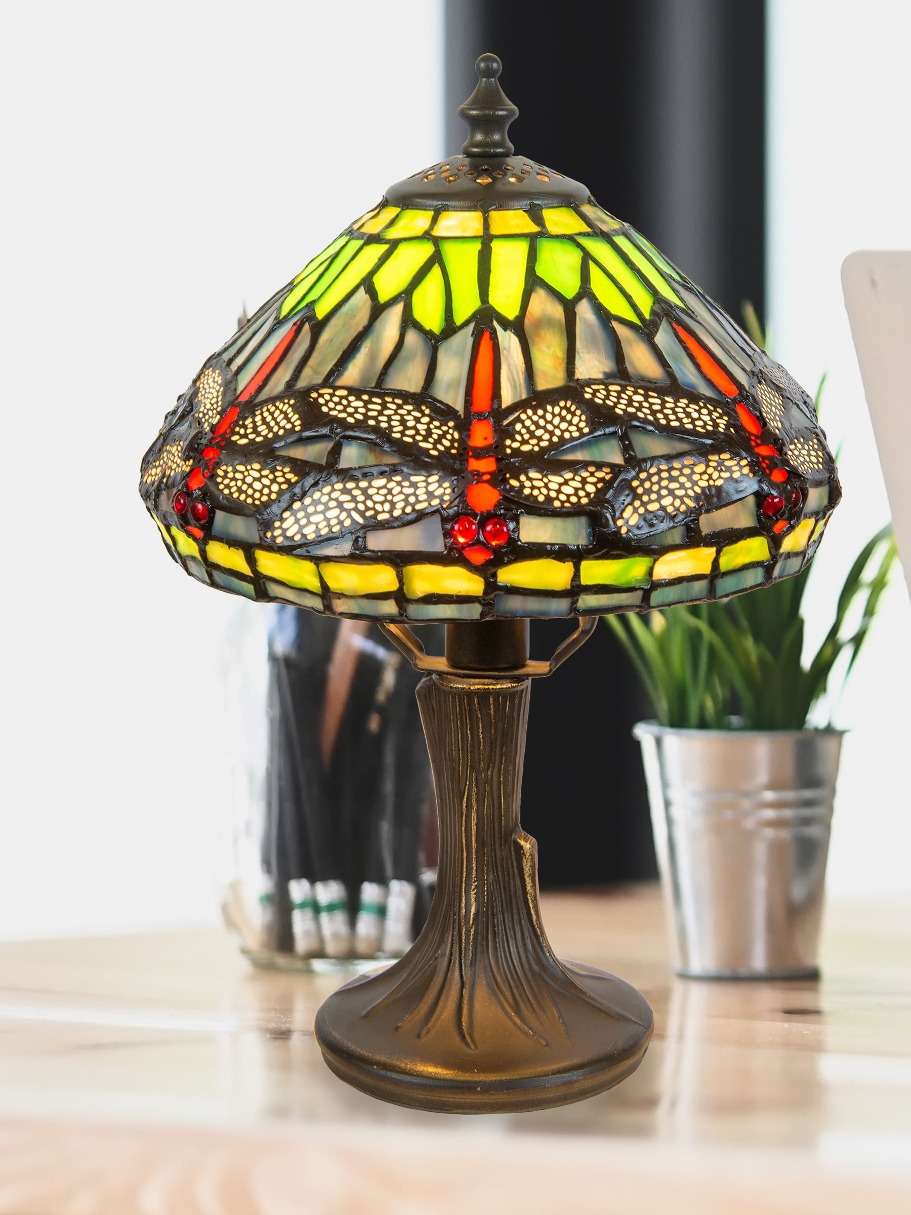 A miniature version of the iconic Tiffany dragonfly lamp, this delightful lamp may be short in stature, but it is long on design elements. Like its famous big brother, 217 pieces of art glass are hand rolled and copper foiled in Tiffany’s time honored tradition. Beautifully filigreed dragonflies rim the bottom of the shade, which is ablaze in vibrant shades of blue, green, red, yellow, purple and amber. The metal base is tree trunk style, and is finished in antique brass. Perfect for any room in your home or office where you want that extra splash of color, this delightful little lamp is the perfect way to begin your Tiffany collection. Features: Base Finish: Antique Bronze Material: Metal Socket: ONOFF Number of Bulbs: 1 Wattage: 60W Switch: Inline Specifications: Overall Product Dimension: 11″H x 8″W x 8″D Product Weight: 3 lbs