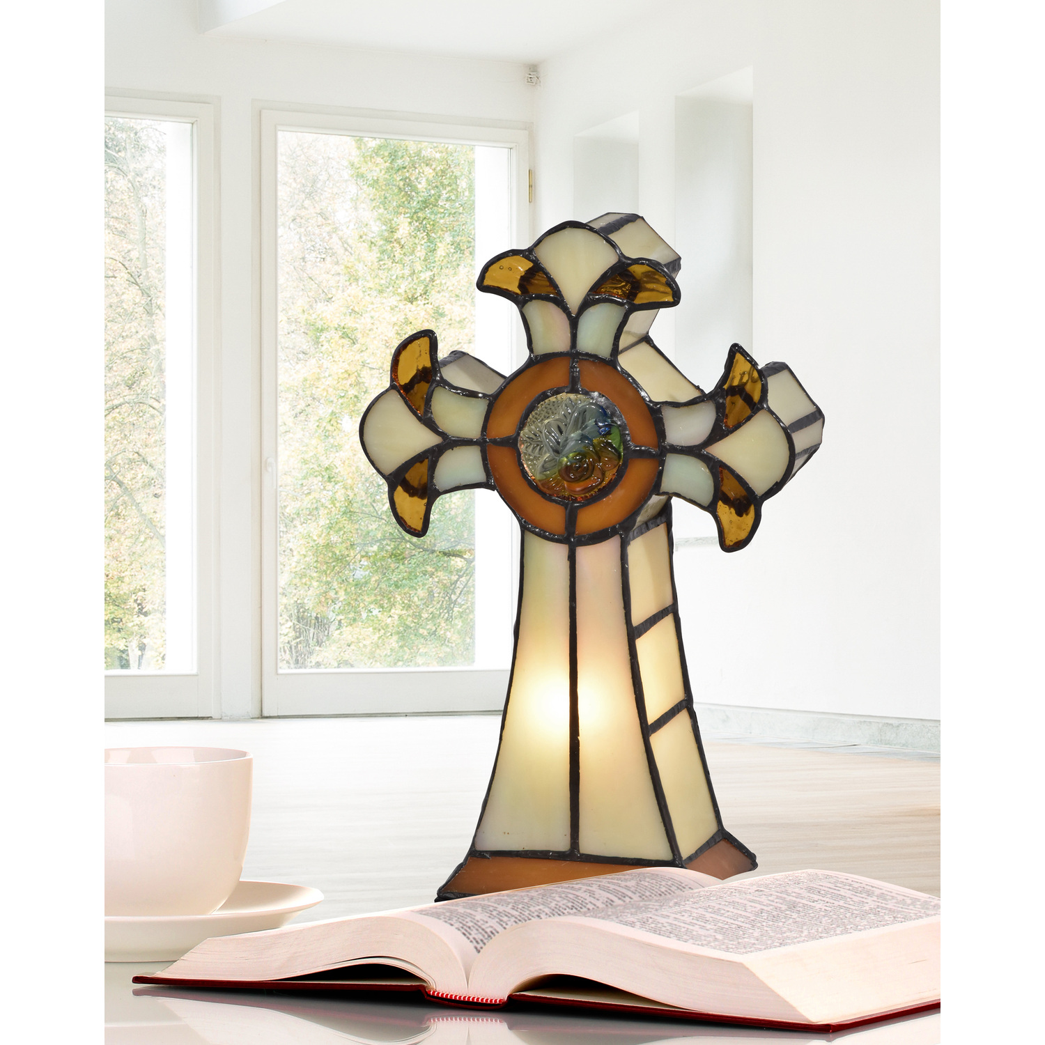 Our Tiffany Cross Accent Lamp is a divine addition to any decor that does double duty as both functional accent lamp and illuminated work of art. The highly stylized cross features a base of swirled amber art glass that is accented with deep filigree. At the center, a round of iridescent art glass is surrounded by a large amber border. Matching amber insets on the ends of the cross and around the base add extra color when the lamp is illuminated. A lovely pop of warm color on a bookshelf or curio cabinet, our Tiffany Cross Accent Lamp is also the perfect gift for the spiritual minded recipient.