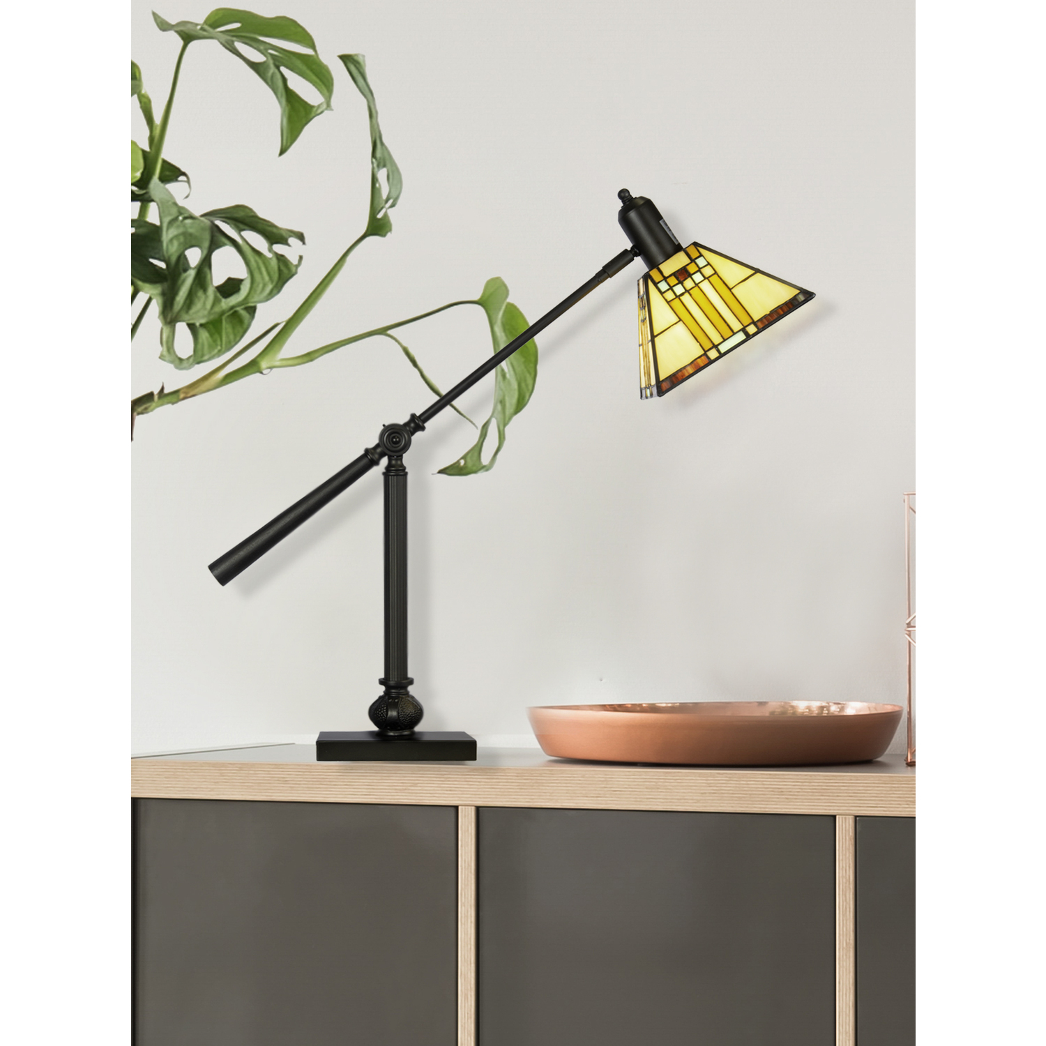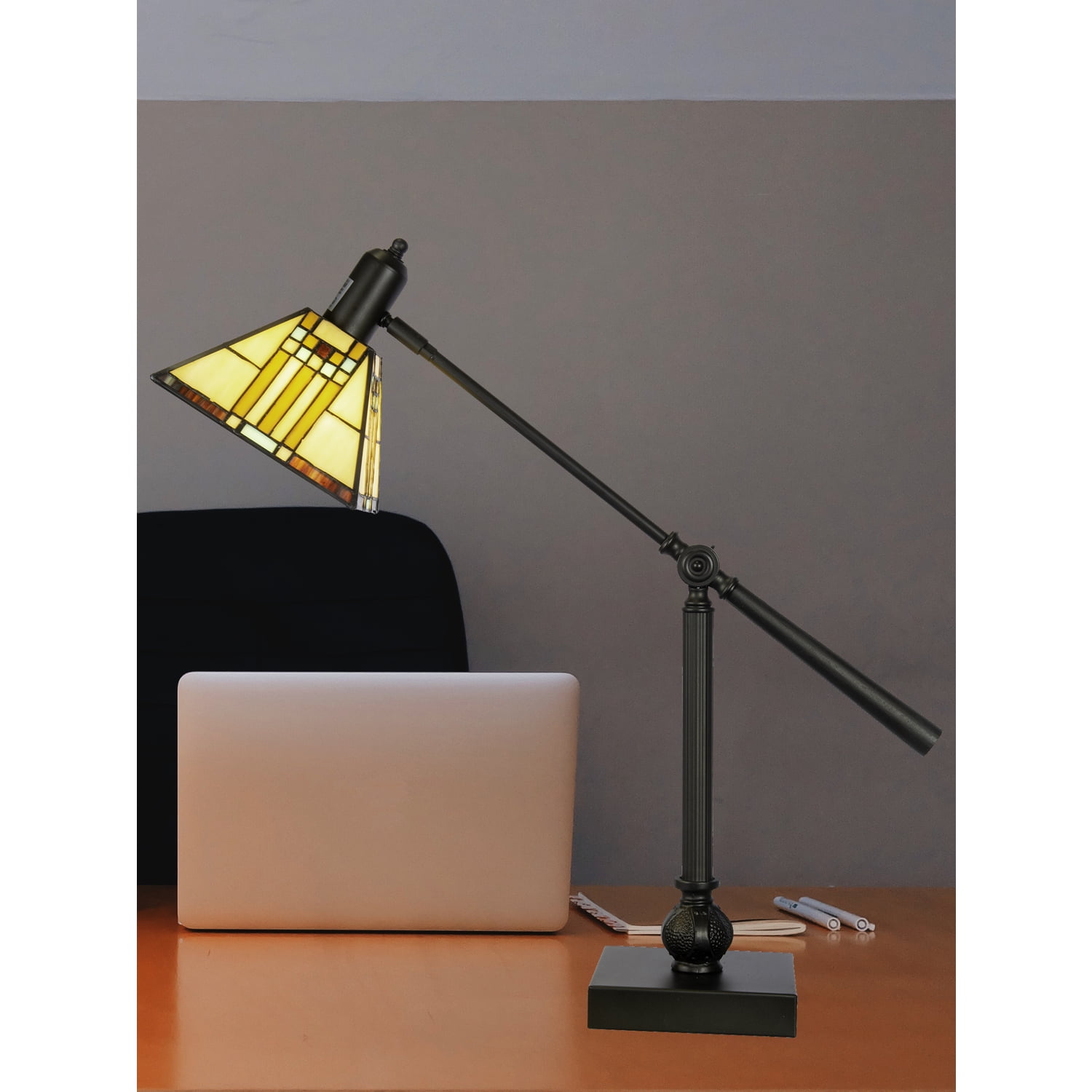 Both attractive and functional, the Mission bank table lamp features more than 100 pieces of art glass, each individually hand rolled and set in copper foil. The mission style shade is done in a traditional window pattern in beige, blue, red and butterscotch. The base is a classic reader style with a fully adjustable arm and is finished in mica bronze. Features: Base Finish: Mica Bronze Material: Resin, Metal Socket: ONOFF Number of Bulbs: 1 Wattage: 60W Switch: Inline Specifications: Overall Product Dimension: 23.5″H x 23.25″W x 23.25″D Product Weight: 8 lbs