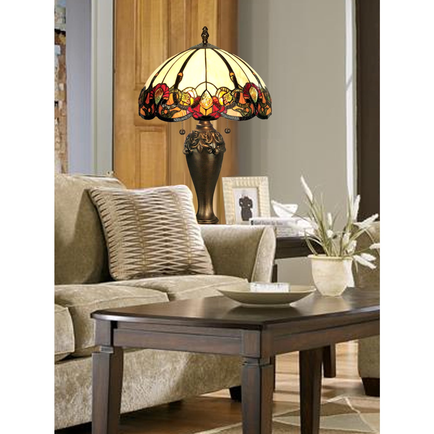 Ablaze with prismatic color, the Northlake table lamp is both artistic and functional. Almost 400 pieces of art glass, each piece hand rolled and individually set in copper foil, glow warmly on the dome shaped shade. The intense earthen tones in this lamp will beautifully accentuate any décor in your home or office. Delicate carving on the metal base’s top and raised pedestal bottom signify the quality and artisanship you have come to expect from Dale Tiffany. The base is finished in a beautiful antique bronze finish. Features: Base Finish: Antique Bronze Material: Metal Socket: ONOFF Number of Bulbs: 2 Wattage: 60W Switch: Pull Chain Specifications: Overall Product Dimension: 27″H x 16″W x 16″D Product Weight: 15 lbs