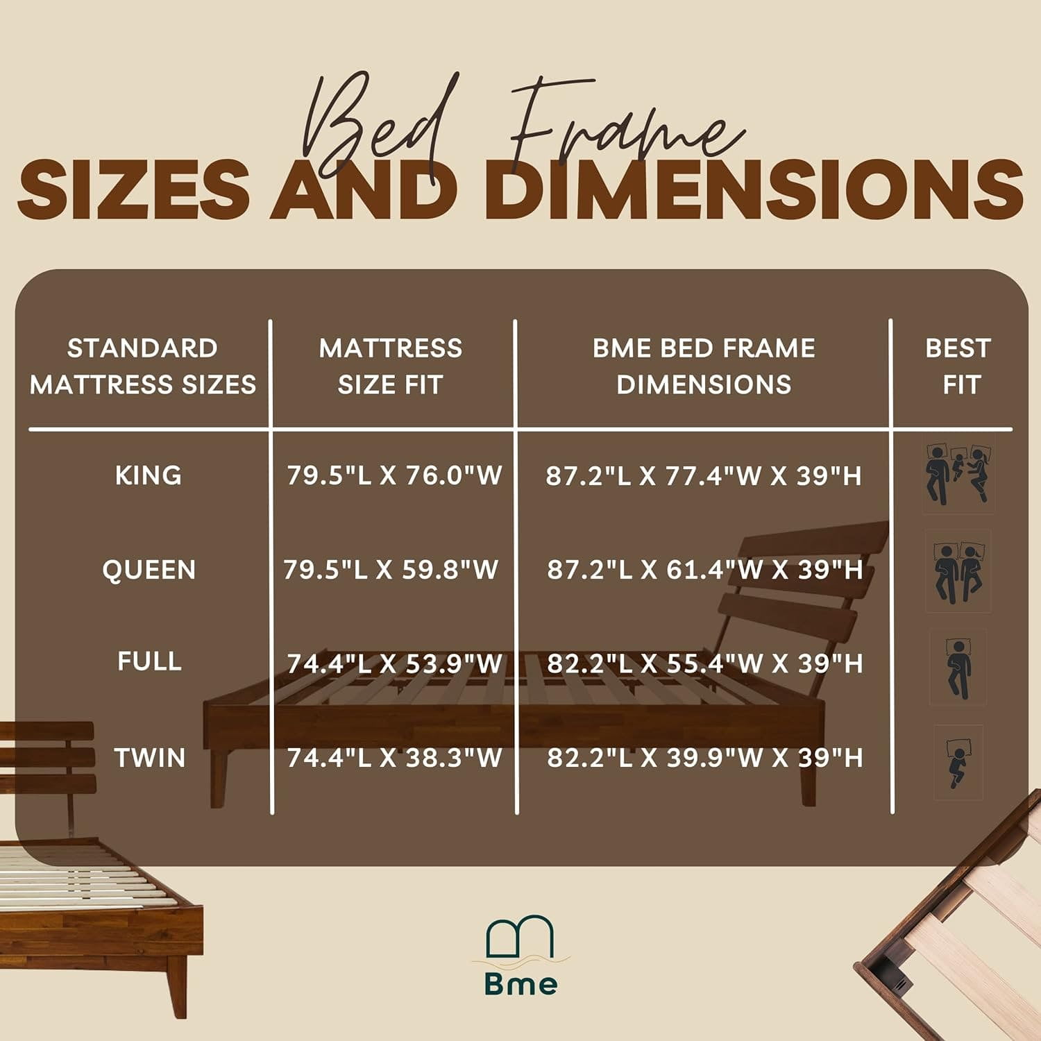 BME PRODUCT SELLING POINT Fully Solid Acacia Wood: For a long-lasting period, all BME beds are made from solid to provide absolutely high-quality products and gorgeous designs. Sturdy and Stable Structure: Crafted entirely from solid wood, this bed ensures a quiet, squeak-free experience while delivering exceptional stability and enduring durability. Easy to Assemble: In under 45-minute assemble with two people’s effort. You can find every detail information in the three videos below. Trendy Style: At BME Home, our diverse range of designs readily meets the stylistic preferences of any bedroom. High Profile Bed Frame: No Box Spring Needed and Easy to Storage or Clean Smartly Packed: All parts, tools, and instructions are shipped straight to your door in one efficiently packed box. One-year Warranty and 30-day Return: Worry-free with 24/7 service team. SOME ASSEMBLY NOTES: Should have two people assembling. Gloves are recommended during the process. Suggest having a drilling tool to assist with the setup. BME SOLID WOOD INDOOR COLLECTION Bme Home is dedicated to providing high-quality solid wood furniture at affordable prices. We partner with Vietnamese factories and prioritize customer satisfaction to ensure long-lasting quality. Our product range spans from bedroom to living room collections, making it effortless for you to achieve a cohesive indoor style without the need for extensive research.