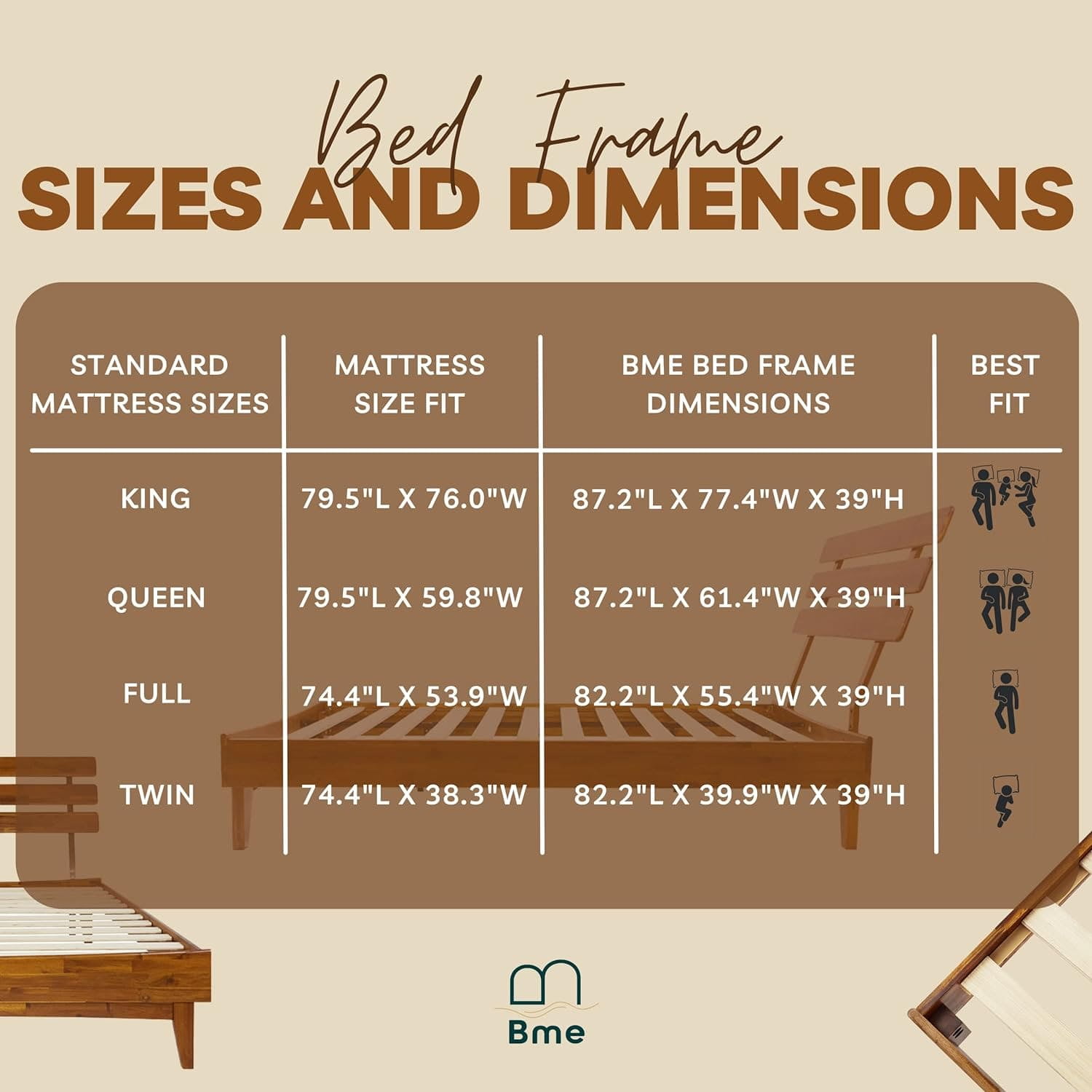 BME PRODUCT SELLING POINT Fully Solid Acacia Wood: For a long-lasting period, all BME beds are made from solid to provide absolutely high-quality products and gorgeous designs. Sturdy and Stable Structure: Crafted entirely from solid wood, this bed ensures a quiet, squeak-free experience while delivering exceptional stability and enduring durability. Easy to Assemble: In under 45-minute assemble with two people’s effort. You can find every detail information in the three videos below. Trendy Style: At BME Home, our diverse range of designs readily meets the stylistic preferences of any bedroom. High Profile Bed Frame: No Box Spring Needed and Easy to Storage or Clean Smartly Packed: All parts, tools, and instructions are shipped straight to your door in one efficiently packed box. One-year Warranty and 30-day Return: Worry-free with 24/7 service team. SOME ASSEMBLY NOTES: Should have two people assembling. Gloves are recommended during the process. Suggest having a drilling tool to assist with the setup. BME SOLID WOOD INDOOR COLLECTION Bme Home is dedicated to providing high-quality solid wood furniture at affordable prices. We partner with Vietnamese factories and prioritize customer satisfaction to ensure long-lasting quality. Our product range spans from bedroom to living room collections, making it effortless for you to achieve a cohesive indoor style without the need for extensive research.