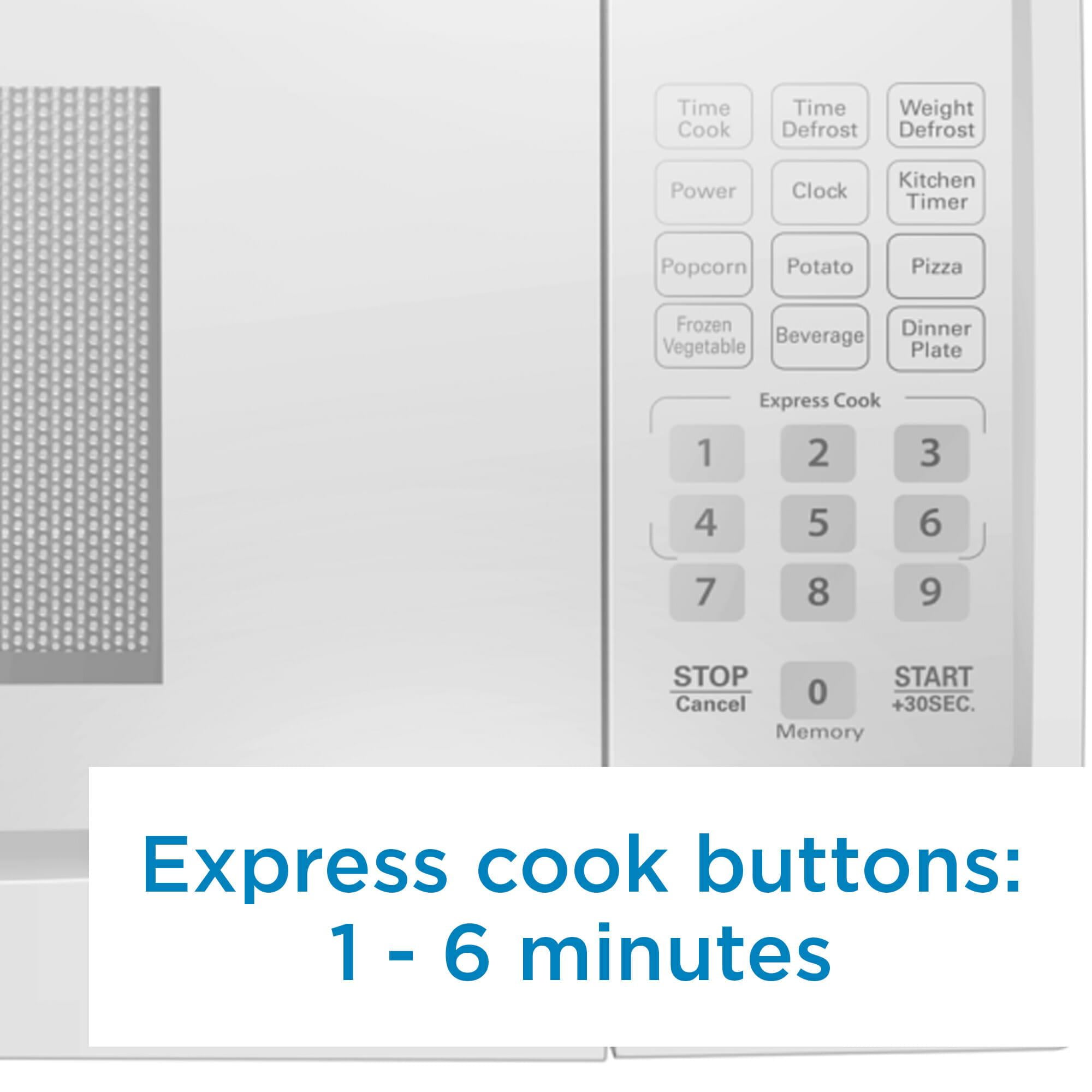 Powerful 1.1 cubic feet capacity with 1000 watts and 10 power levels for cooking Features 6 convenient 1-touch cook options for popcorn, potatoes, pizza, beverages, dinner plates, and reheat Auto defrost options allow you to choose to defrost based on time or weight Use express cook buttons for speedy heating; 1 to 6 minutes, plus add 30 seconds button Keep unwanted small hands away with child control lock-out option; click STOP for 3 seconds Internal glass turntable measures 12.4 inches Cord measures 41 inches for multiple plug-in options Capacity: 1.1 cubic feet Voltage: 120 volts Wattage: 1000 watts Color: White Dimensions [W x H x D]: 20.19 x 12.06 x 15.75 inches Weight: 36.38 pounds Powerful 1.1 cubic feet capacity with 1000 watts and 10 power levels for cooking Features 6 convenient 1-touch cook options for popcorn, potatoes, pizza, beverages, dinner plates, and reheat Auto defrost options allow you to choose to defrost based on time or weight Use express cook buttons for speedy heating; 1 to 6 minutes, plus add 30 seconds button Keep unwanted small hands away with child control lock-out option; click STOP for 3 seconds Internal glass turntable measures 12.4 inches Cord measures 41 inches for multiple plug-in options Capacity: 1.1 cubic feet Voltage: 120 volts Wattage: 1000 watts Color: White Dimensions (W x H x D): 20.19 x 12.06 x 15.75 inches Weight: 36.38 pounds