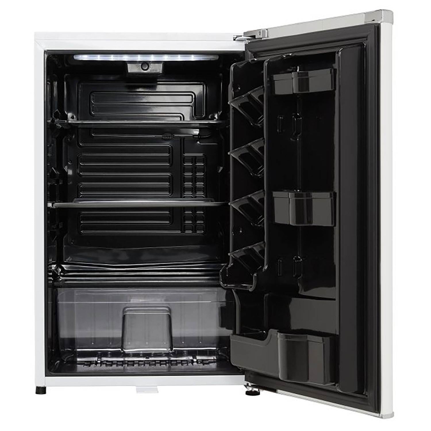 Ideal for apartment, rec room, bar, office, dorm, cabin, and more Energy Star compliant to keep electricity costs low Reversible door so you can open it to the left or right Environmentally friendly R600a refrigerant Metallic door and chassis finish Integrated door shelving with tall bottle storage Vegetable crisper and cover Chrome tinted glass shelves Interior white LED light CanStor beverage dispensing system Door lock 4.4 cubic feet total capacity Color: White Dimensions: 21.30 x 20.75 x 33.07 inches Manufacturer warranty: 12-month warrantys parts and labor warranty Scratch resistant chrome worktop