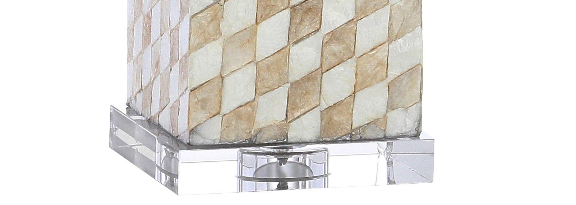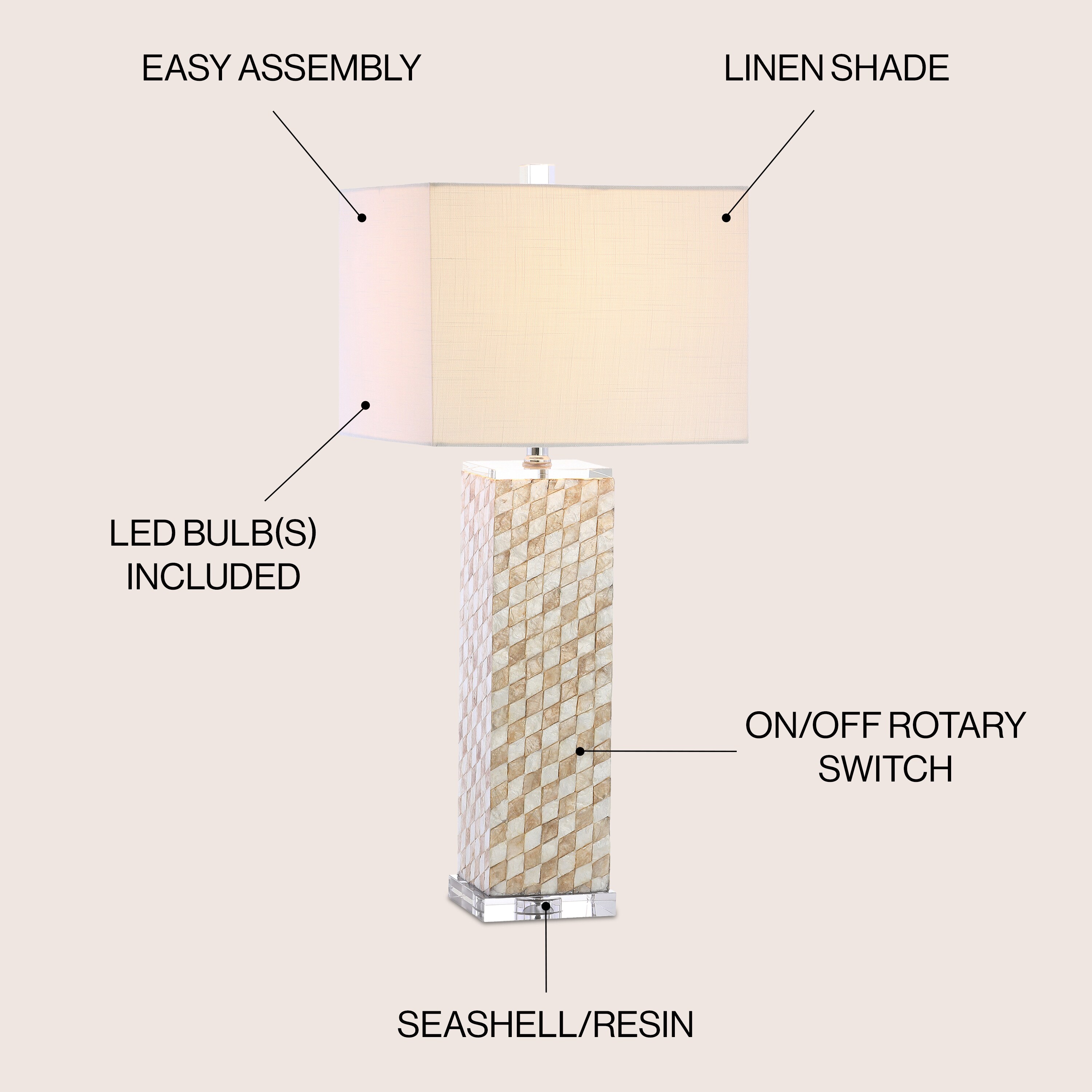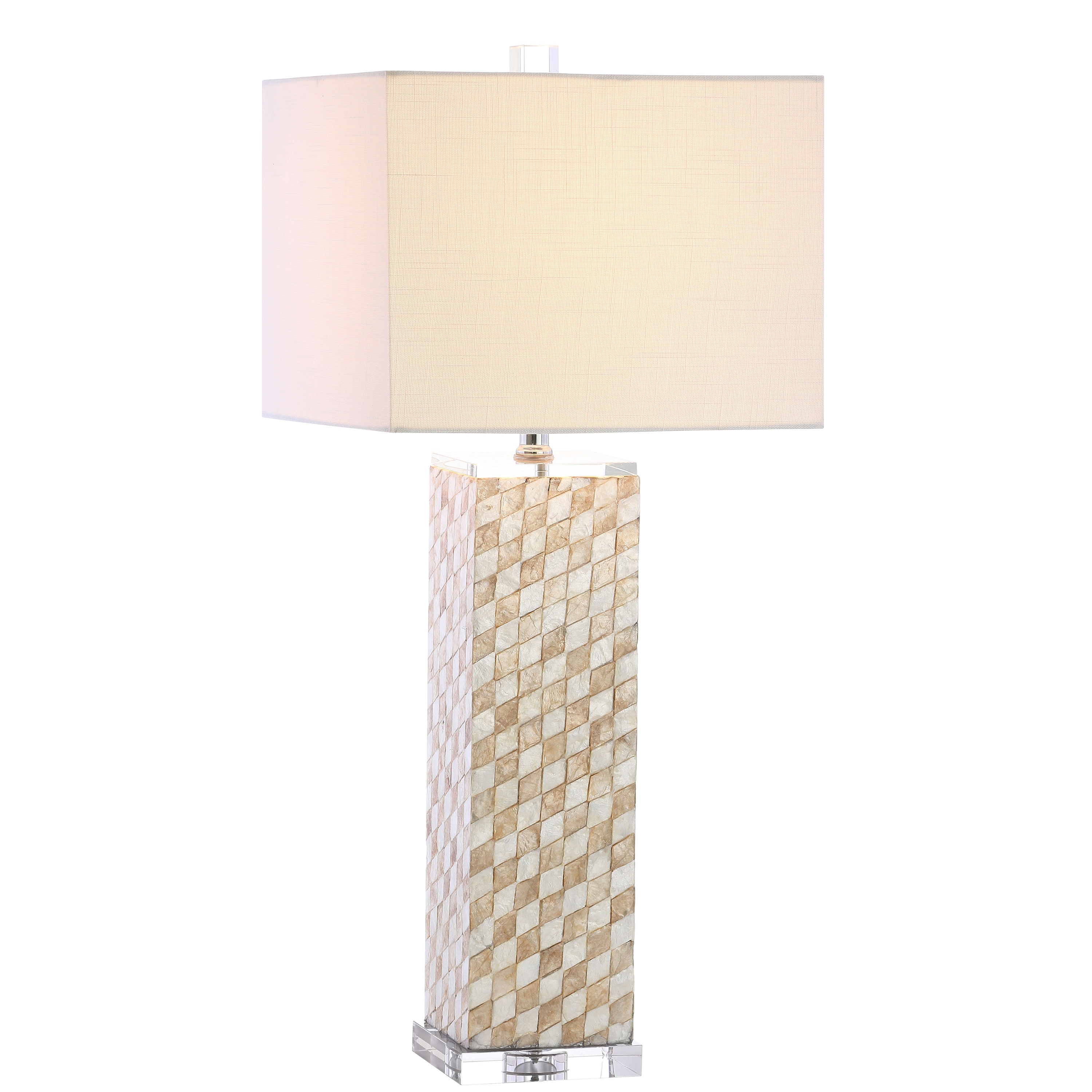 Resin and the iridescent interiors of natural seashells come together to create a harlequin mosaic on the base of this beautiful table lamp. The mother of pearl finish delivers a distinct personality to the design of this otherwise classic silhouette, while a linen hardback shade completes the look. In shades of champagne, cream, and ivory, the neutral shimmer of the design glows when illuminated by the light above -which is compatible with LED, incandescent, or CFL bulb options.