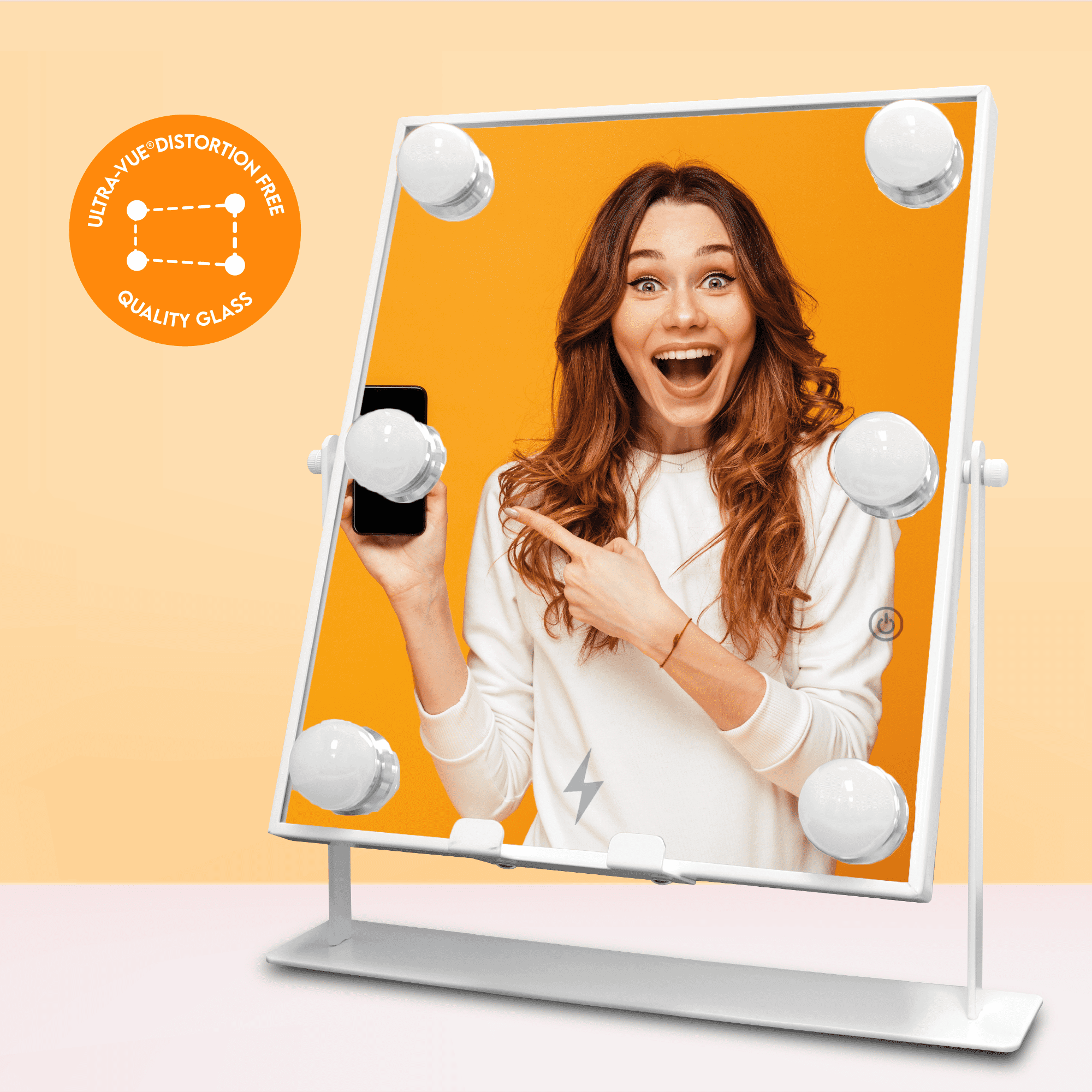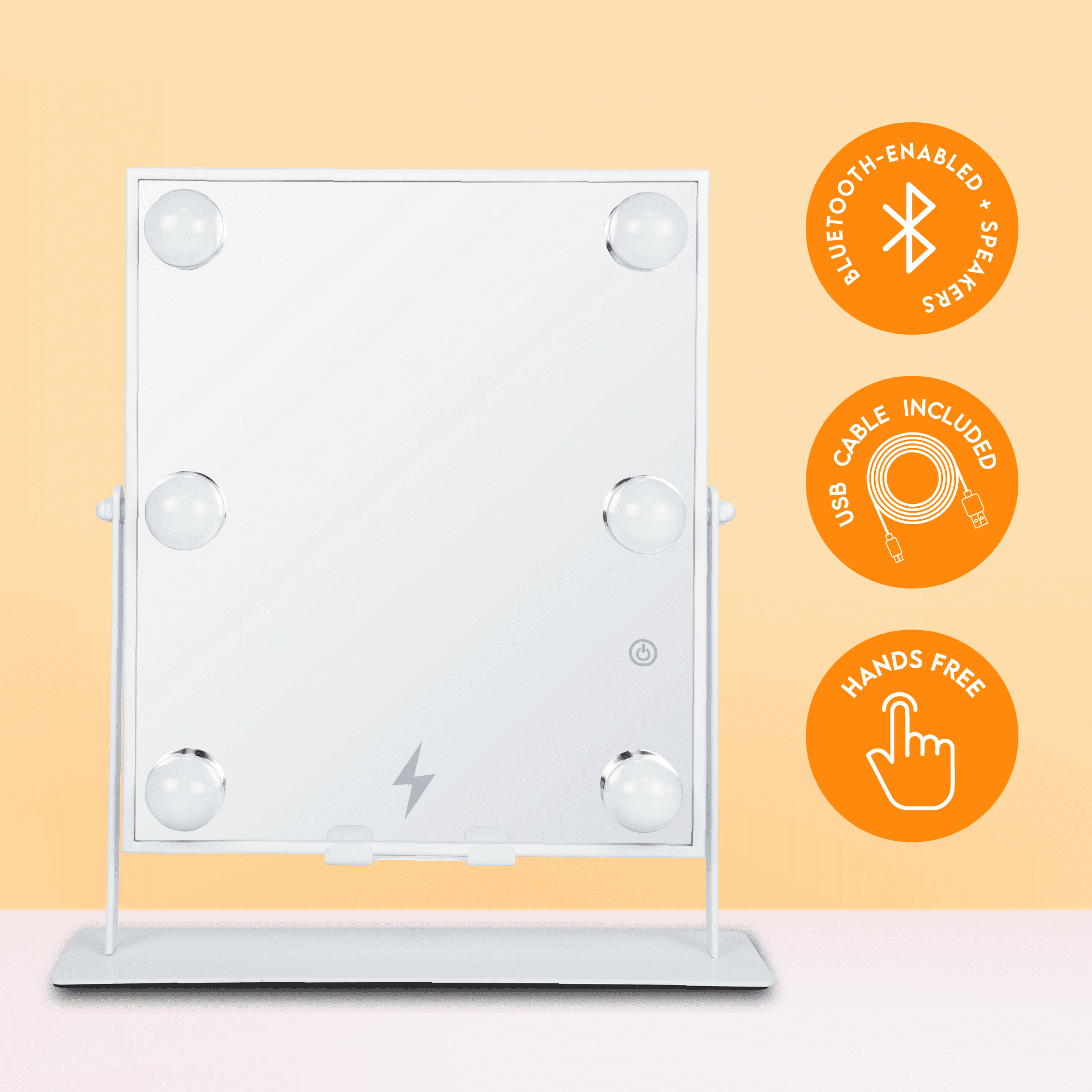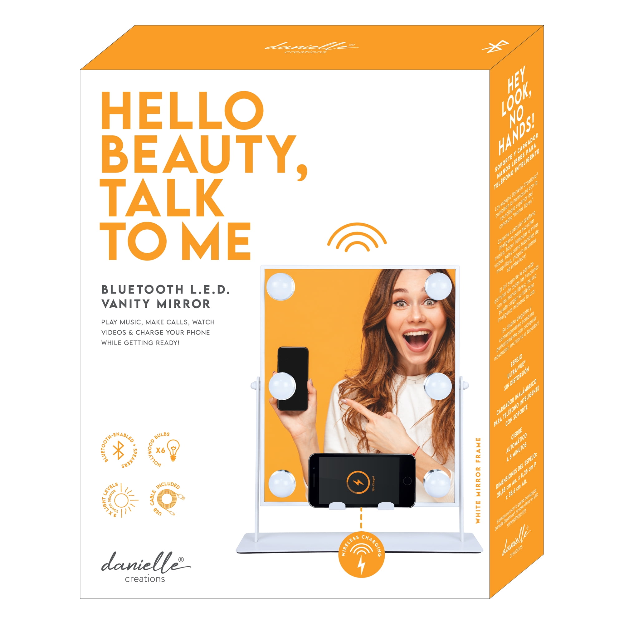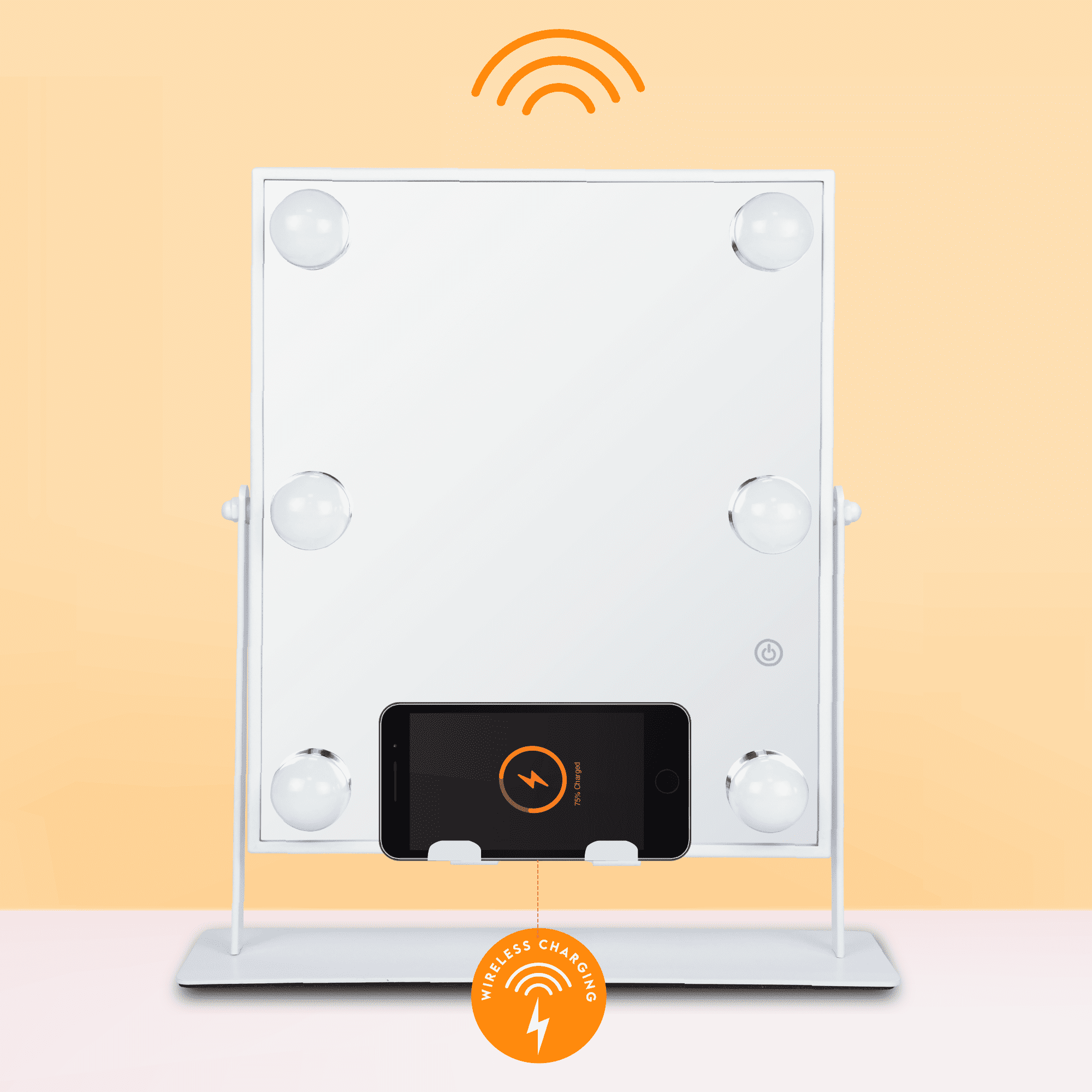 High Quality Ultra-Vue® Distortion-Free Glass Smartphone wireless charger with stand Bluetooth® Connectivity Built-in speakers to listen to music while applying makeup 5-minute auto shut-off 3 Light Levels Versatile white color finish matches any décor!