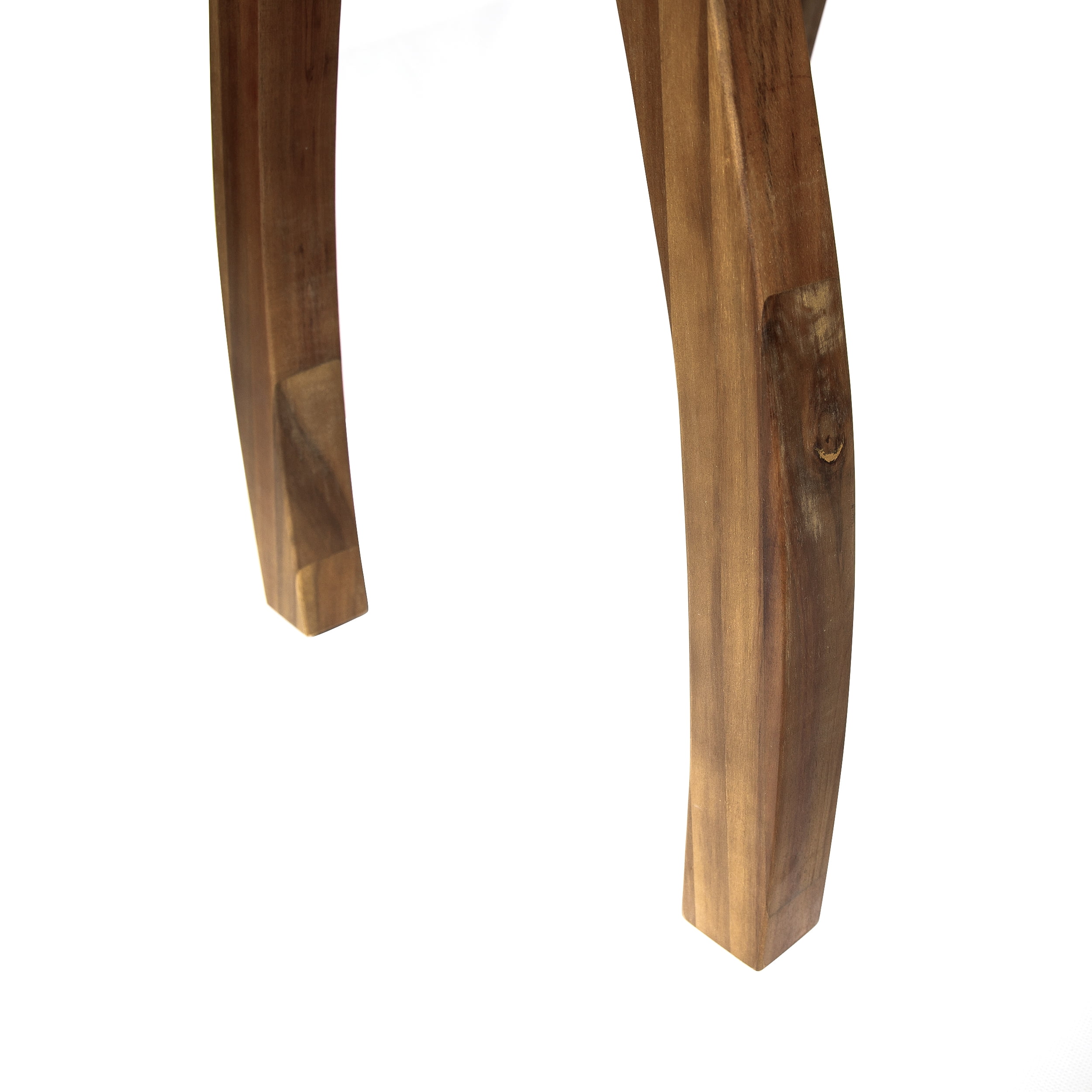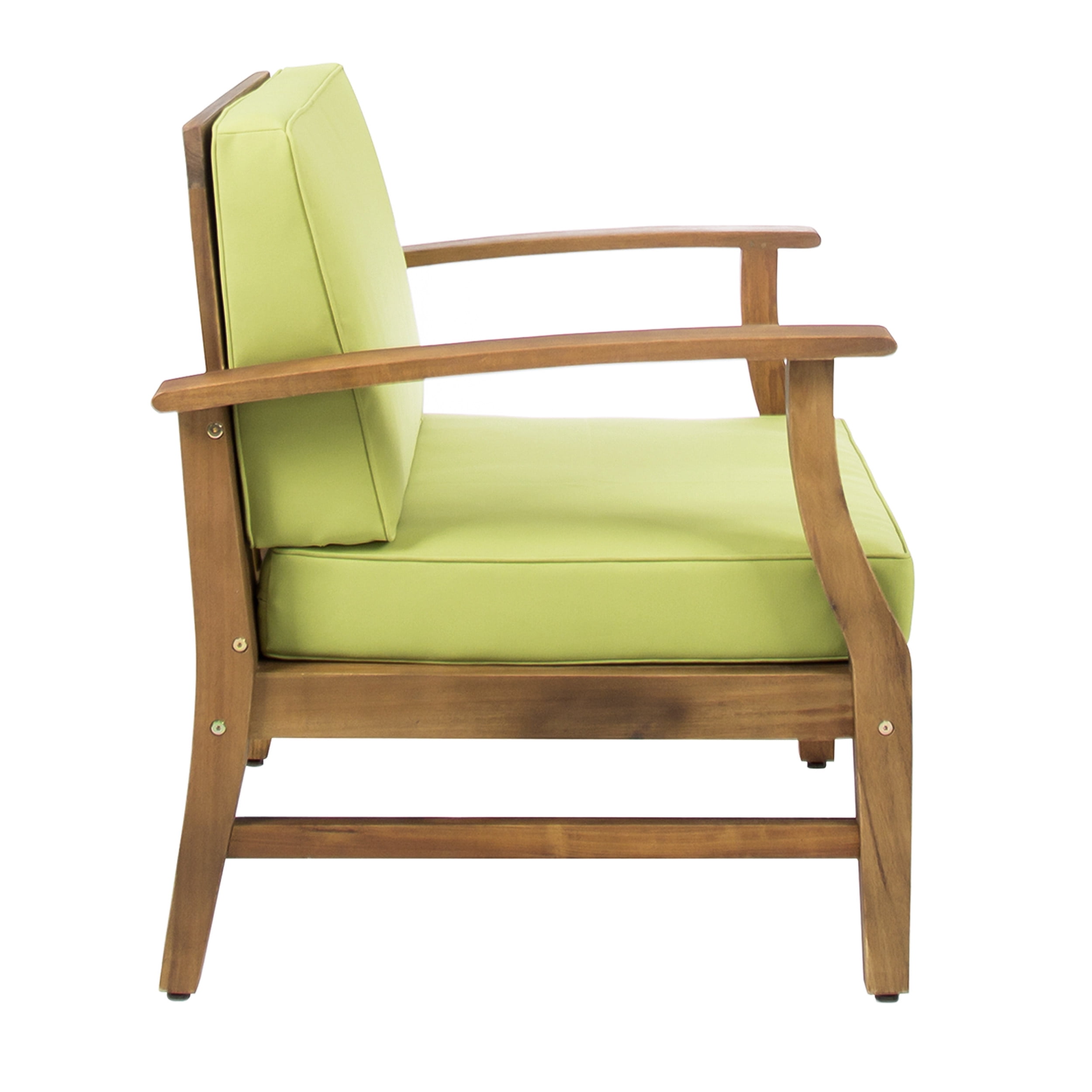 Includes: Two (2) Club Chairs and One (1) Side Table Material: Acacia Wood Cushion Material: Water Resistant Fabric Composition: 100% Polyester Finish: Teak Cushion Color: Green Hand-Crafted Details Assembly Required Chair Dimensions: 28.25 inches deep x 28.00 inches wide x 32.75 inches high Seat Dimensions: 24.25 inches deep x 23.50 inches wide x 12.50 inches high Arm Height: 25.50 inches Table Dimensions: 19.00 inches deep x 15.00 inches wide x 19.25 inches high