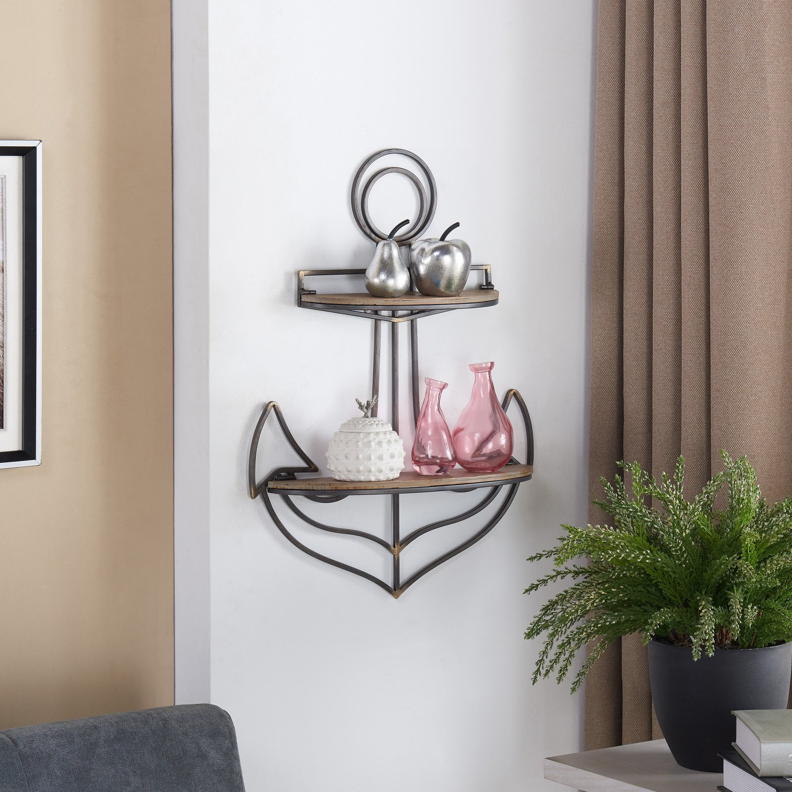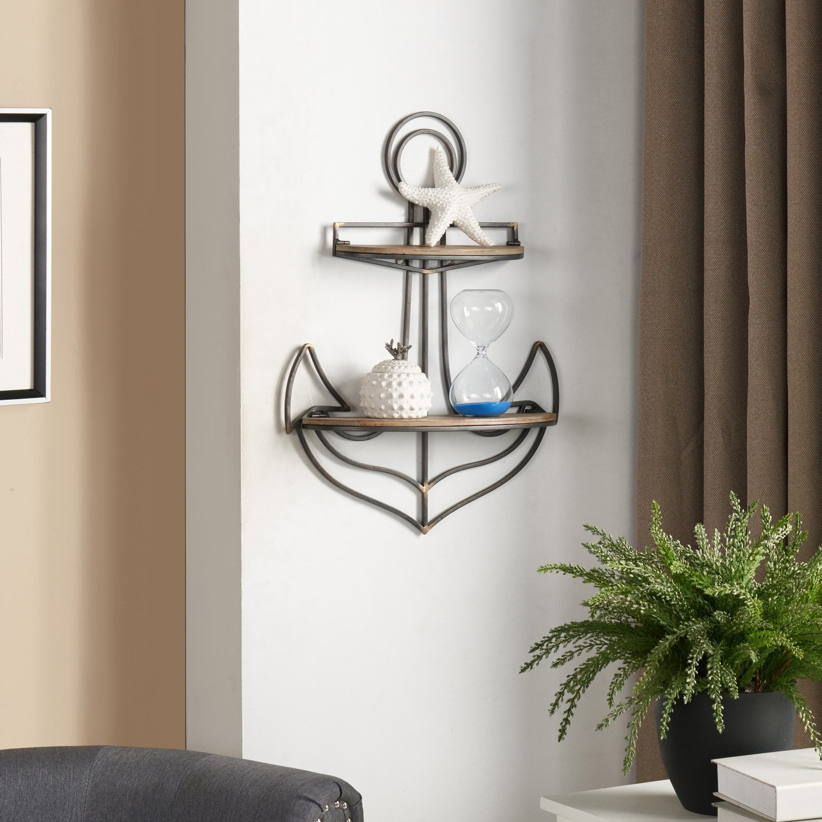 This Nautical-themed shelf will have your wall looking extra shipshape! The sturdy anchor design, adds a whimsical bit of maritime appeal and offers two tiers of storage. Keep your knick-knacks, trinkets, and other cherished items safe and secure on the high seas! Bring the perfect nautical rustic twist to your home with this Danya B. Anchor Wall Shelf. The sturdy metal frame is elegantly complimented by the reclaimed wood shelving. From living room to bedroom or entryway the seaside coastal style of this nautical shelf will turn any wall into a functional display space. Hang it near the front door to hold your keys or in the kitchen to use as a beautiful spice rack. The Danya B. Anchor Wall Shelf brings just the right amount of beach chic to any styled décor. It boasts durable construction—so you won’t be shipwrecked anytime soon—while its unique style adds a subtle hint of Old Salt charm to your walls. Store your keepsakes, show off your latest seaside haul, or just use it to keep your keys organized! With the Danya B. Anchor Wall Shelf, you’ll be all set for smooth sailing in any room of your home.