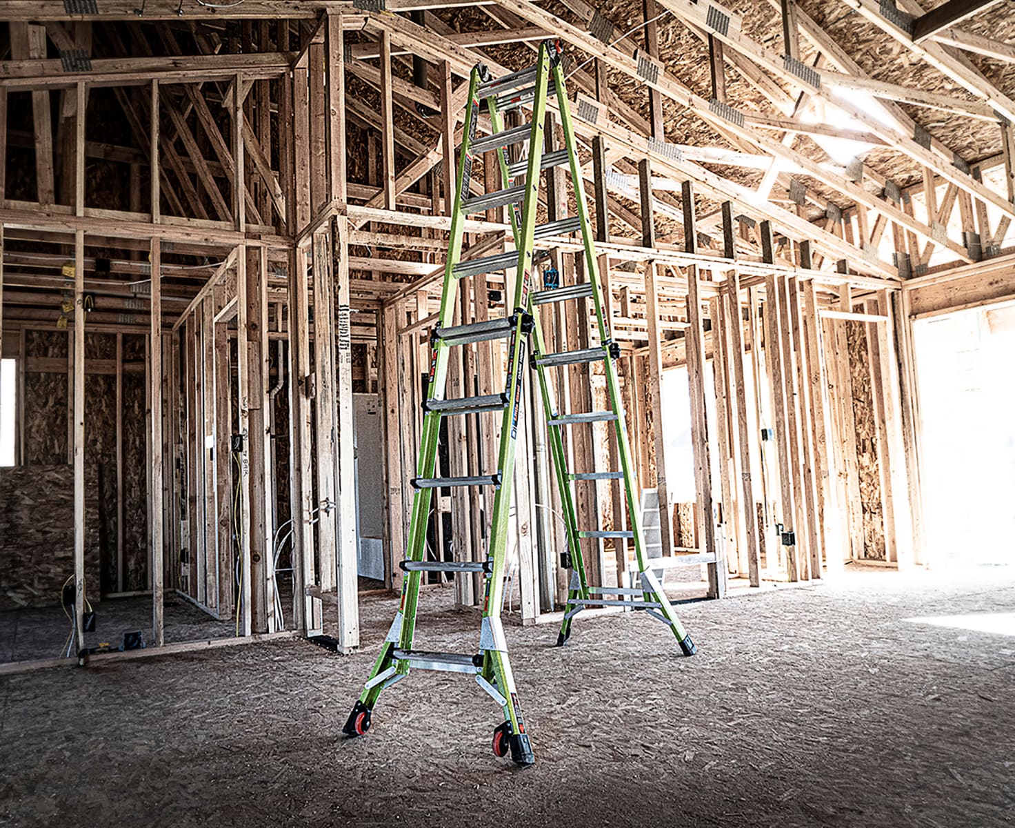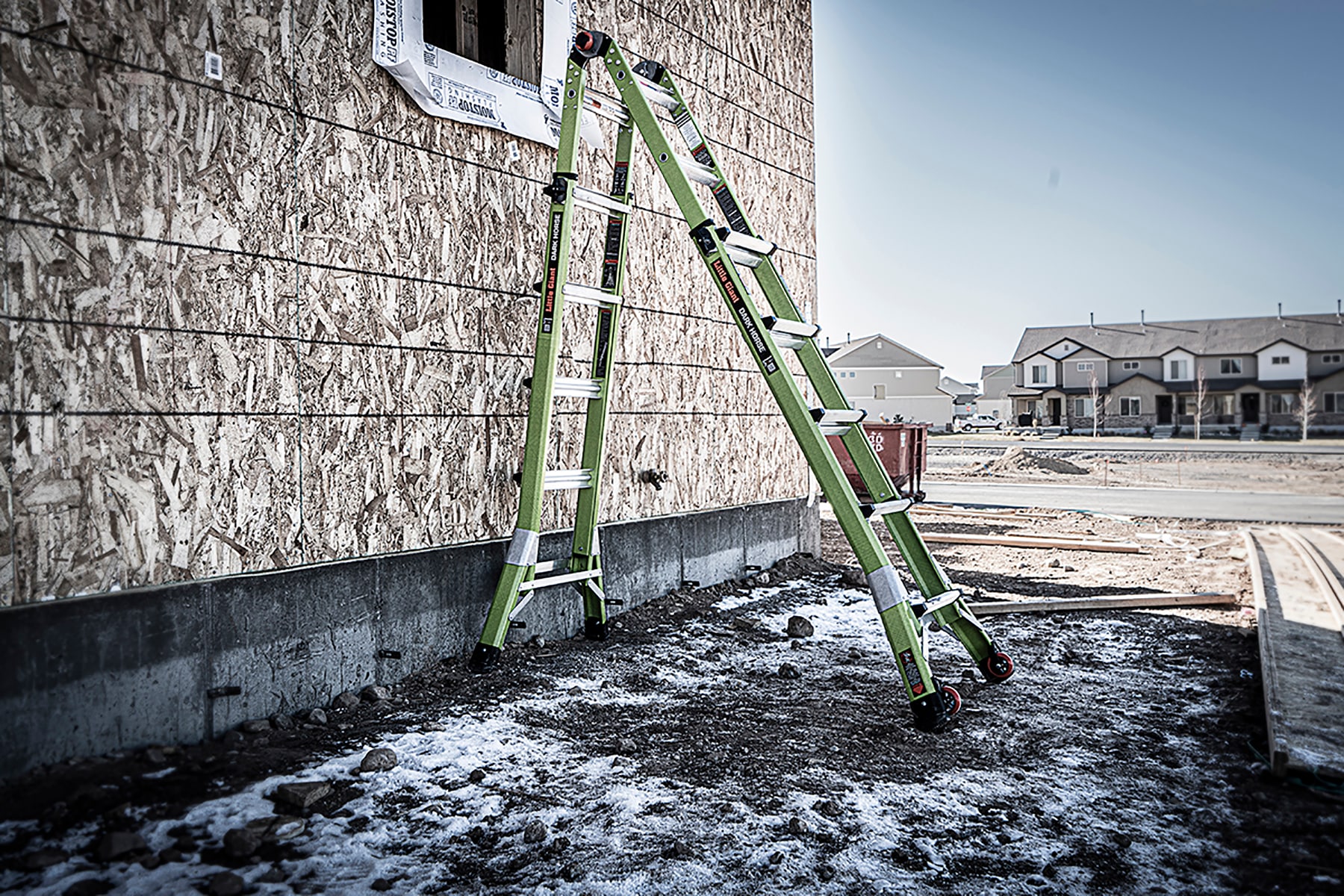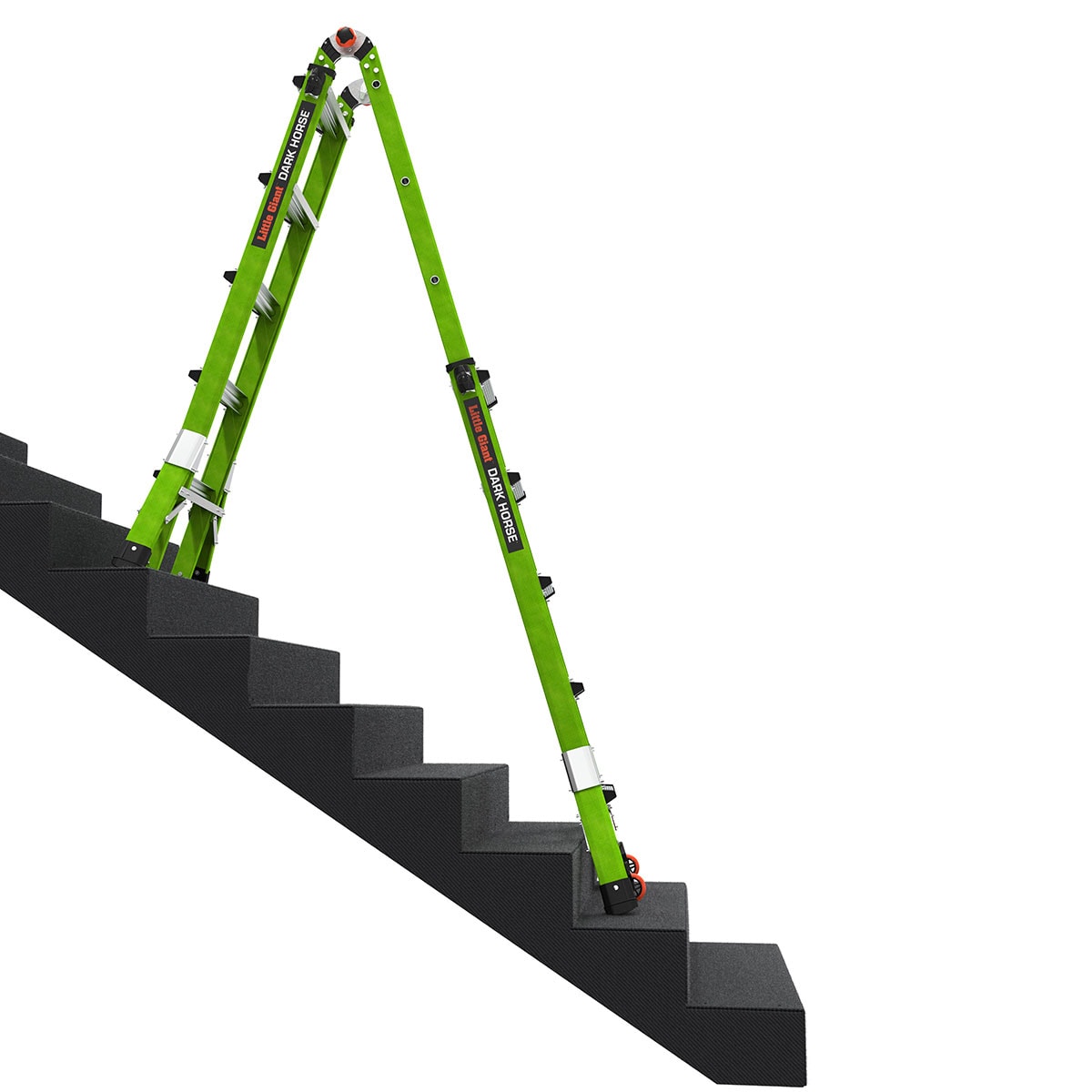 The Little Giant® Dark Horse™ combines some of our best ladder features into one versatile, multi-position ladder that will suit your ladder needs for years to come. This multi-position ladder accomplishes multiple tasks with just one ladder. Set up the Dark Horse in stepladder, extension, 90-degree, staircase and trestle-and-plank positions, for an easy climbing experience. Made from durable, non-conductive fiberglass, this ladder is ideal for most jobs, especially ones working around electricity. The Dark Horse is made with Little Giant’s iconic Hi-Viz green fiberglass, a safety-promoting color that increases its visibility for others, keeping you safer while in use. The ladder’s wide-flared base increases side-tip stability to prevent falls from accidental overreaching. Meeting or exceeding all OSHA and ANSI standards, the Dark Horse is rated Type IA to hold 300 lbs.