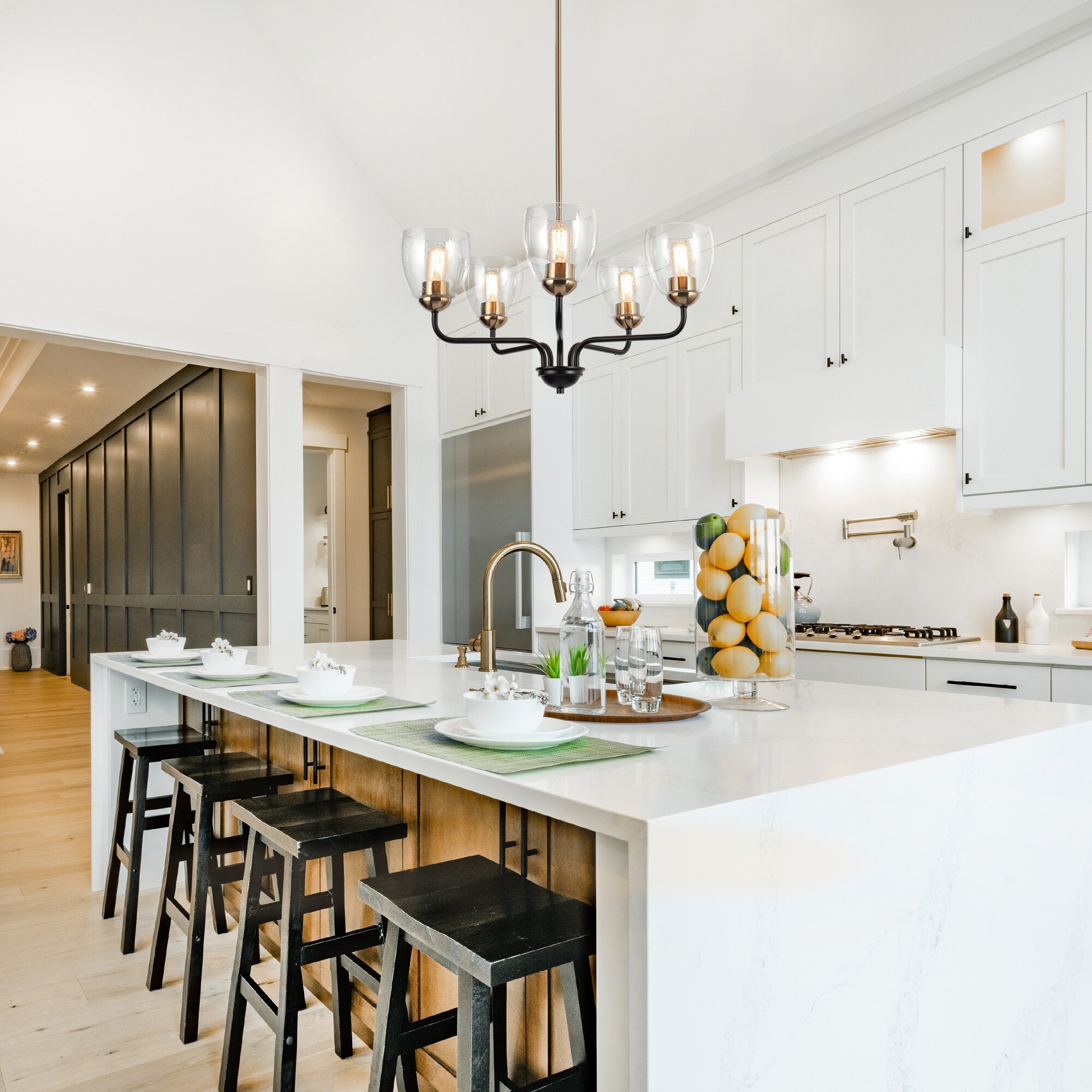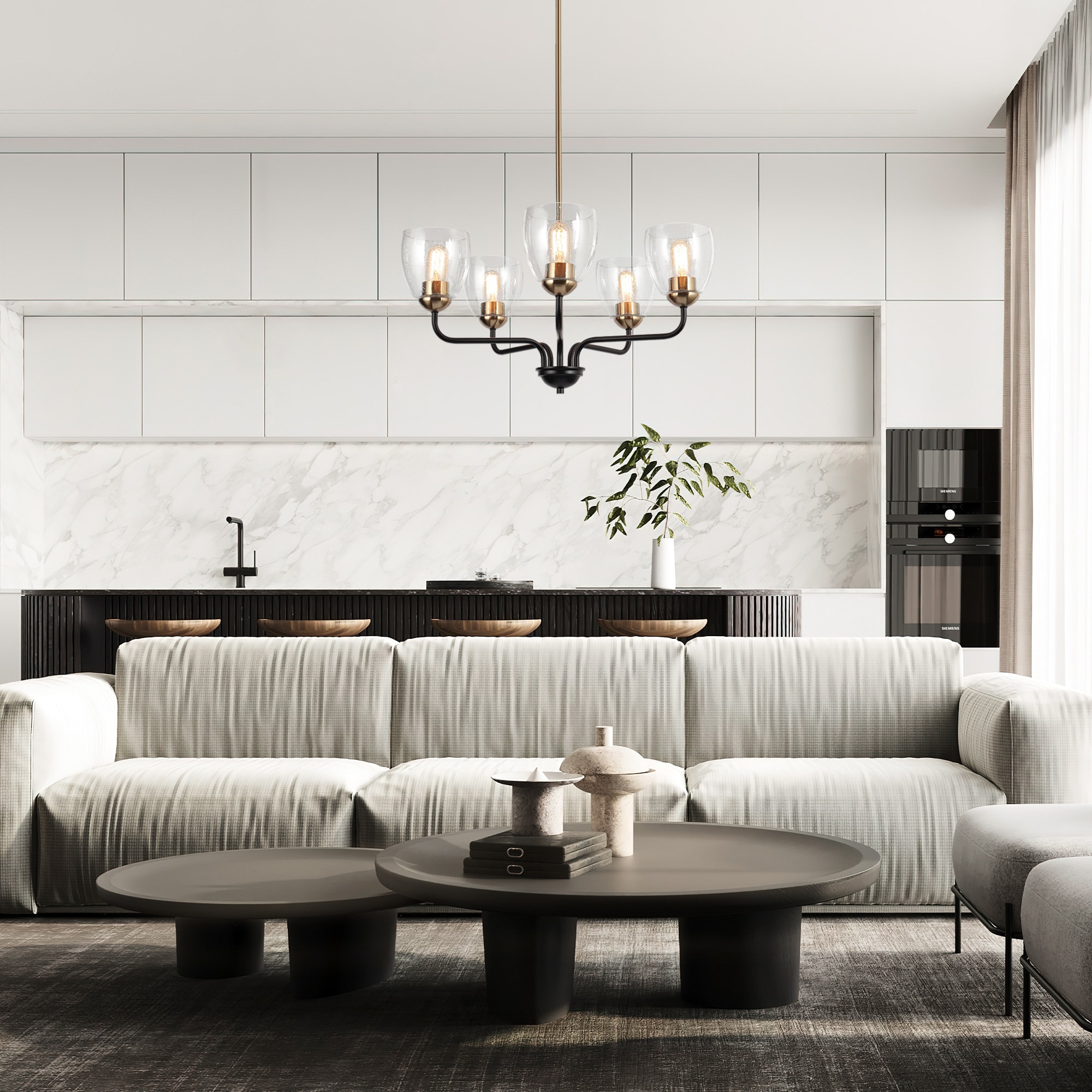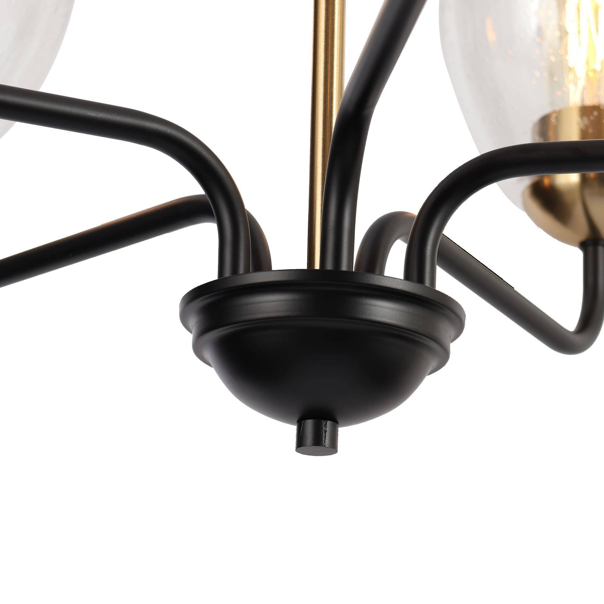 Based on a classic French design, this light fixture is contemporary and sleek. The elegant plated brass and black finish complements the seeded glass shades. Suit to high or low ceilings, its wide circular shape harks back to the 1940s.