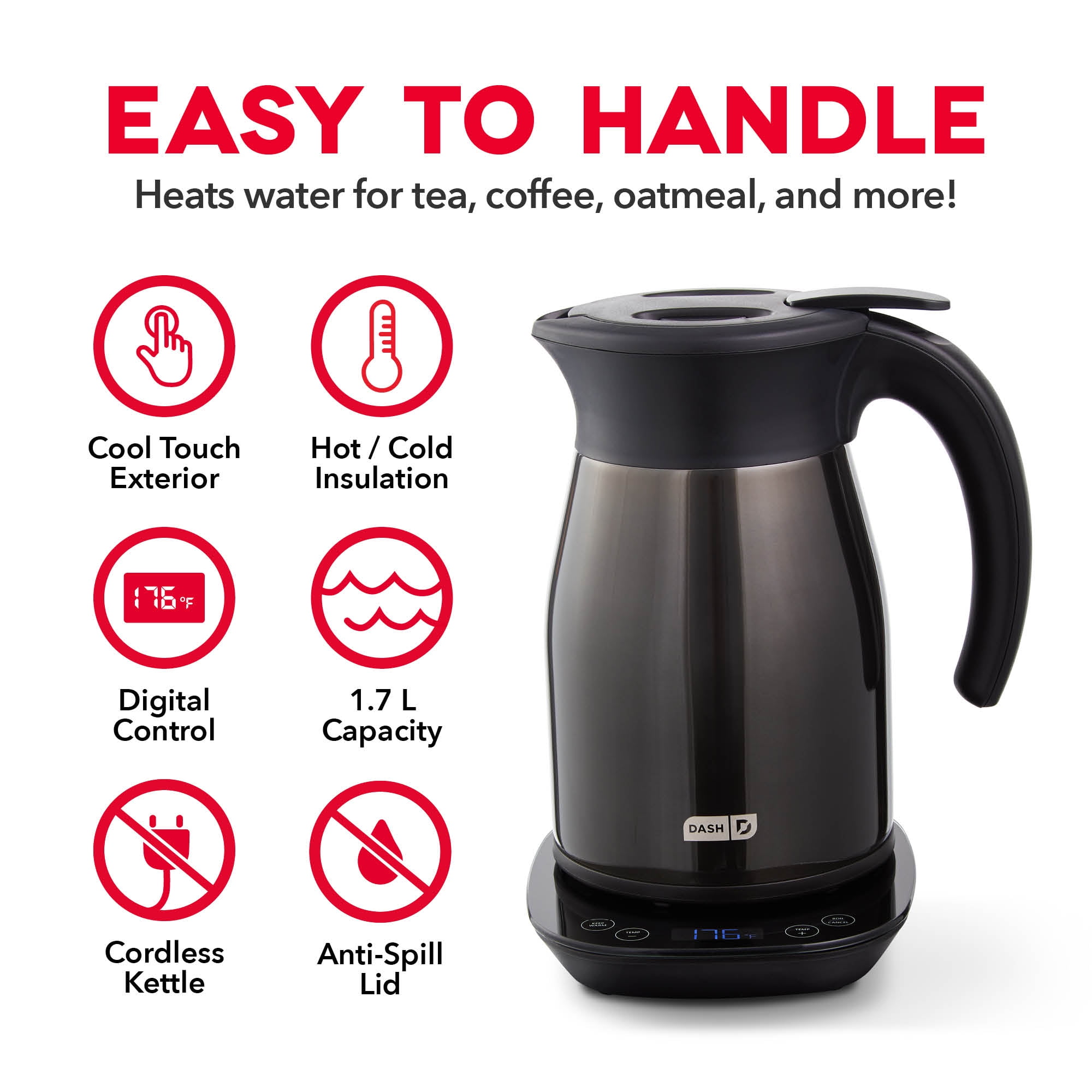 Dash Insulated Electric Kettle The Dash Insulated Kettle has a 1.7L capacity, cool-touch housing, and holds heat for hours! Vacuum-insulated dual stainless steel walls ensure the contents hold their temperature for up to 8 hours, perfect for preparing drinks ahead of time. Cool-touch housing: Kettle’s exterior stays cool no matter how hot the contents for added safety! The built-in temperature probe allows you to read the exact temperature inside the Kettle on the Digital Display. Boil water with just the touch of a button! Simply press Boil and Kettle heats to max temperature automatically. Keep warm allows you to maintain a specific temperature while on the Base. Lever-controlled anti-spill lid with non-drip spout. Base includes Digital Display that switches between Celsius and Fahrenheit, and convenient cord storage beneath. Adjustable temperature from 104°F/40°C up to 212°F/100°C Print on the base includes easy-to-reference ideal temperatures for all your favorite teas and hot beverages. Includes: Dash Insulated Kettle 1-year manufacturer warranty, 2-year warranty available with registration to the Feel Good Rewards program. Designed in NYC. US-Based Customer Support available. 1500 Watts DETK300