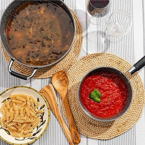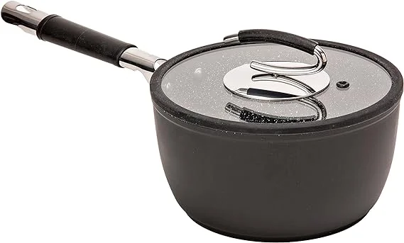 DaTerra Cucina Ceramic Coated Nonstick Induction Compatible Sauce Pan, 2.6 Quart | Heat Resistant Silicone Handle | Durable, High Heat Aluminum Base with No PTFE, PFOA, Lead | Oven Safe | Made In Italy Made In Italy induction friendly: Professional-grade, ceramic-coated saucepan ensures even heat distribution, reduced need for oil & scratch-resistant durability. Thick 3.7mm aluminum base heats quickly. Safe, Eco-Friendly Materials: We use only PTFE-free, cadmium-free, and lead-free coatings. No worries about harmful leaching from your cookware into your food. Aluminum is also 100% recyclable. Oven-Safe Design: Heat-resistant materials are oven-safe up to 450° F. Cook soups, stews, make candy, or even reheat leftovers! Superior European Quality & Italian Design: Enjoy the cool-touch silicone handle. 1-Year Warranty: If you experience any difficulty with your ceramic nonstick sauce pan, you can return it at any point within the first 365 days for your money back.