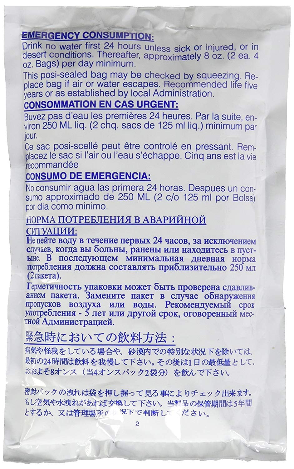 Emergency purified water for immediate use; lightweight and extremely compact(2 x 64)-125 ml sachets Loss potential minimized due to individual sachets and ideal for storage Easy to dispense from a premeasured sachet; superior packaging materials for optimum durability in your survival kit.