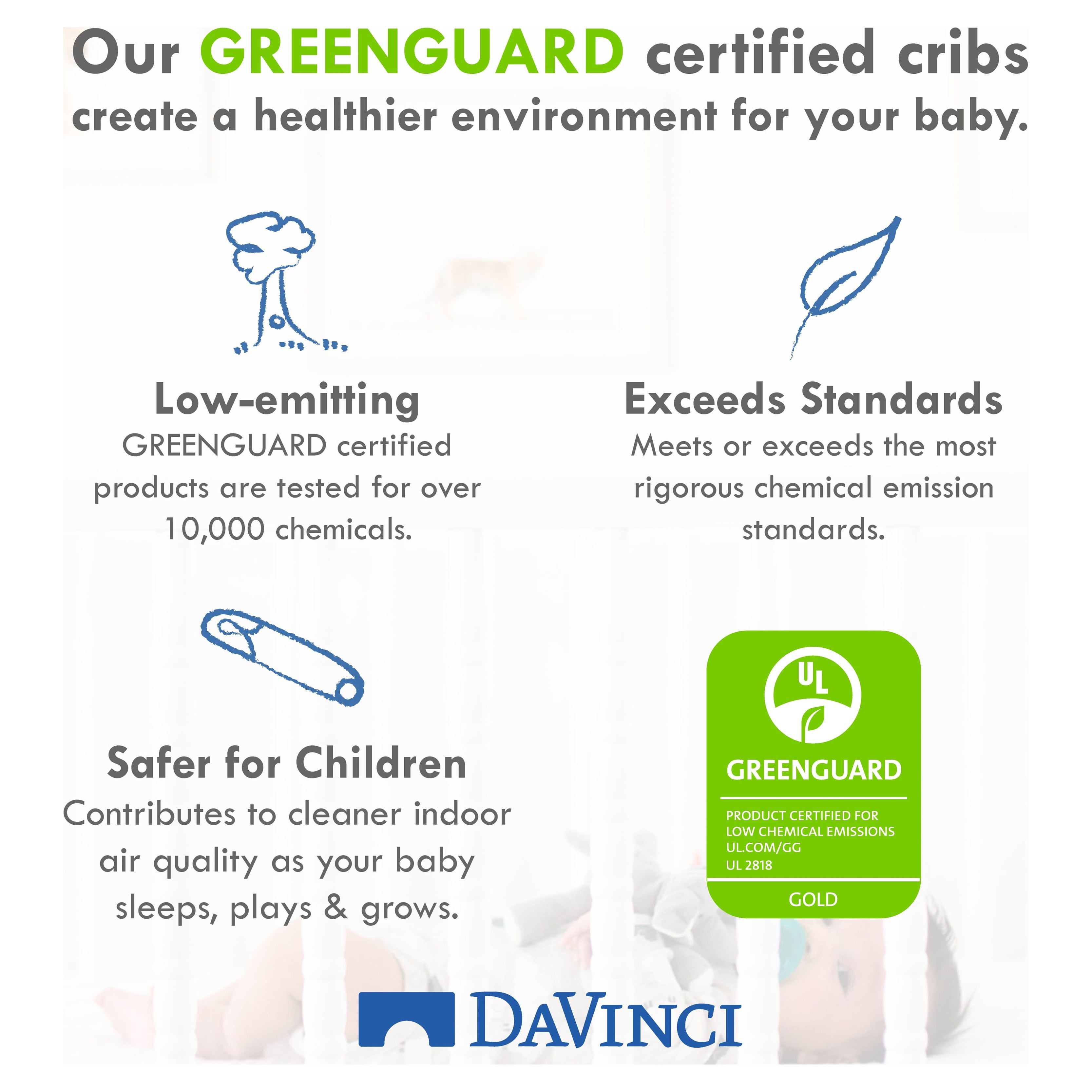 GREENGUARD GOLD CERTIFIED: This product has been tested for over 10,000 chemical emissions and VOCs, undergoing rigorous scientific testing to meet some of the world’s most stringent chemical emissions requirements. It contributes to cleaner indoor air, creating a healthier environment for your baby to sleep, play, and grow 4-in-1 CONVERTIBILITY: Designed to save you the hassle (and extra money!) of buying multiple beds as your little one grows. Easily converts to a toddler bed, daybed, and full-size bed (toddler kit #M3099 and full-size kit #M4799 sold separately) GROWS WITH BABY: 4 adjustable mattress positions that you can lower as your baby begins to sit and stand. We’ve built this crib to withstand even the most active babies and toddlers and last through your child’s teen years QUALITY MATERIAL: Made of 100% solid sustainable New Zealand pine wood -only the best for your sweet baby FOR YOUR BABY’S SAFETY: Say goodbye to toxic chemicals! Finished in a non-toxic multi-step painting process and lead and phthalate safe. Rest assured knowing it exceeds ASTM International and U.S. CPSC safety standards MATTRESS COMPATIBILITY: While this crib is a standard size regular crib, for a best fit we recommend DaVinci’s line of non-toxic, GREENGUARD gold, waterproof mattresses COMPLETE THE LOOK: Shop Kalani 3-Drawer Dresser & 6-Drawer Dresser for a coordinated nursery