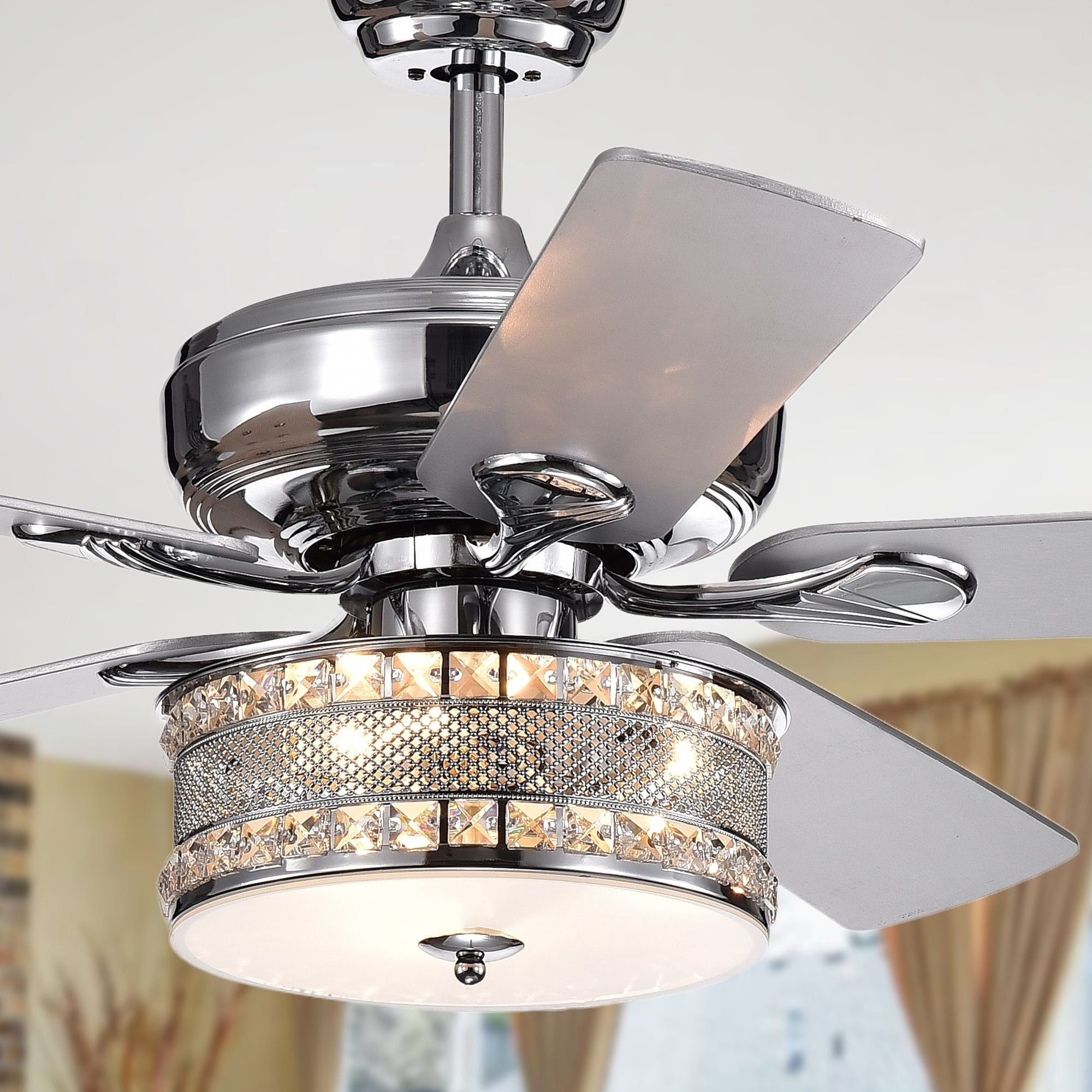 Give your home a modern vibe with this Davrin ceiling fan. The chrome frame and crystal drum shade provide elegant beauty, while the five silver-colored wood blades are reversible for convenient versatility. This UL-certified fan has a three-speed motor for increased control. Lamp Type: Chrome and Crystal Drum Materials: Crystal, Metal, Wood Number Lights: Three (3) Lights Bulbs: (3) E12 60W (not included) Color: Chrome Switch Options: Pull Chain OR Remote Controlled The wood blades: 5 Blades Reversible Blade Faces Voltage: 110-120V 60Hz UL Certified 182 RPM (Level 1) 5460 CFM 124 RPM (Level 2) 3100 CFM 71 RPM (Level 3) 710 CFM Note: This product requires a Professionally Licensed Electrician for installation.