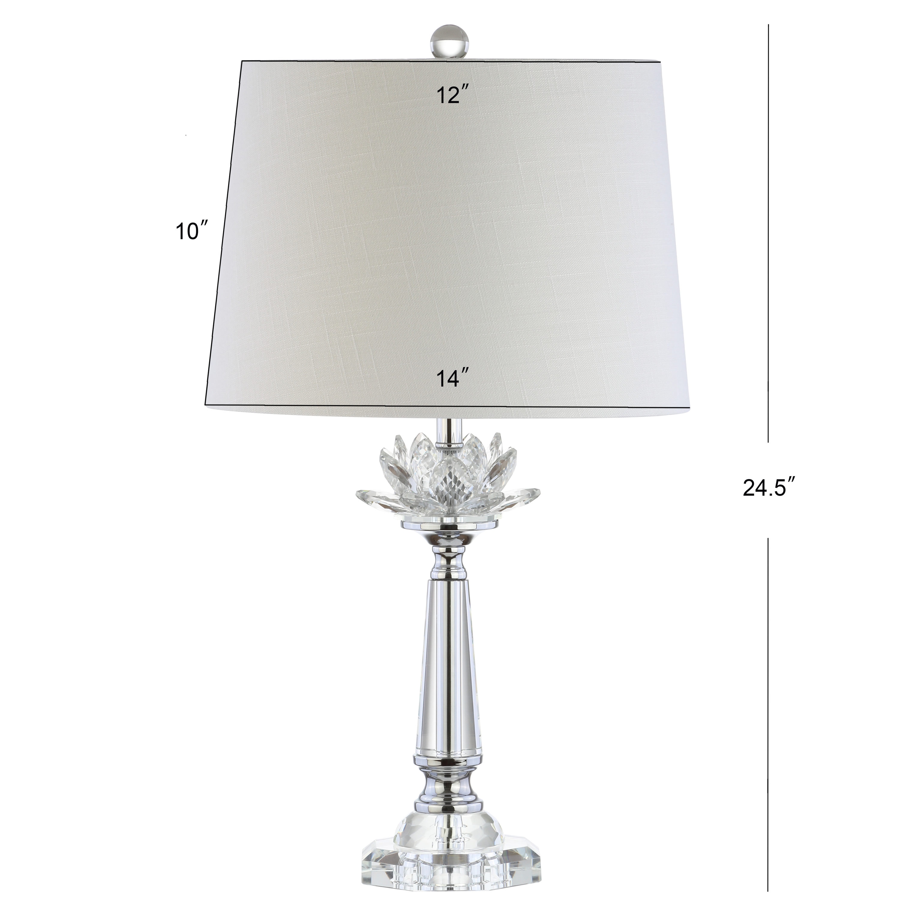 A classic crystal candlestick base stems into a glamorous cluster of faceted crystals before culminating in a slightly taped cotton shade in this luxe table lamp from Jonathan Y. Featuring a silk-wrapped cord and topped with a crystal clear finial, this lamp boats classic style with updated finishes. With chrome-plated components and an included replaceable LED bulb, you can rely on this lamp for years to come.